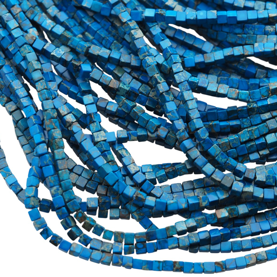 Jaspis cesarski niebieski w formie drobnych kostek wyróżnia się chłodnym, eleganckim odcieniem niebieskiego. Geometryczny kształt daje uporządkowany, nowoczesny efekt i pięknie układa się w równych, rytmicznych sekwencjach.