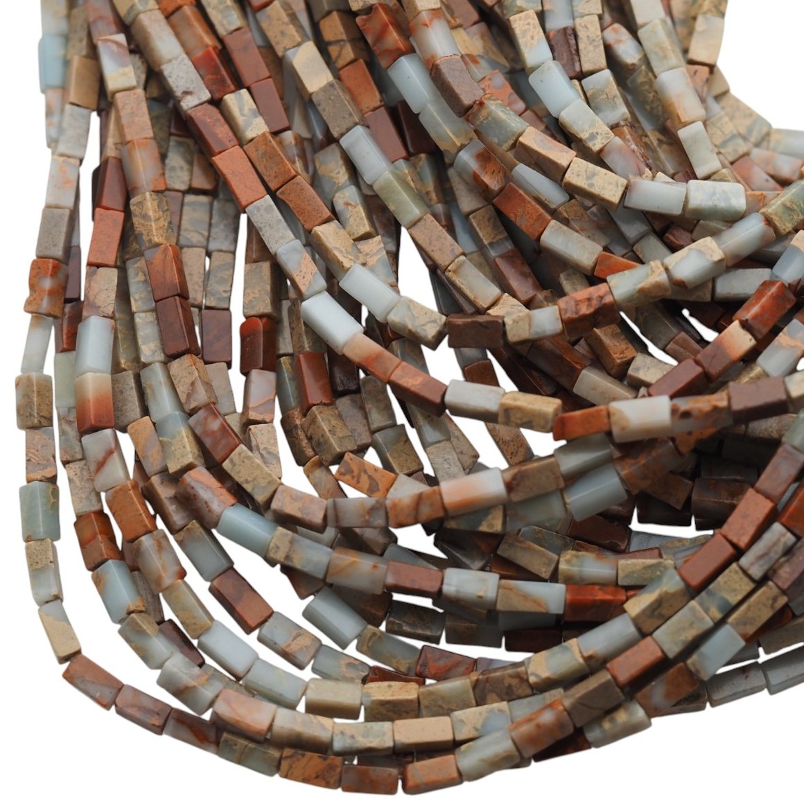 Jaspis cesarski niebieski w formie drobnych prostopadłościanów wyróżnia się spokojnym, chłodnym odcieniem niebieskiego. Geometryczny kształt nadaje projektom uporządkowany, nowoczesny charakter i pomaga budować równy rytm w kompozycji.