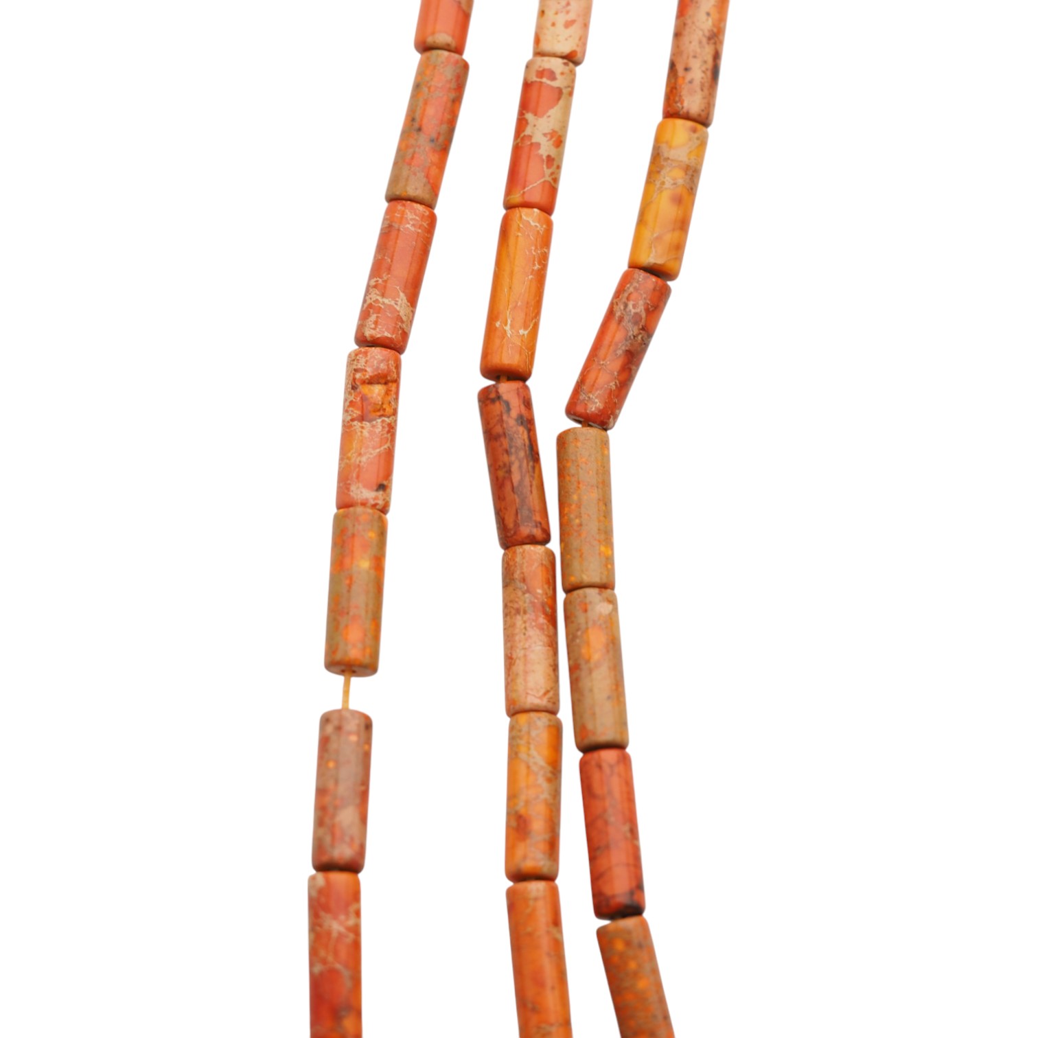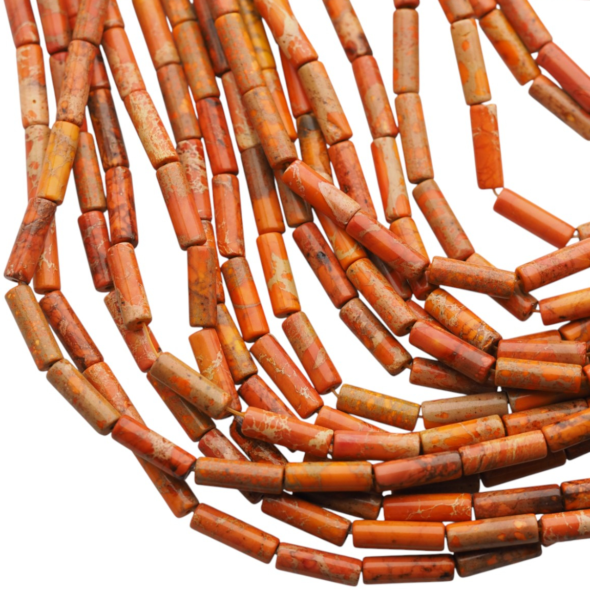 Jaspis cesarski pomarańczowy w formie walca to wyrazisty, ciepły akcent do biżuterii z naturalnych kamieni. Pomarańczowy odcień przyciąga wzrok i ociepla kompozycję, a regularny, podłużny kształt wprowadza w projekcie rytm oraz wizualny porządek.