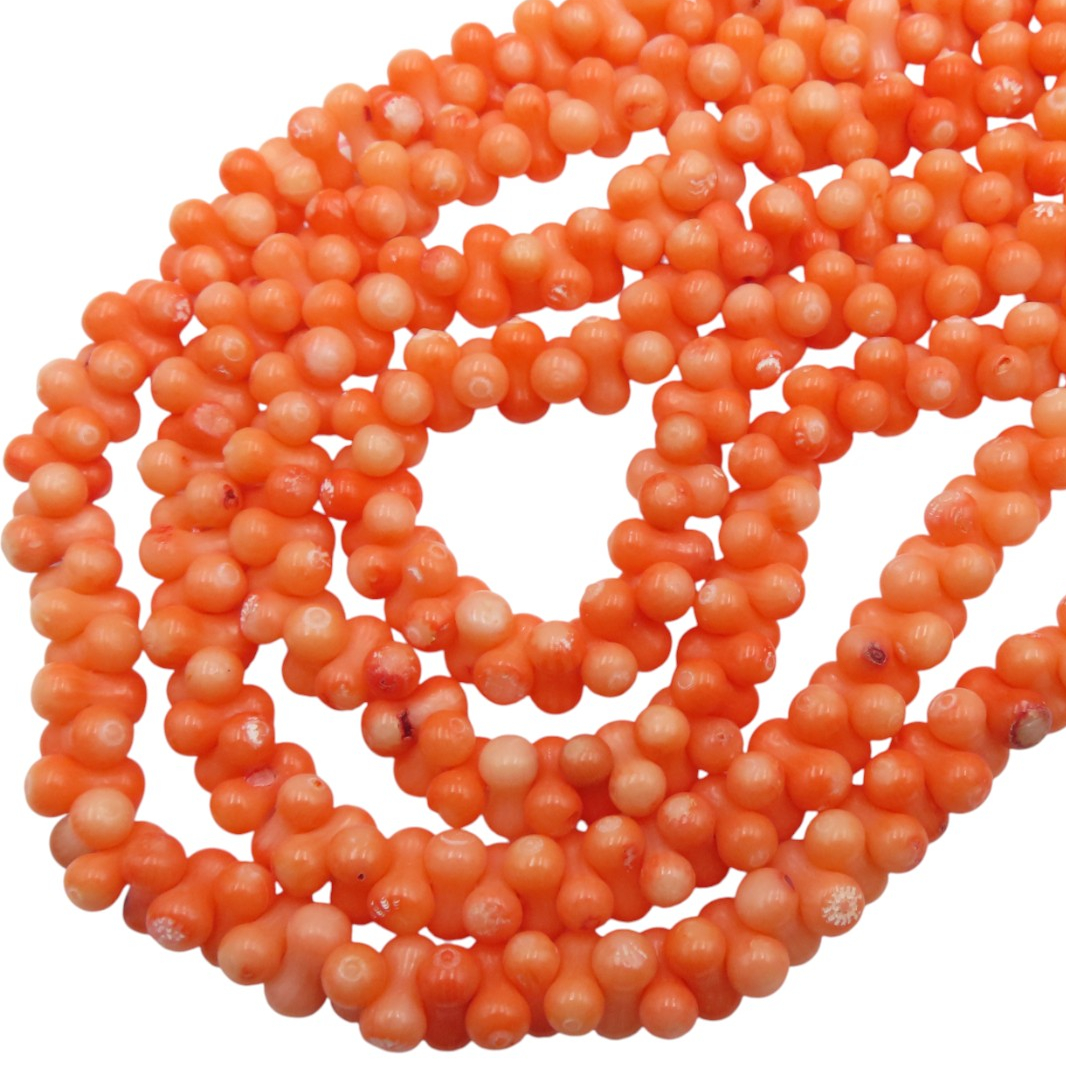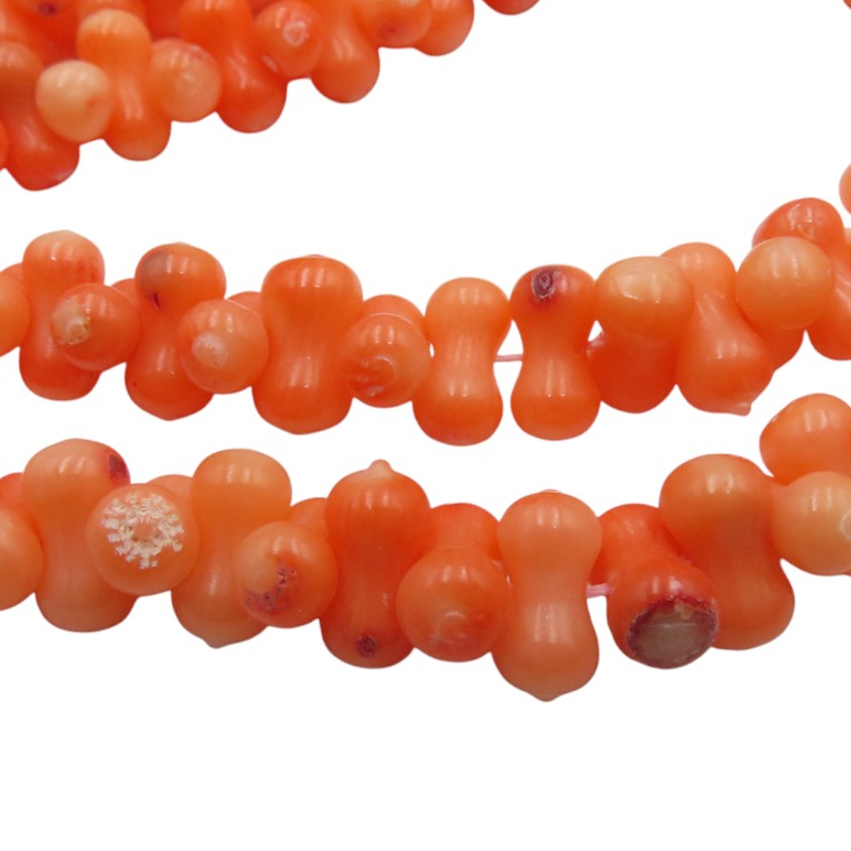 Naturalny koral pomarańczowy w kształcie kości to wyrazisty półfabrykat o ciepłej, energetycznej barwie, która natychmiast ociepla kompozycję i przyciąga wzrok. Regularna forma elementów pomaga budować spójny, rytmiczny układ na sznurze.