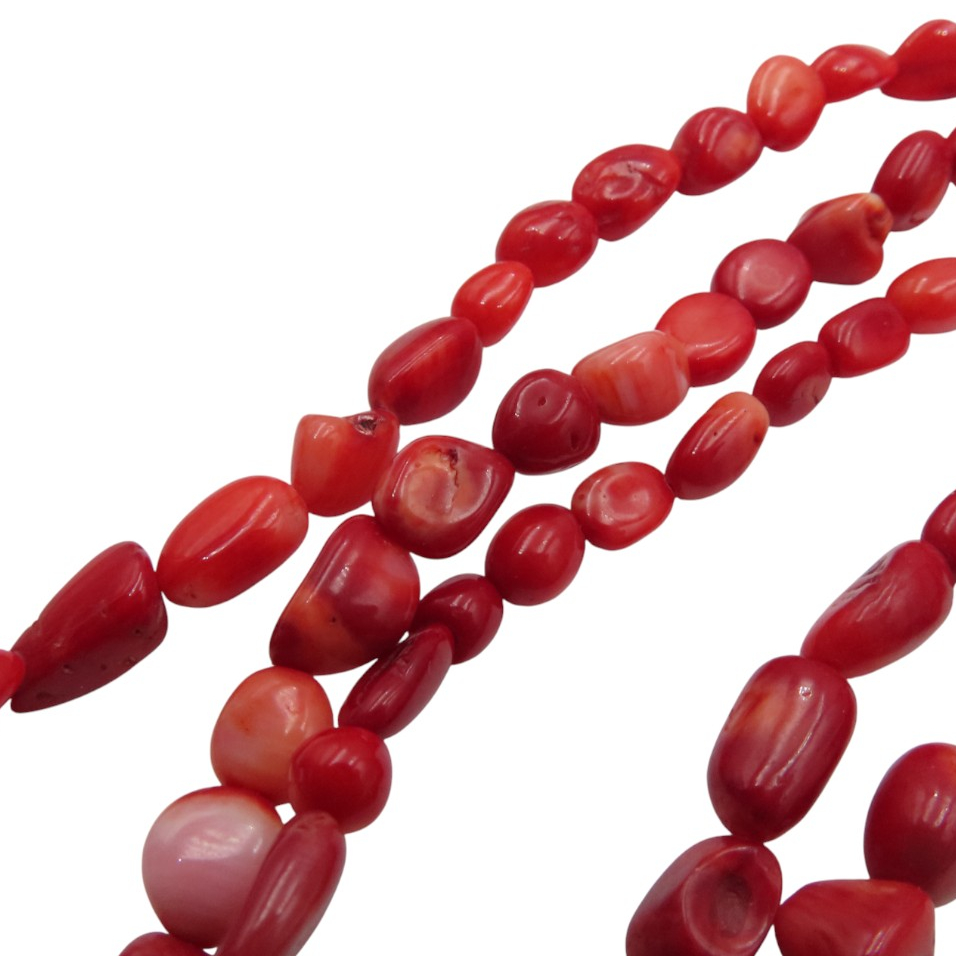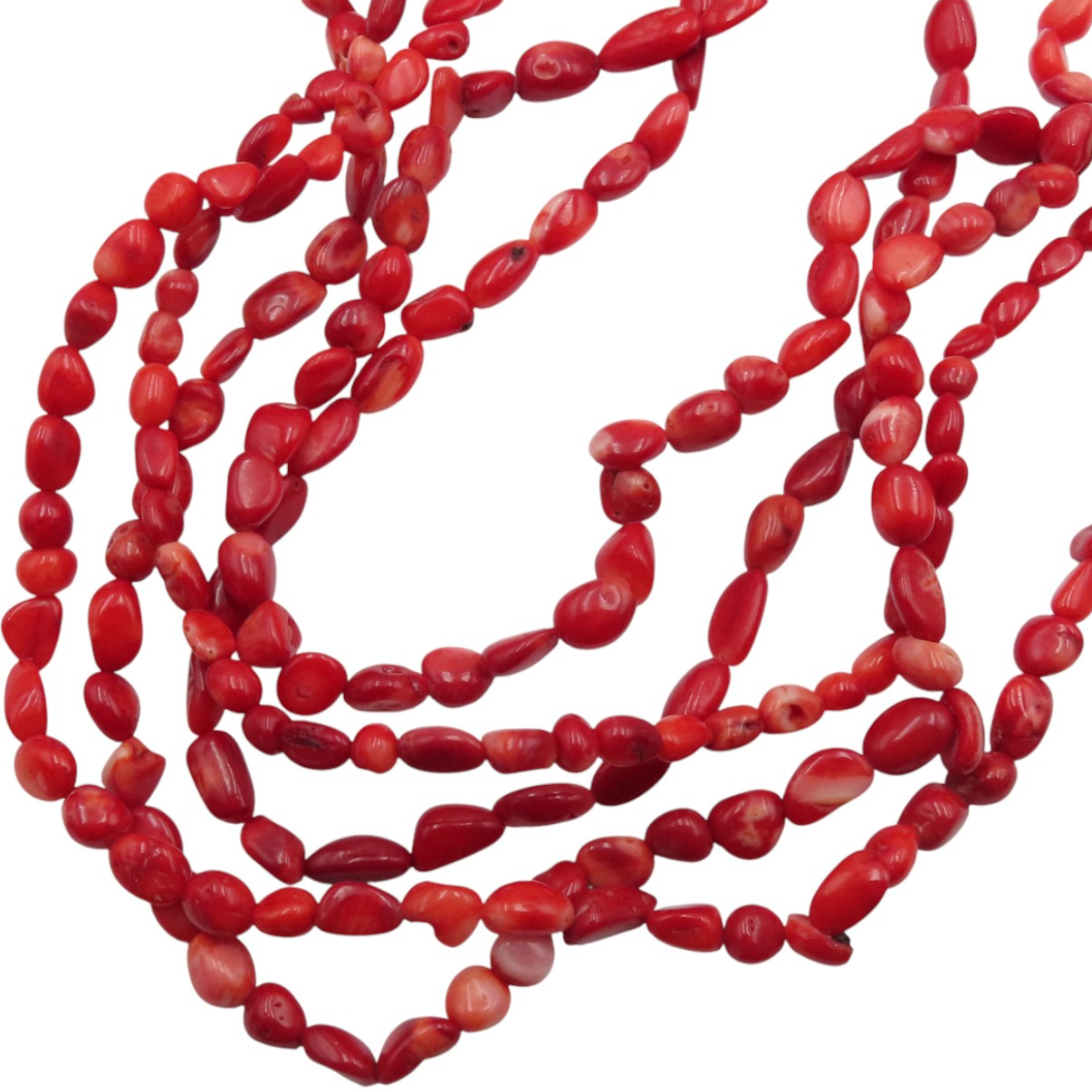 Naturalny koral czerwony w formie nieregularnych kamyków wyróżnia się głęboką, nasyconą czerwienią i organicznym, „żywym” rysunkiem. Zróżnicowana wielkość elementów buduje w biżuterii wrażenie naturalności oraz unikatowej, ręcznie tworzonej struktury.