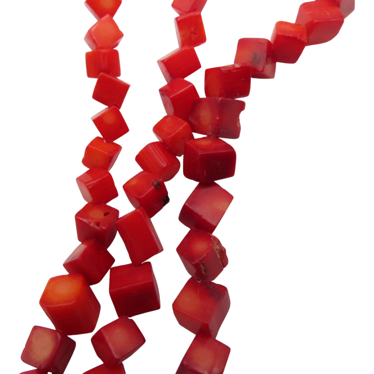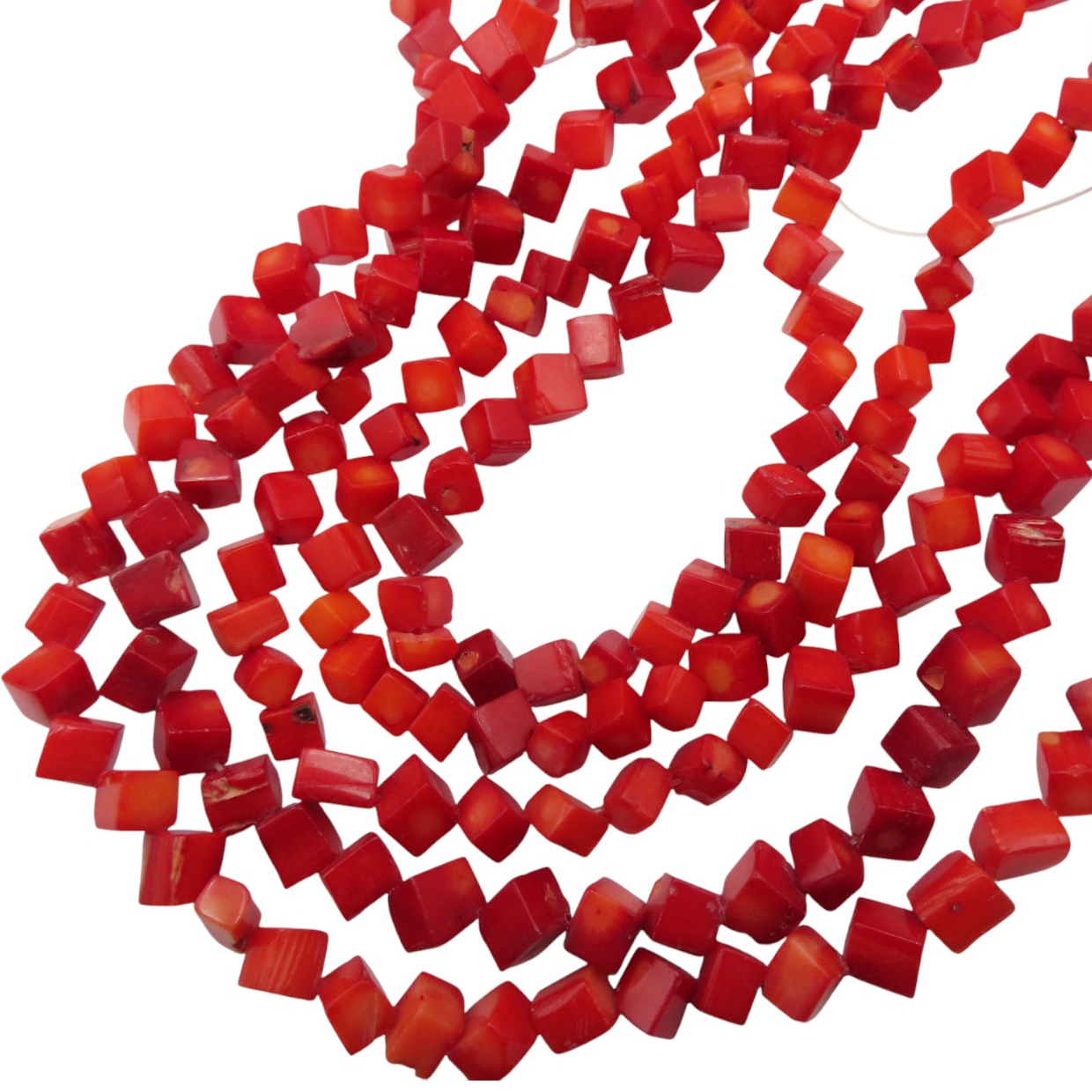 Naturalny koral czerwony w formie nieregularnych kamyków tworzy wyrazistą, ciepłą kompozycję o intensywnym czerwonym kolorze. Koraliki na sznurze są zróżnicowane wielkością, dzięki czemu całość wygląda naturalnie i organicznie.