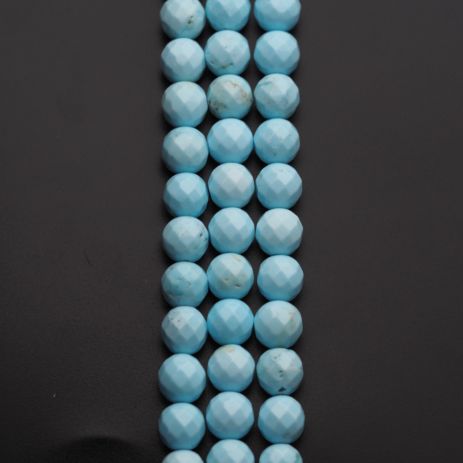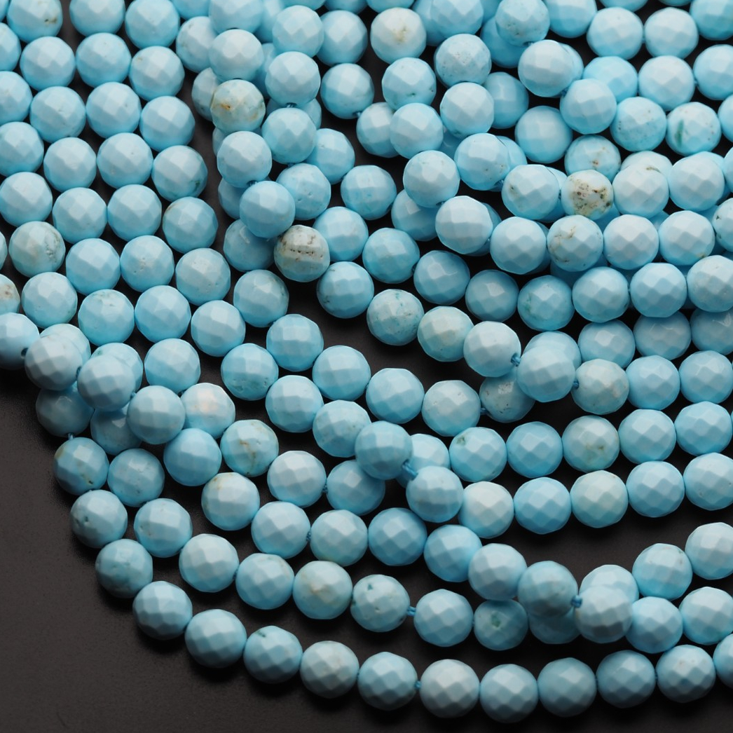 Fasetowane kulki turkusu (howlitu) w jasnym, błękitnym odcieniu tworzą równy, dekoracyjny sznur o wyraźnym połysku na krawędziach fasetu. To kamień o spokojnym, „turkusowym” charakterze wizualnym, chętnie wybierany do projektów inspirowanych naturalnymi minerałami.