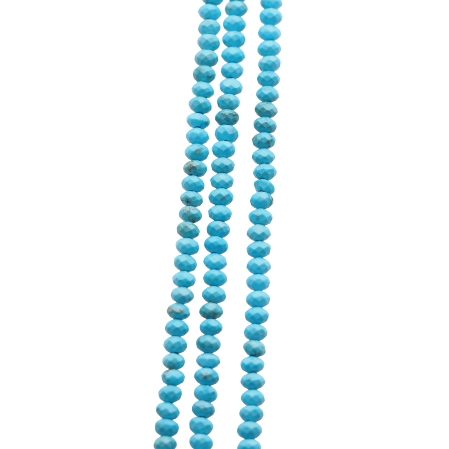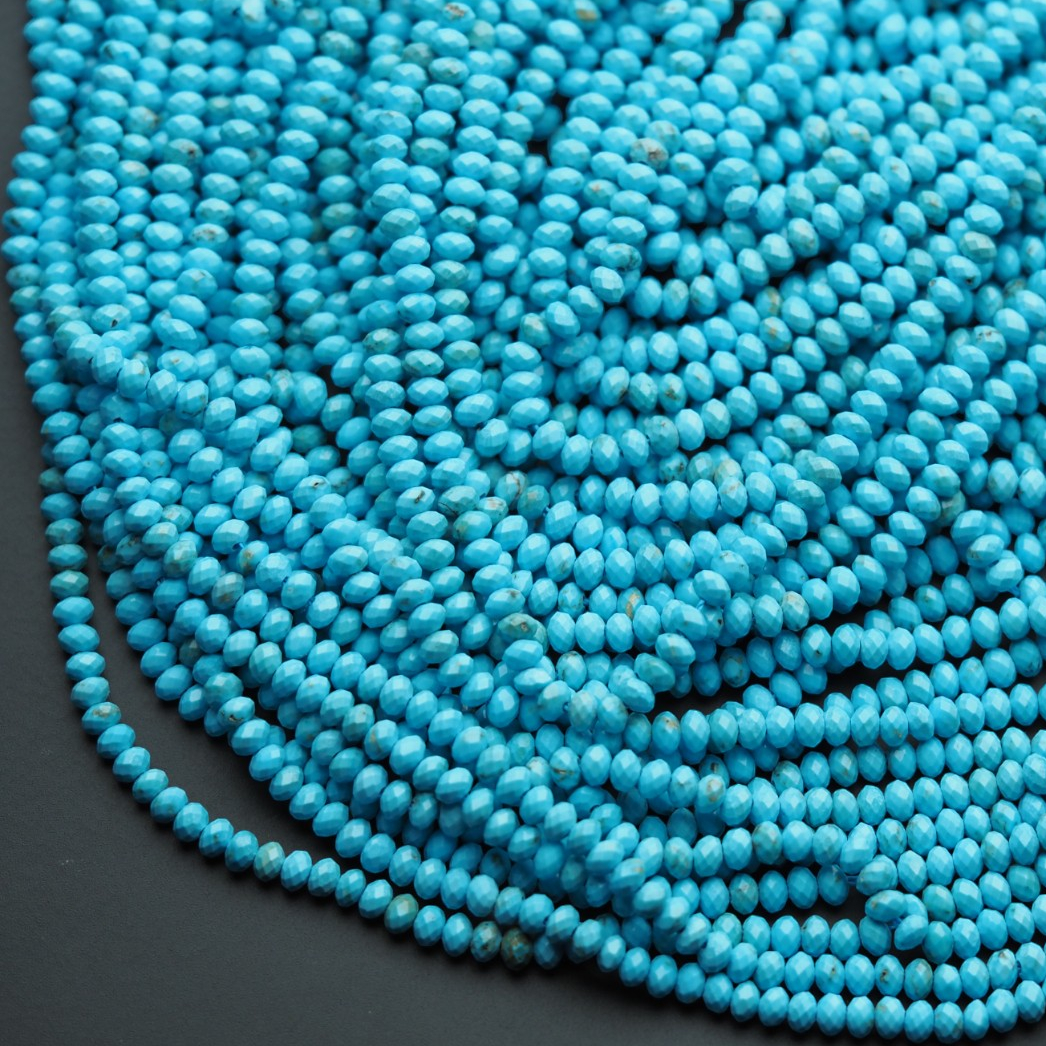 Naturalny turkus fasetowany w odcieniu niebieskim to drobne, elegancko szlifowane koraliki o dekoracyjnej pracy światła na fasetach. Kolor turkusu dodaje projektom świeżości i wyrazistego, jubilerskiego akcentu.