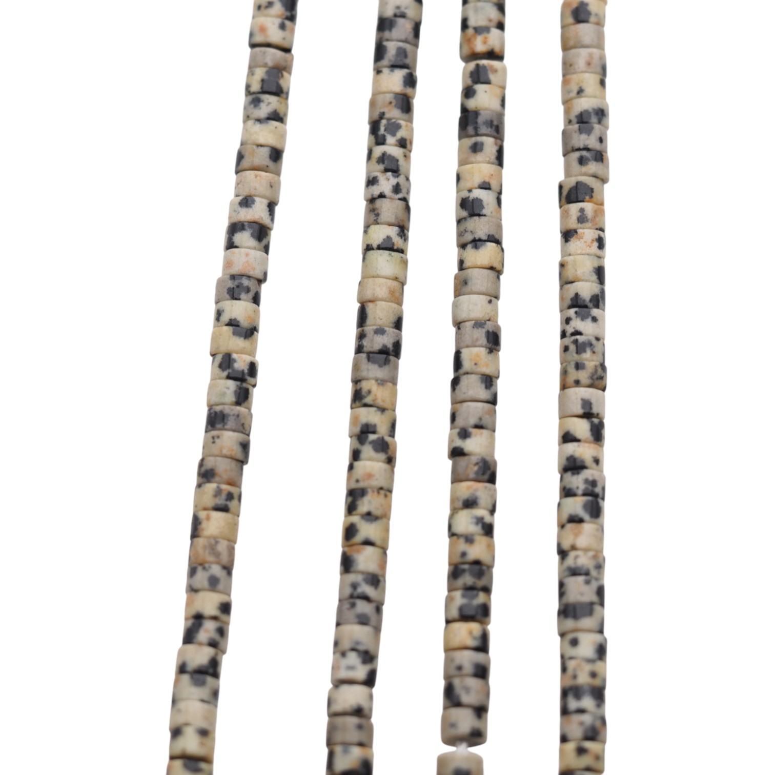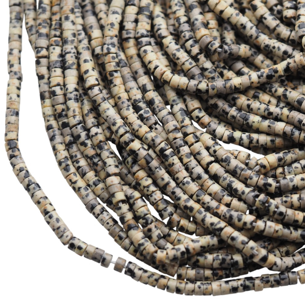 Naturalny jaspis dalmatyński w formie polerowanych walców to kamień o charakterystycznym, „cętkowanym” rysunku. Jasna baza kontrastuje z ciemnymi plamkami, dzięki czemu każdy sznur prezentuje się wyraziście, a jednocześnie lekko i naturalnie.