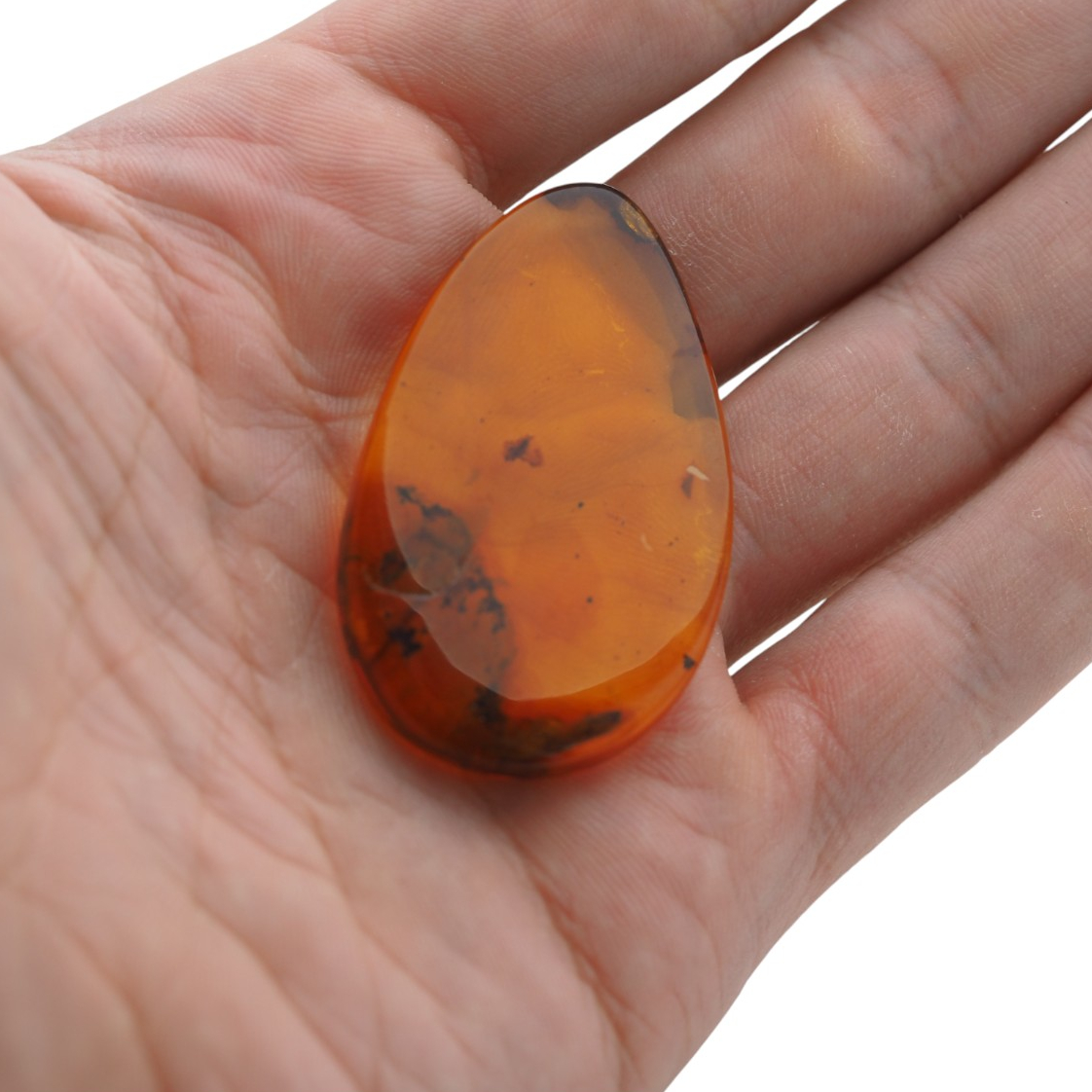 Kaboszon został lekko wypukły z obu stron, co sprawia, że pięknie załamuje światło i wydobywa wewnętrzny blask bursztynu. Taka forma jest szczególnie ceniona przez jubilerów – pozwala tworzyć naszyjniki, pierścionki i brosze, w których kamień prezentuje się efektownie niezależnie od kąta patrzenia.