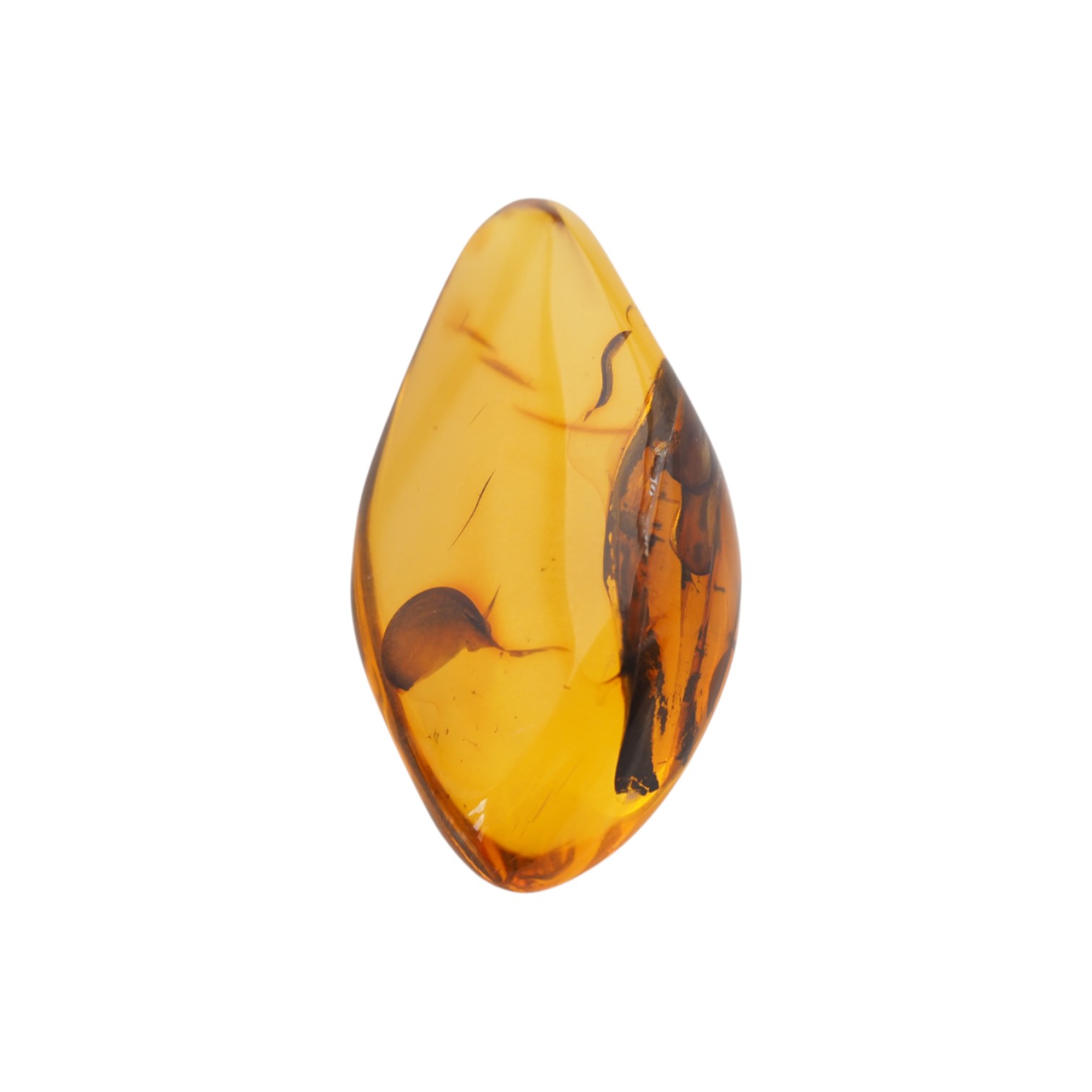 Unikatowy bursztyn bałtycki typu przezroczystego, o klasycznej barwie miodowo-koniakowej z wyraźnie widocznymi szczątkami organicznymi i naturalnymi smugami żywicy.