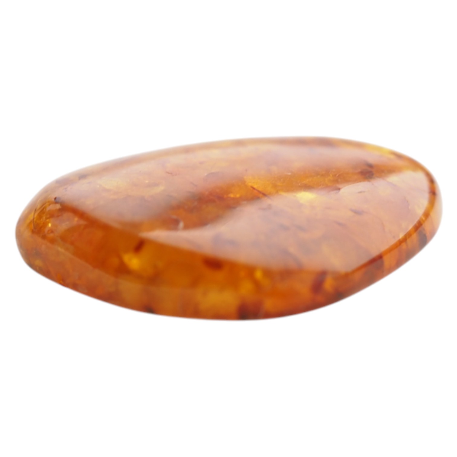 Precyzyjnie oszlifowany kaboszon wykonany z autentycznego bursztynu bałtyckiego typu łuskowego (tzw. „scalony bursztyn płatkowy”), wyróżniającego się efektem mieniących się wewnętrznych płatków, które odbijają światło pod różnymi kątami.