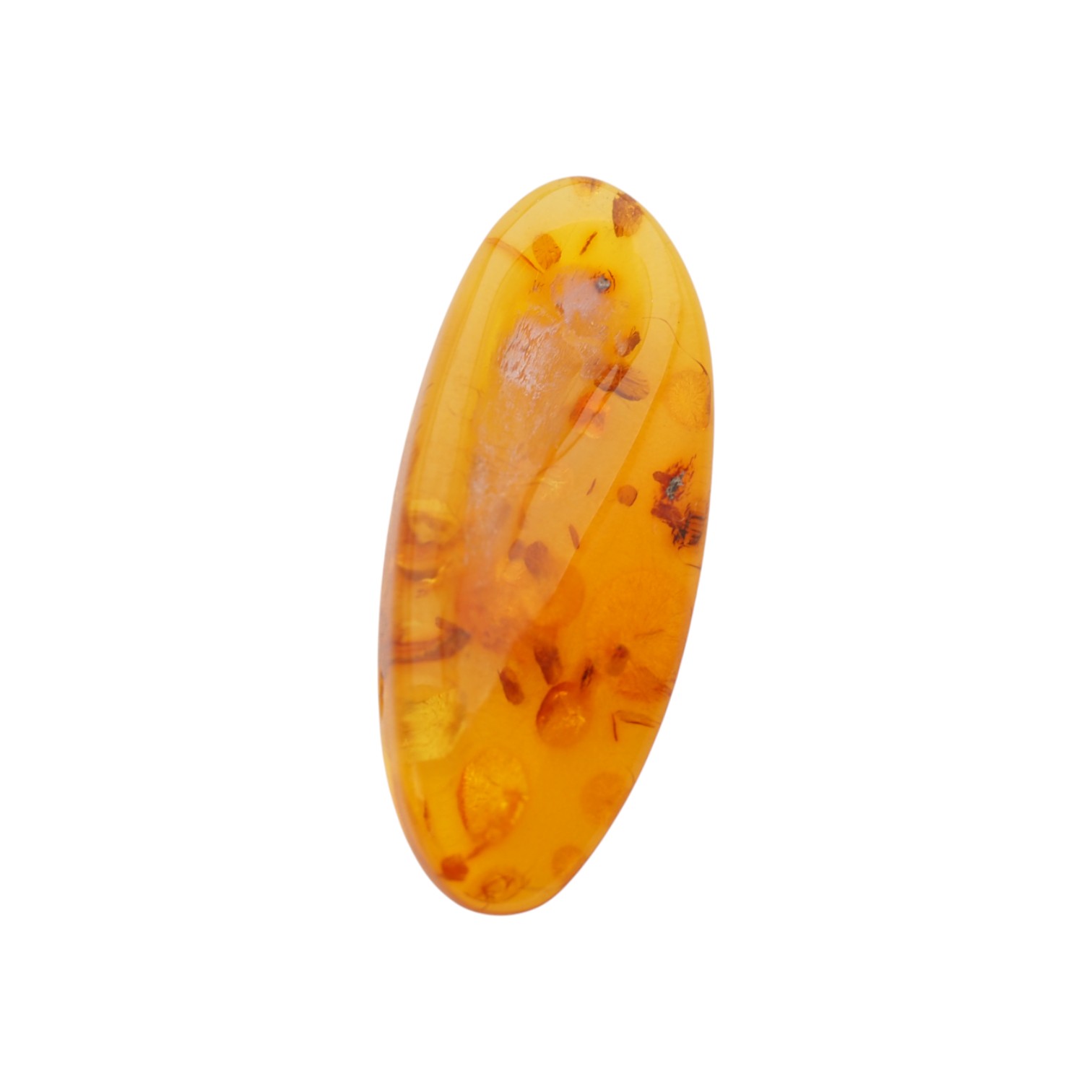 Ten wyjątkowy egzemplarz wykonano z autentycznego bursztynu bałtyckiego typu koniakowego – o intensywnej, ciepłej barwie z nutami pomarańczu i miodu. Wewnątrz kamienia widoczne są drobne naturalne wtrącenia, mikroskopijne pęcherzyki powietrza oraz organiczne struktury, które potwierdzają jego naturalne pochodzenie.