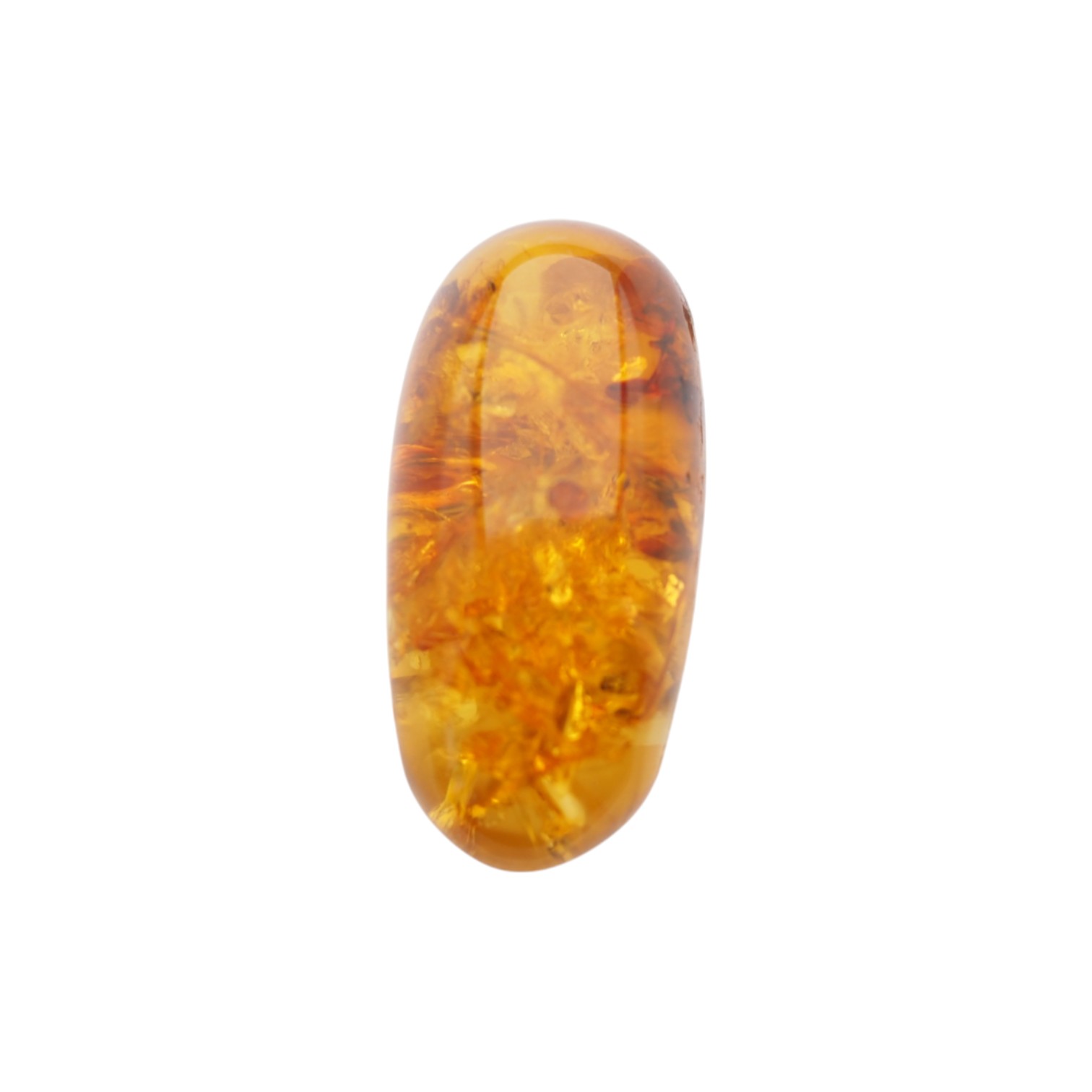 Wewnątrz widoczne są liczne łuski świetlne oraz naturalne inkluzje organiczne, które w połączeniu z półprzezroczystą strukturą tworzą efekt tzw. "ognia bursztynowego" – zjawisko charakterystyczne dla wysokiej jakości bursztynu bałtyckiego.