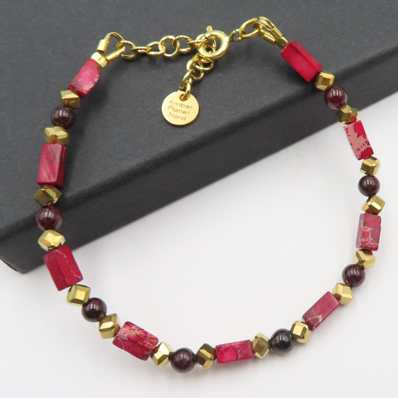 Bransoletka Jaspis Cesarski, Granat i Hematyt w srebrze złoconym.