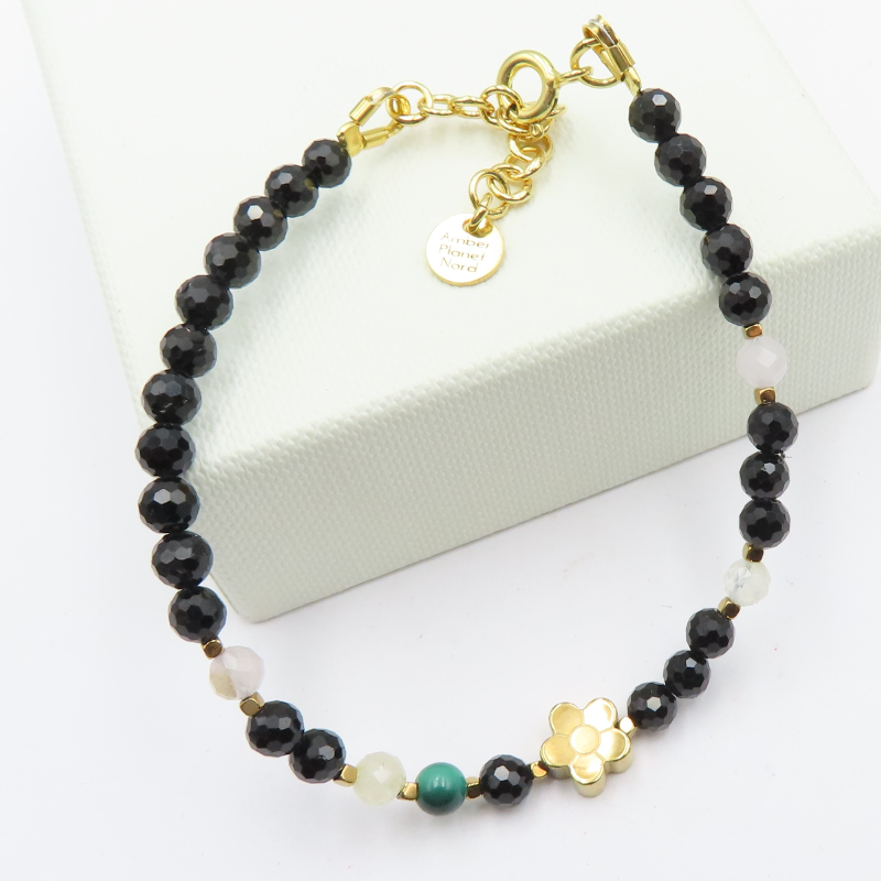 Bransoletka Turmalin Czarny, Cytryn. Kwarc Różowy, Malachit i Hematyt w srebrze złoconym.