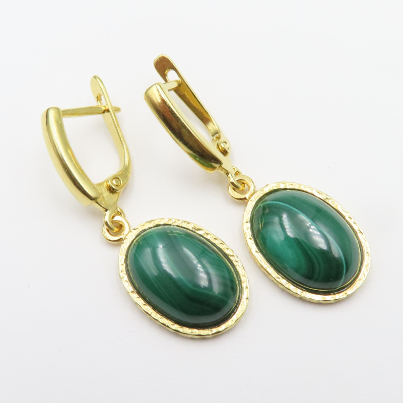 Kolczyki z malachitem w owalnym kształcie przyciągają uwagę głęboką, zieloną barwą i naturalnym rysunkiem kamienia. Półszlachetny malachit osadzono w srebrnej oprawie, a całość wykończono złoceniem, co nadaje biżuterii ciepły, elegancki charakter.