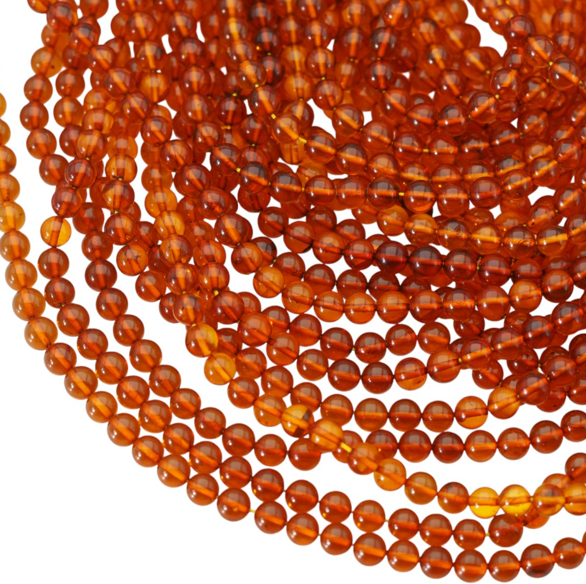Naturalny bursztyn koniakowy w formie polerowanych kulek ma ciepły, miodowo-brązowy odcień i charakterystyczną, żywiczną głębię. Gładkie wykończenie podkreśla naturalny urok kamienia i nadaje całości elegancki, lekki wygląd.