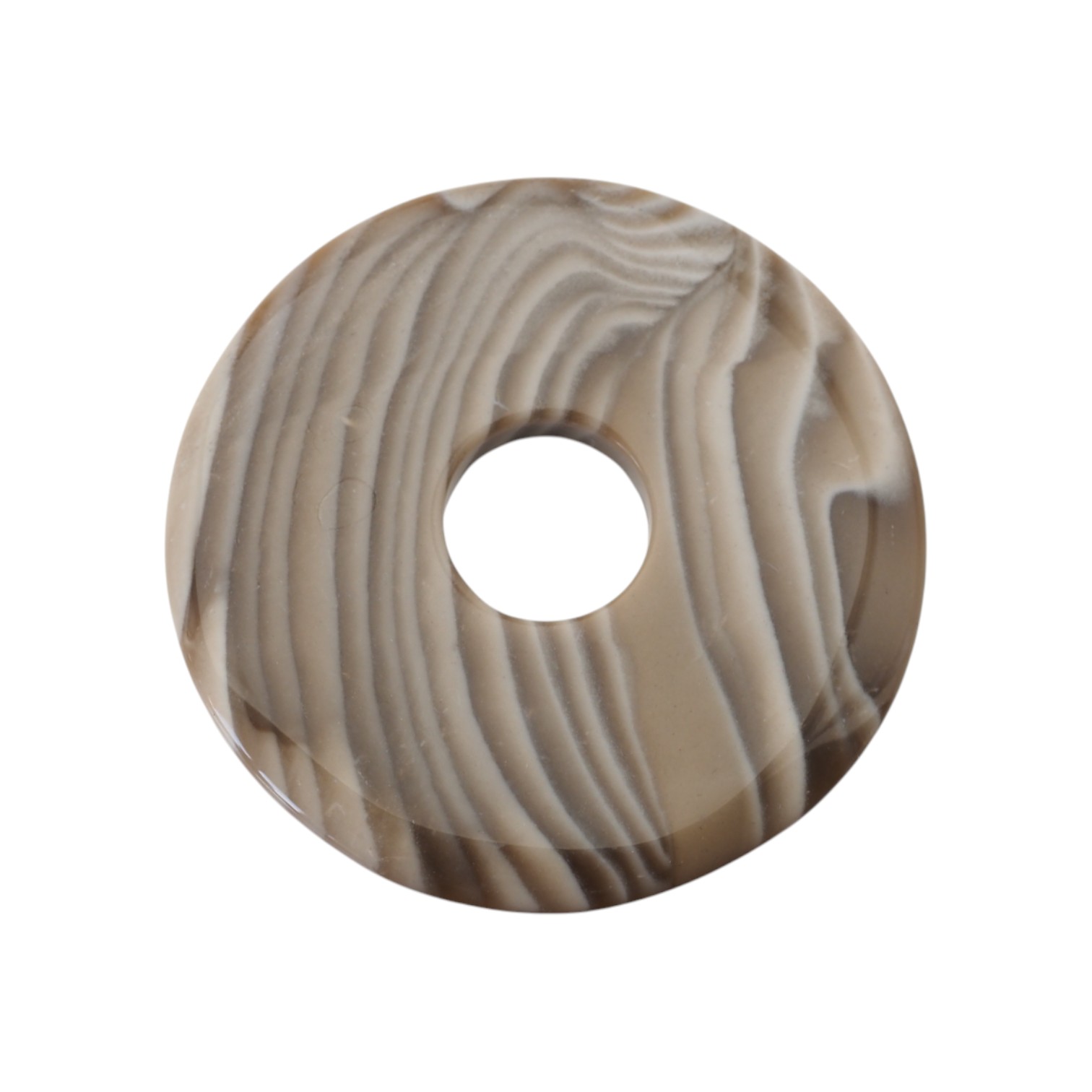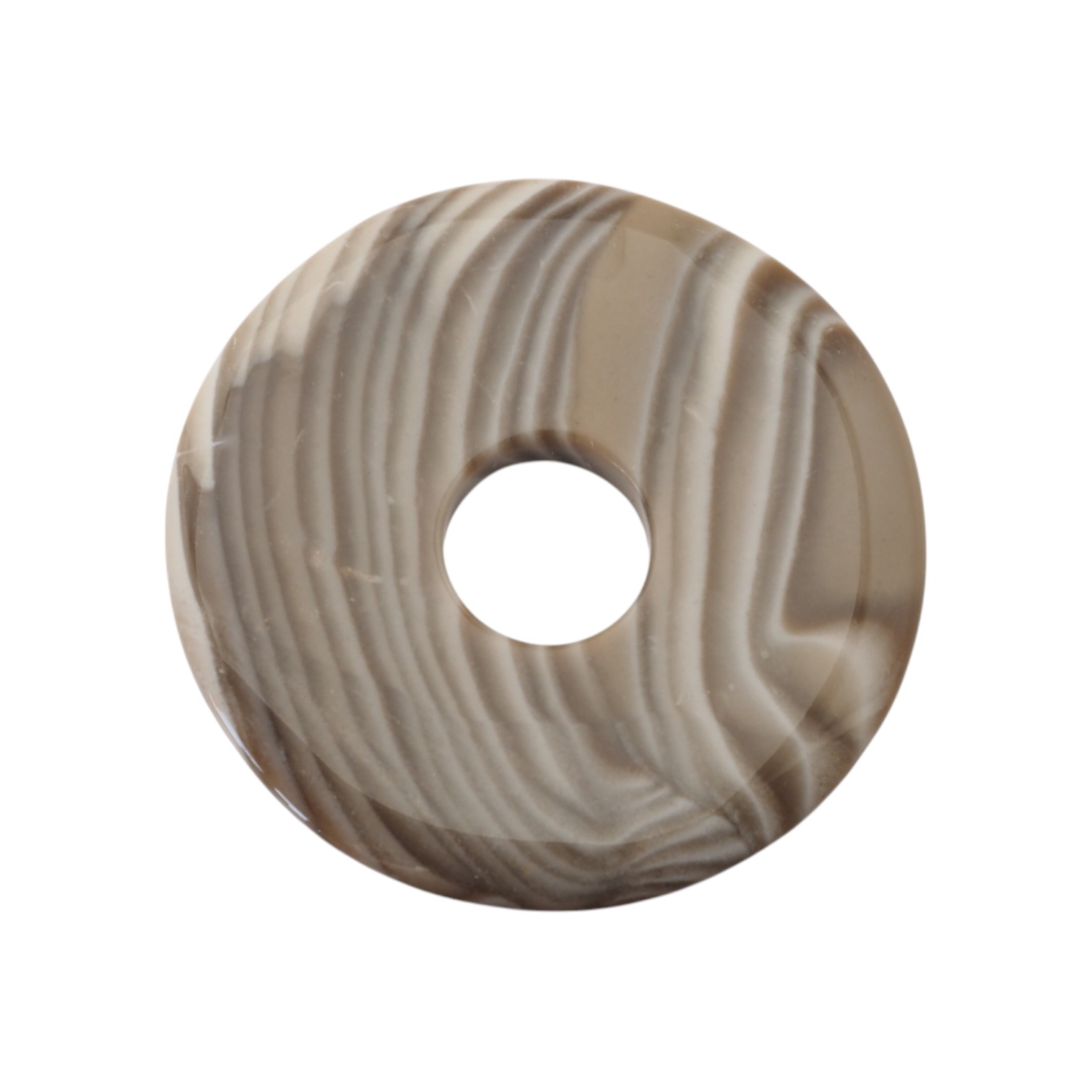 Krzemień pasiasty w formie donuta (donata) to naturalny kamień ozdobny o charakterystycznym, warstwowym rysunku pasów. Okrągły kształt z otworem w środku tworzy wyraziste „oczko” w biżuterii i dobrze prezentuje się jako centralny element projektu.