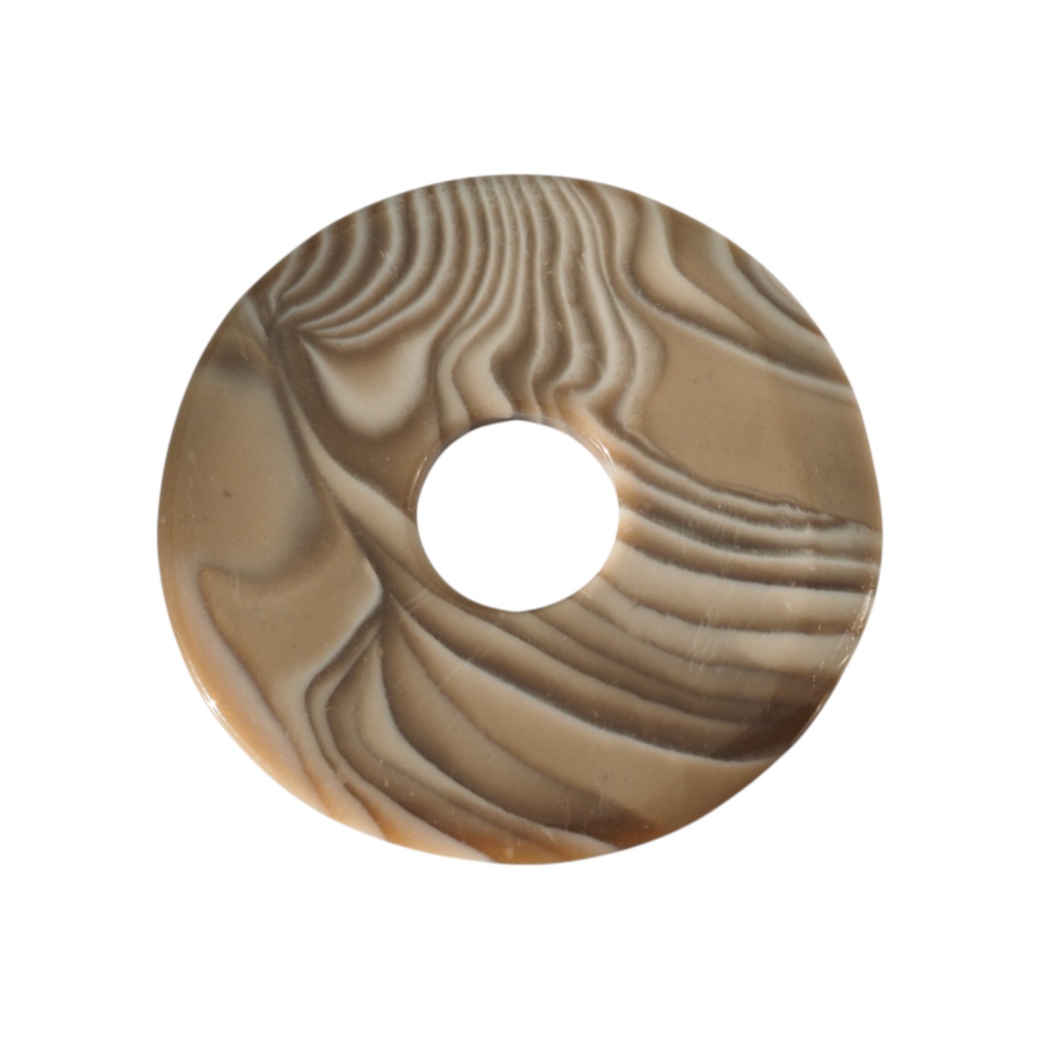 Naturalny krzemień pasiasty w formie donuta (donat) to ozdobny element o charakterystycznym, pasmowym rysunku. Okrągły kształt z centralnym otworem podkreśla „oczko” kamienia i dobrze eksponuje jego naturalne uwarstwienia.