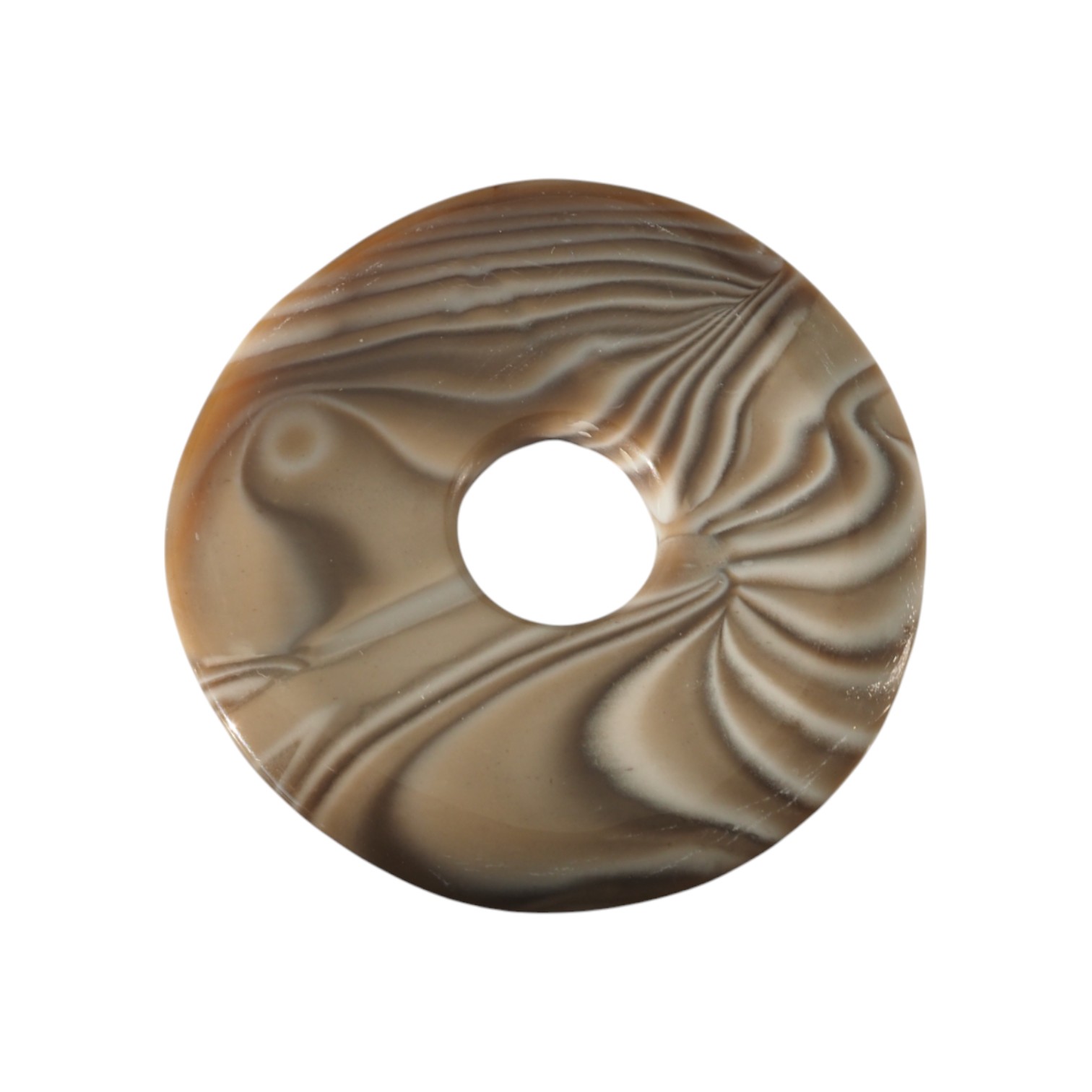 Naturalny krzemień pasiasty w formie donuta (donat) to efektowny kaboszon z charakterystycznym, warstwowym rysunkiem „pasiastym”. Okrągły kształt z centralnym otworem podkreśla graficzny charakter kamienia i sprawia, że świetnie prezentuje się jako wyrazisty element kompozycji.