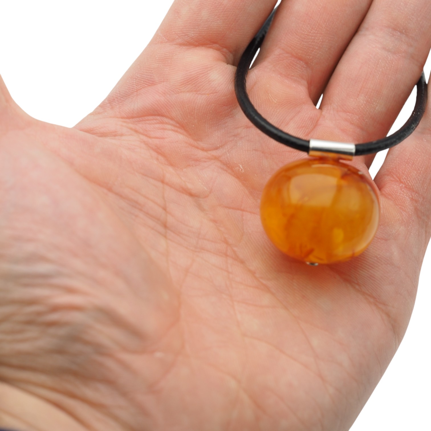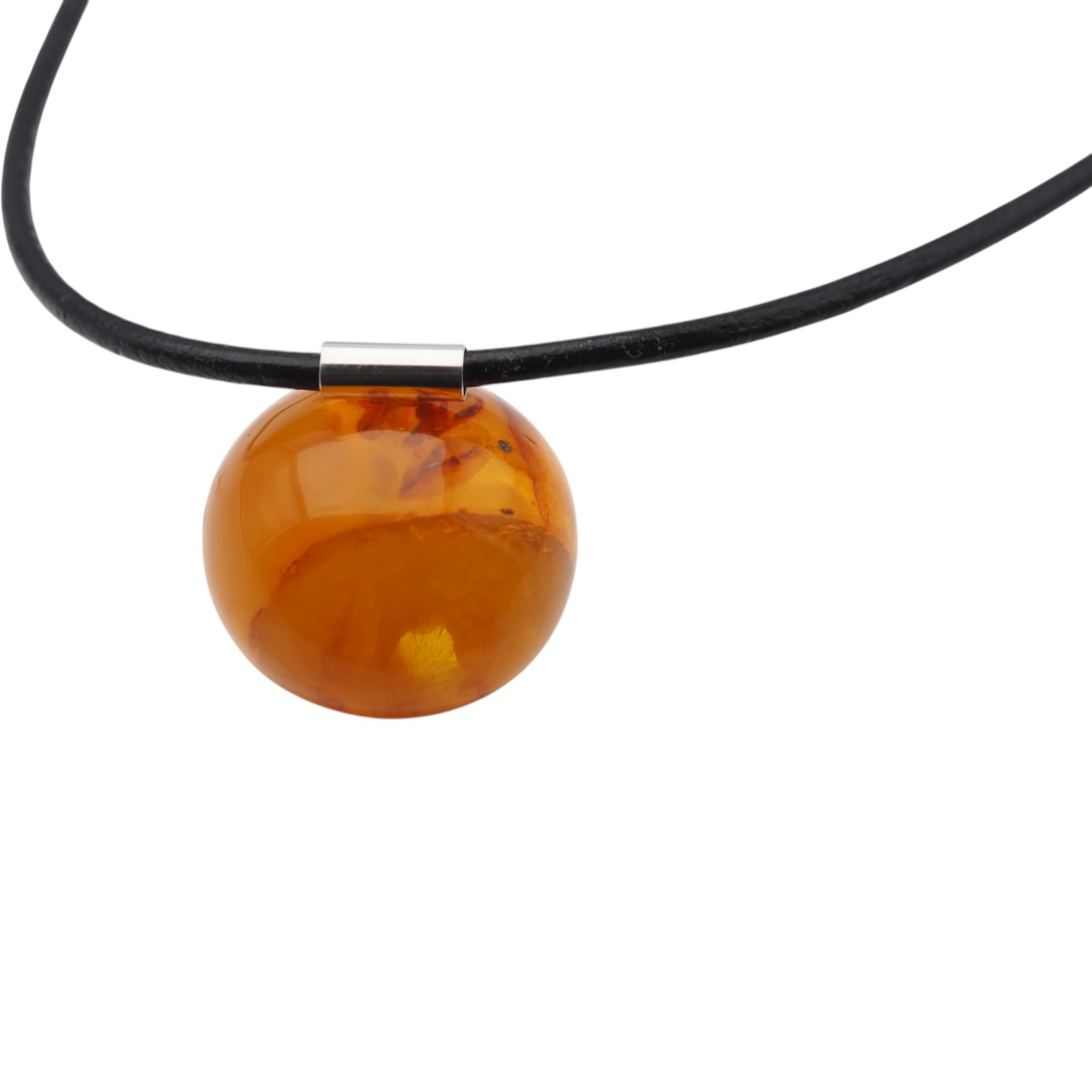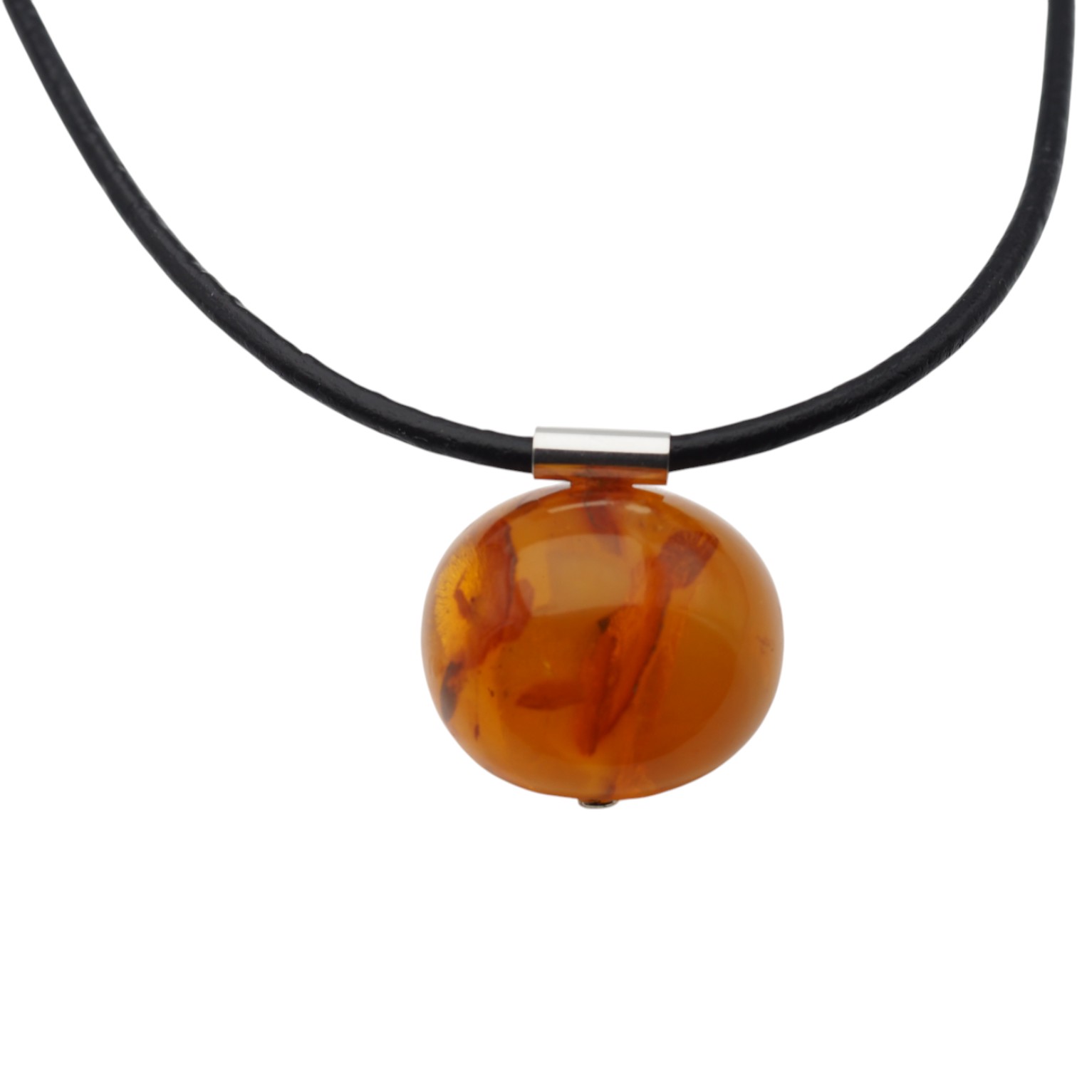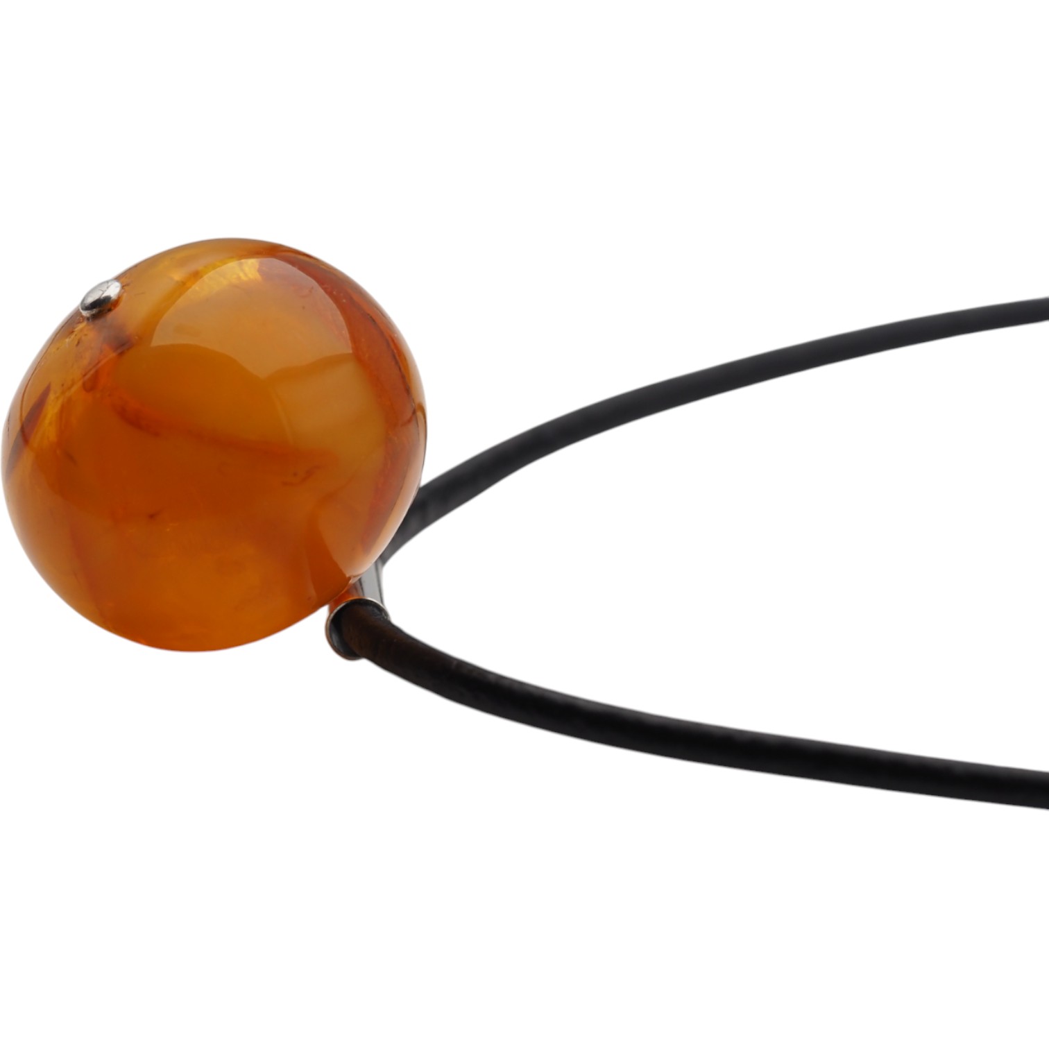 Ręcznie wykonany naszyjnik z naturalnym bursztynem w kształcie spłaszczonej kulki przyciąga uwagę ciepłą, miodową tonacją i organicznym charakterem kamienia. Zawieszka jest osadzona w srebrze próby 925, co nadaje całości eleganckie, jubilerskie wykończenie.