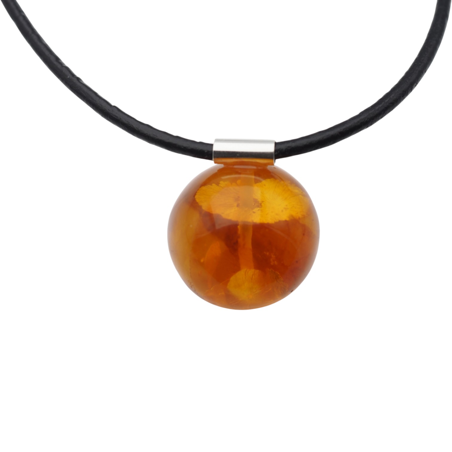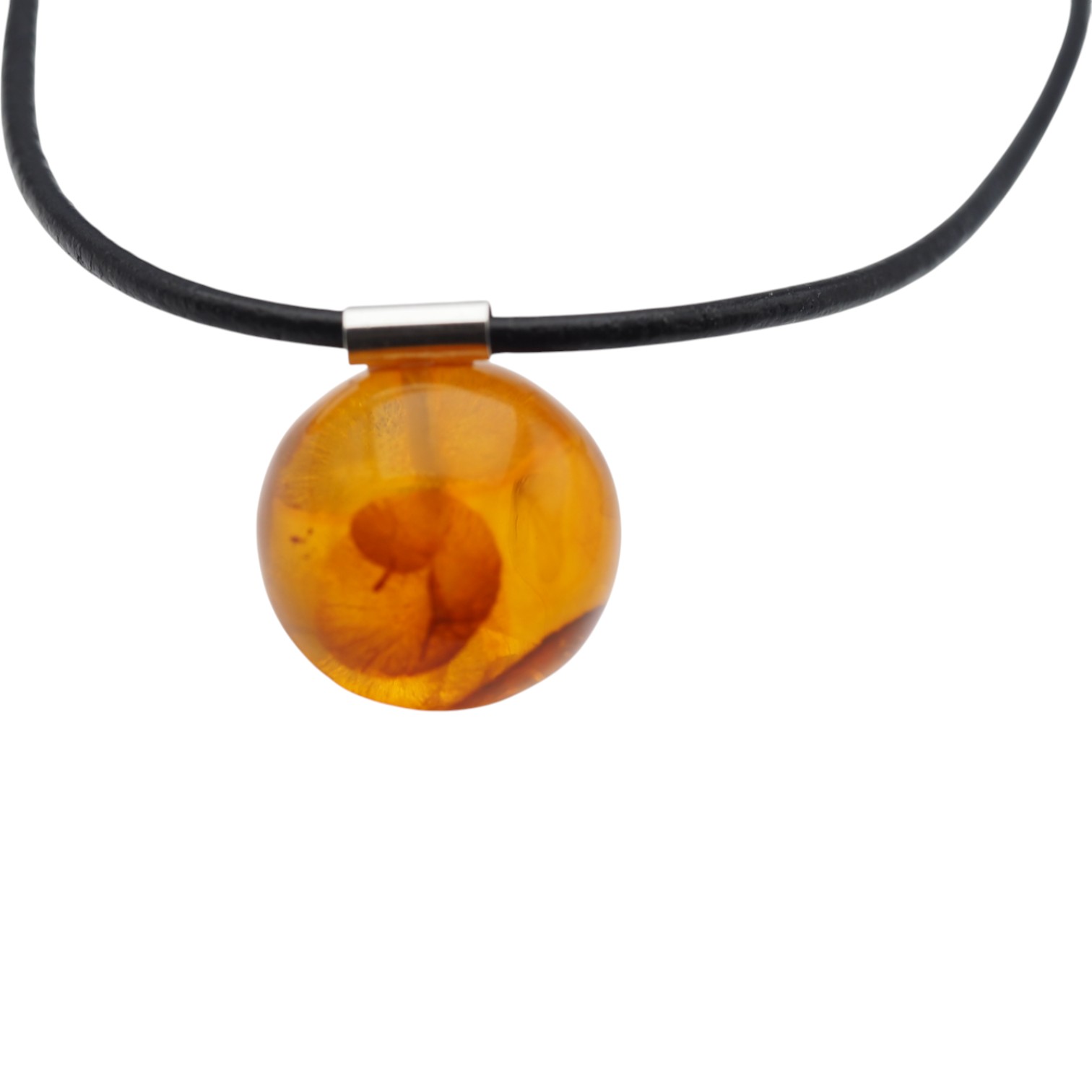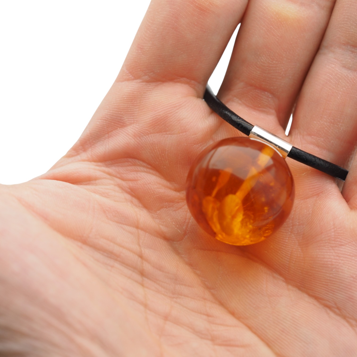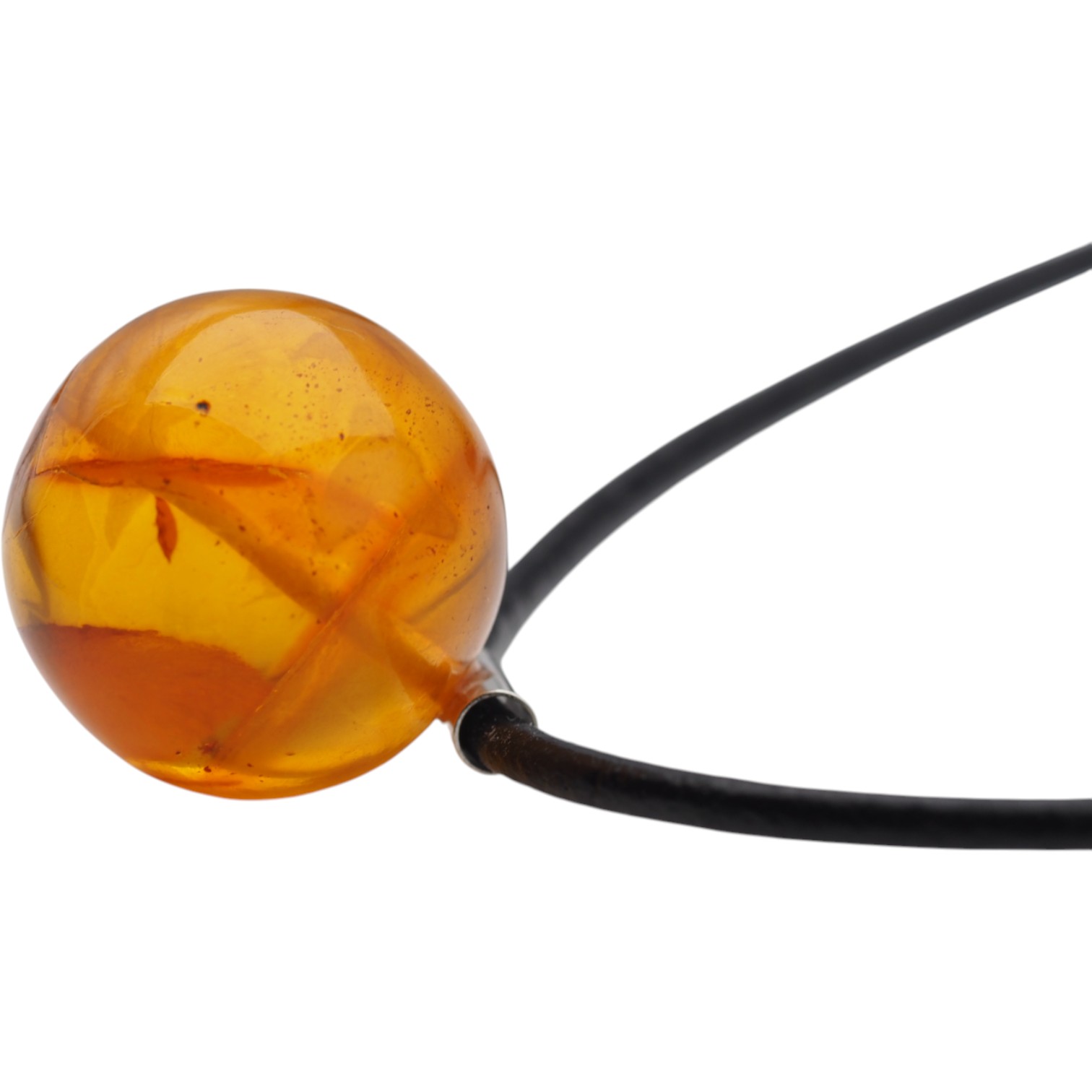 Ręcznie wykonany naszyjnik z naturalnym bursztynem w kształcie spłaszczonej kulki przyciąga uwagę ciepłą, miodowo-koniakową kolorystyką i organicznym charakterem kamienia. Całość uzupełniają elementy ze srebra próby 925, które podkreślają szlachetny, jubilerski styl i nadają kompozycji eleganckie wykończenie.