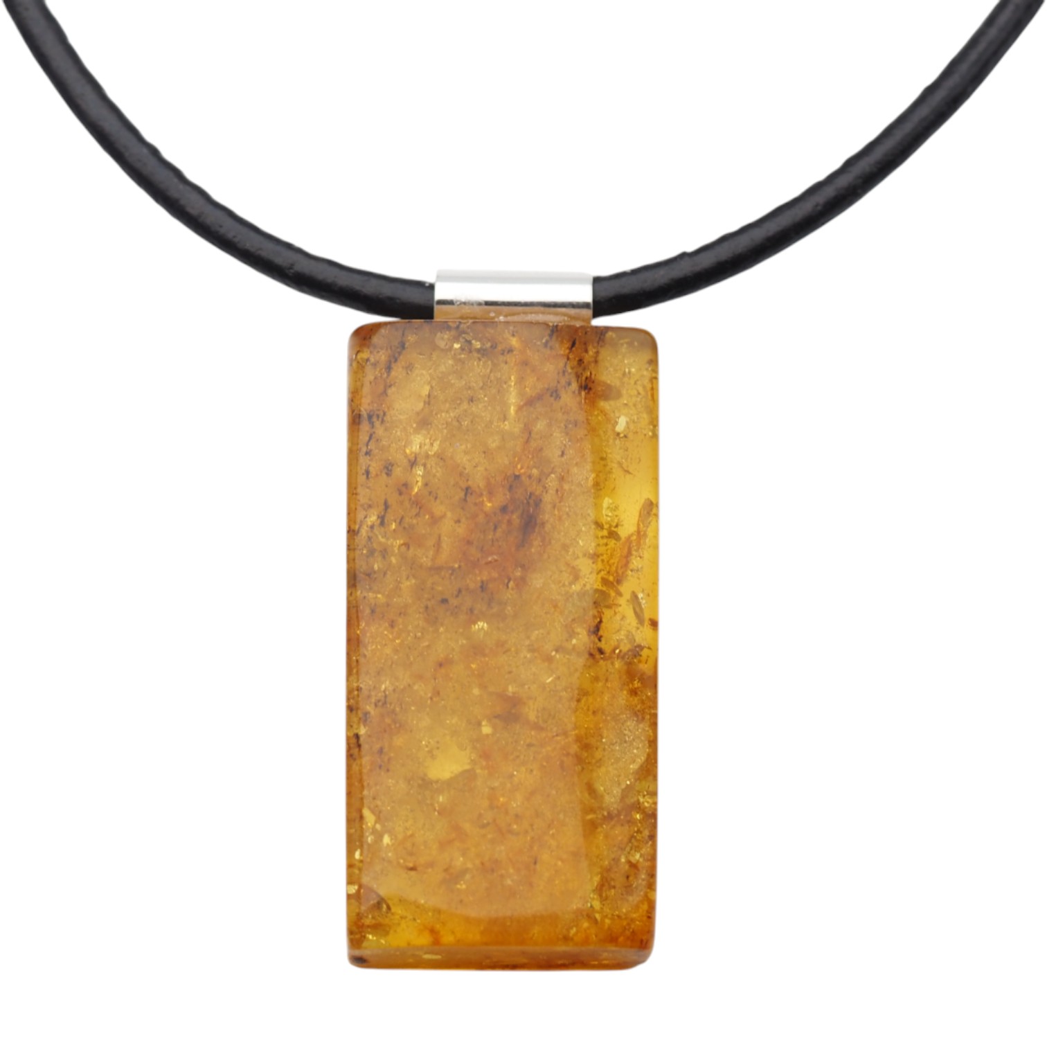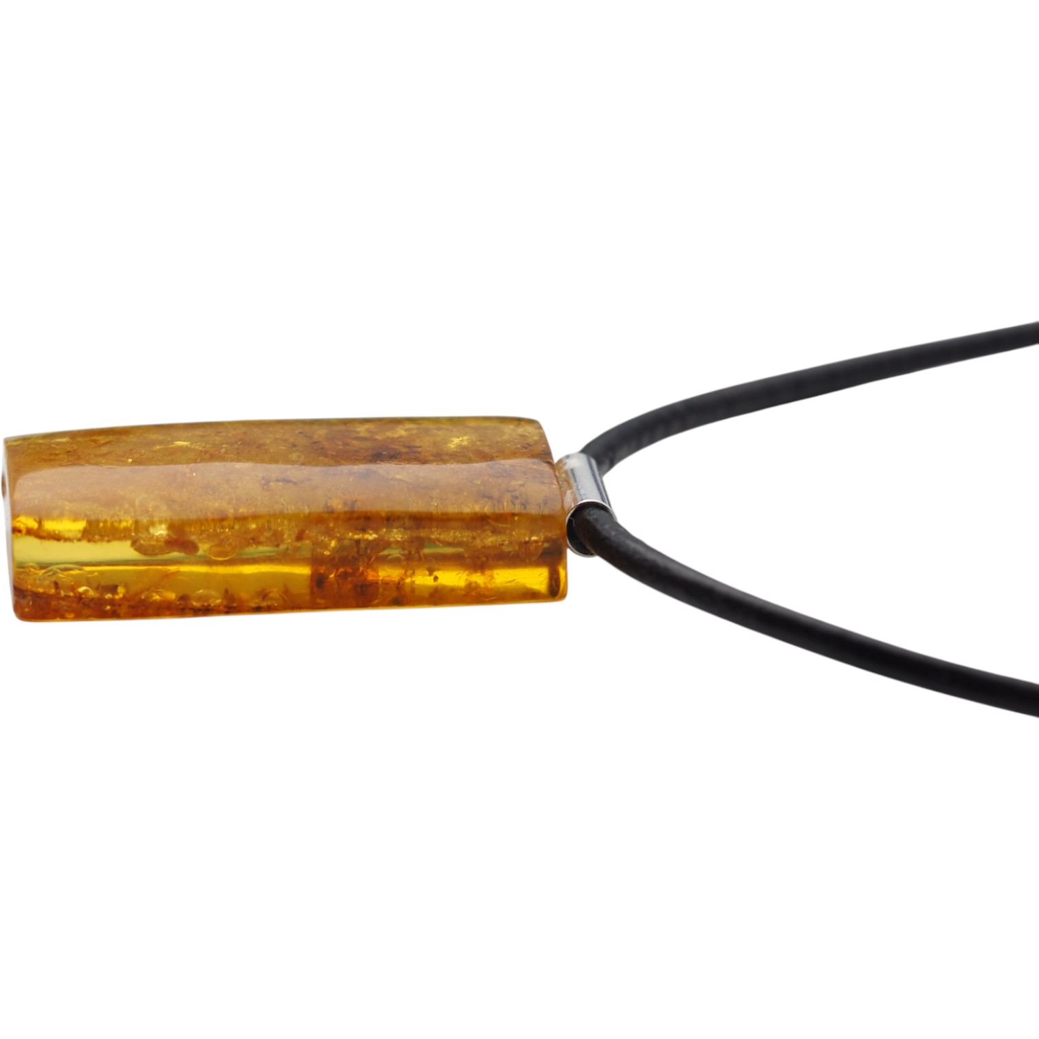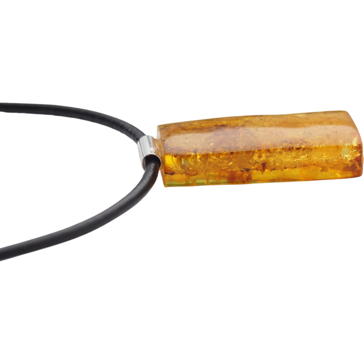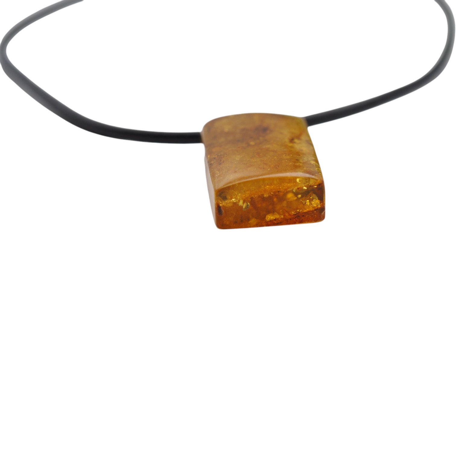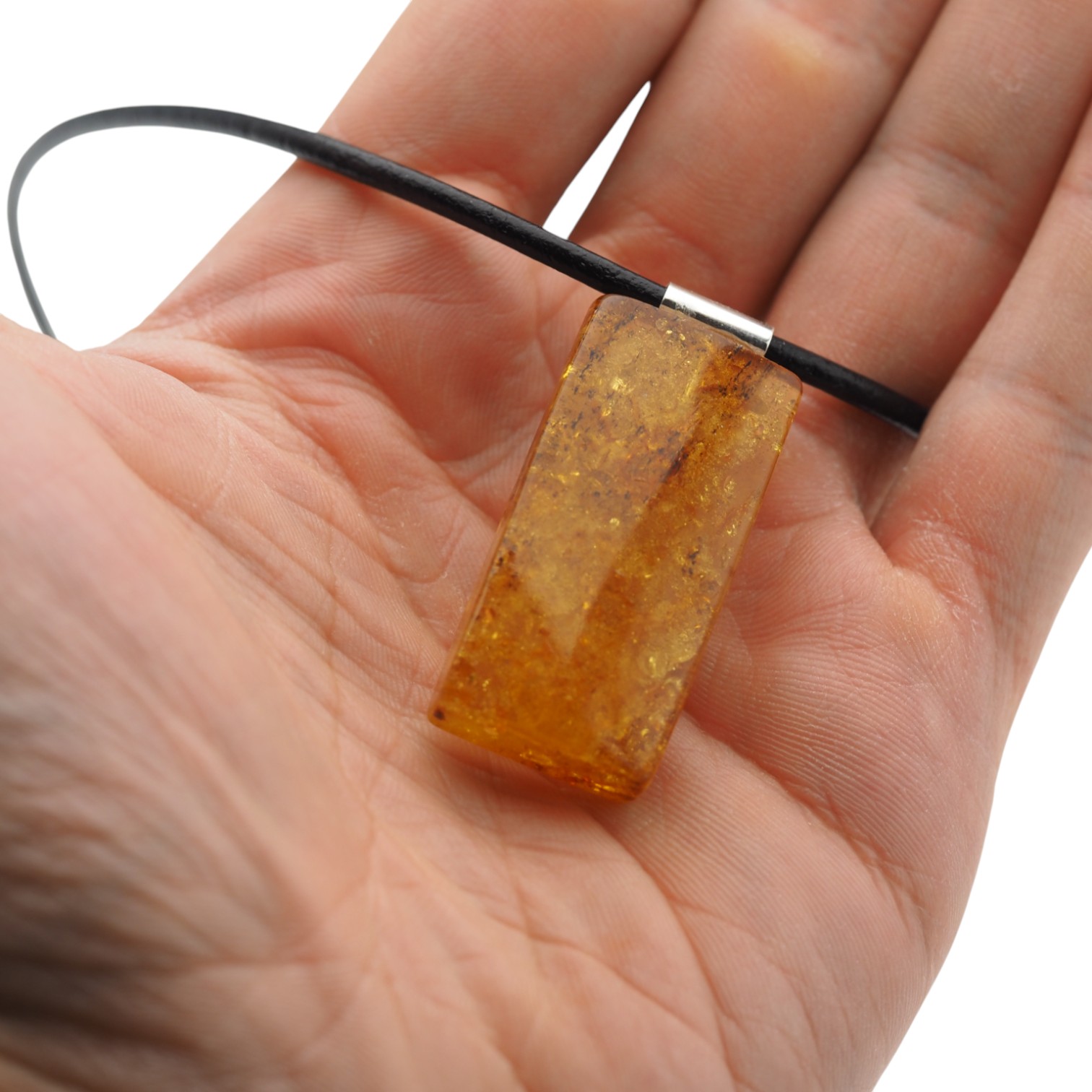 Ten naszyjnik na rzemieniu przyciąga uwagę ręcznie wykonaną zawieszką z naturalnego bursztynu bałtyckiego. Prostokątny kamień ma ciepły, miodowo-koniakowy charakter, a widoczne „łuski” tworzą niepowtarzalny rysunek wewnątrz bryły. Całość została artystycznie opracowana i wykończona srebrem próby 925, co podkreśla szlachetność materiałów i nadaje biżuterii jubilerski, autorski styl.