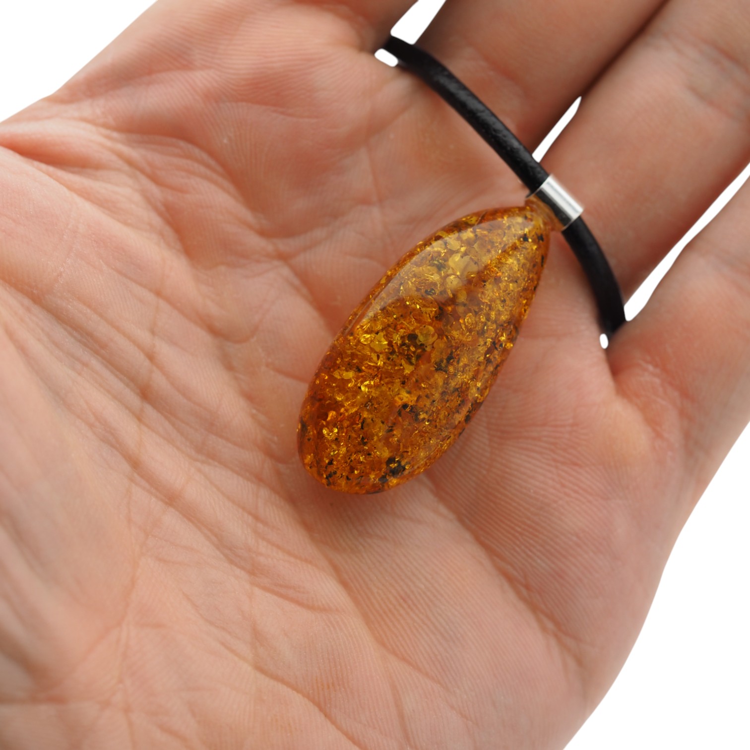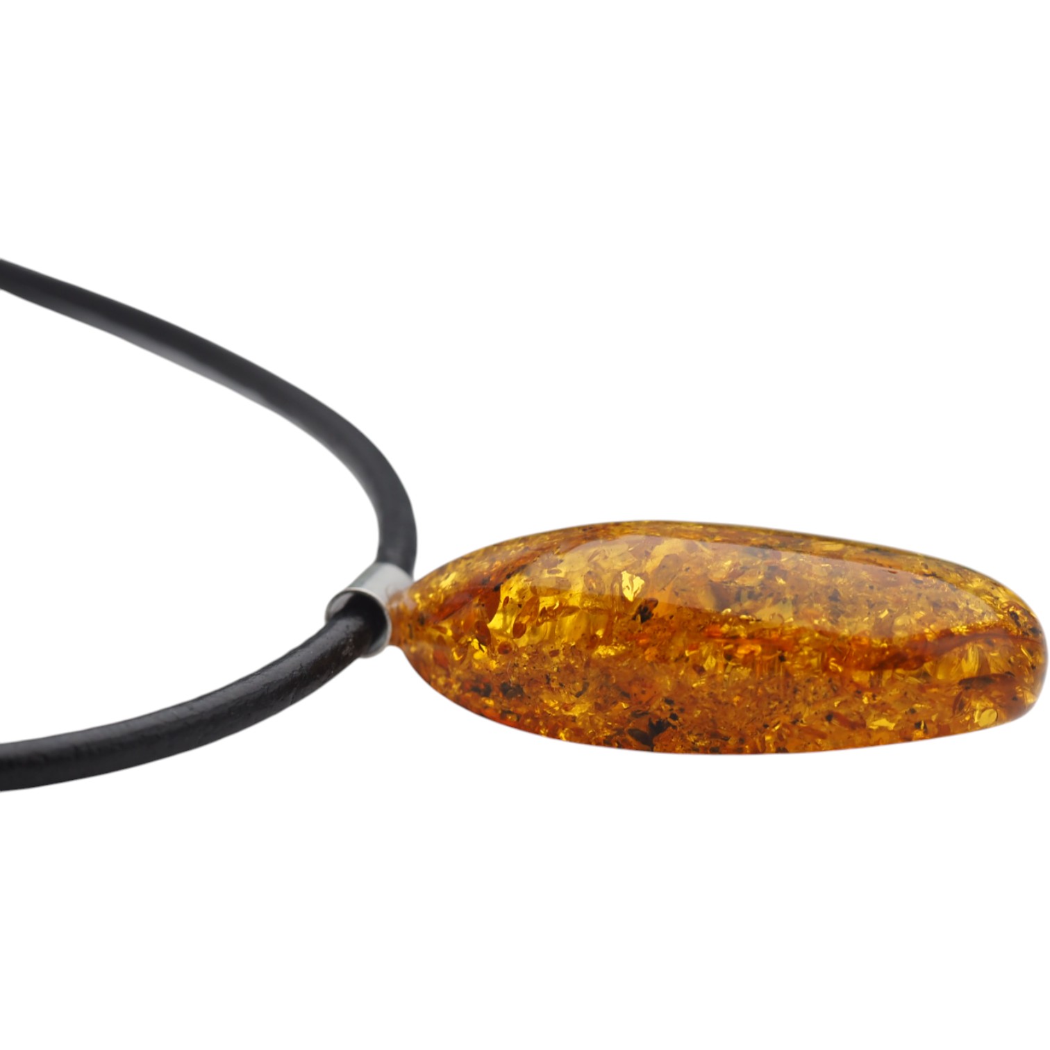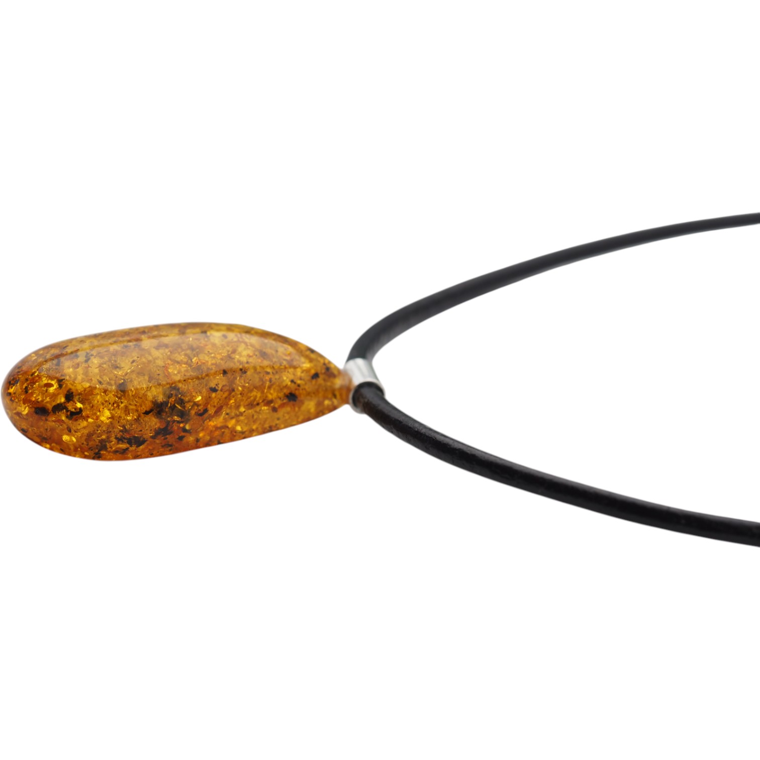 Naszyjnik na rzemieniu z ręcznie wykonaną zawieszką z naturalnego bursztynu bałtyckiego z widocznymi łuskami. Ciepły, miodowo-złoty odcień kamienia podkreśla oprawa ze srebra próby 925, nadając całości szlachetny, autorski charakter.