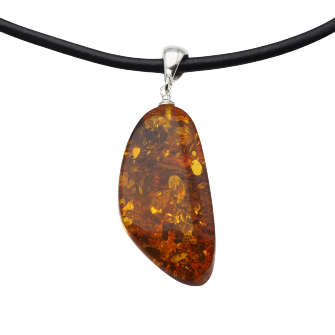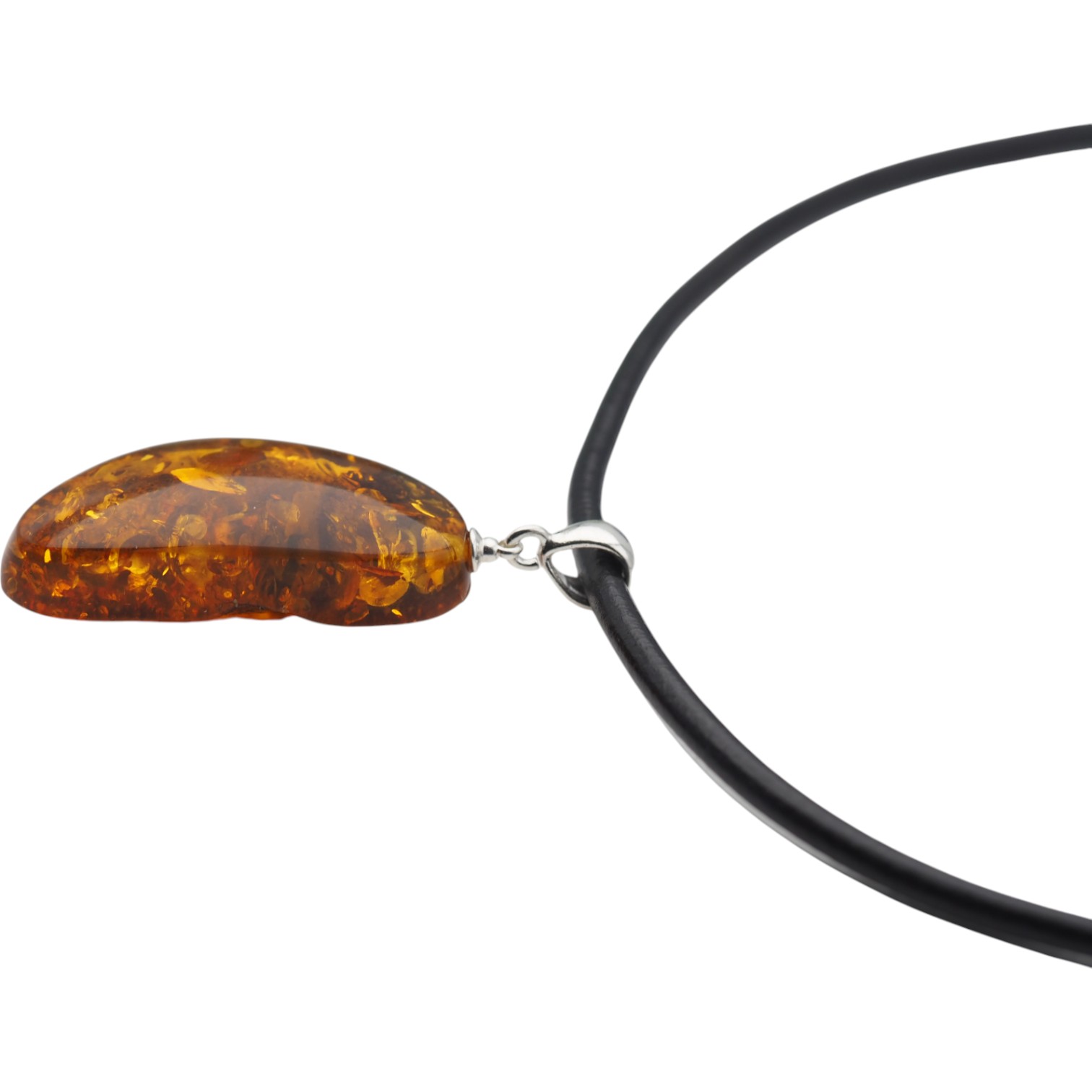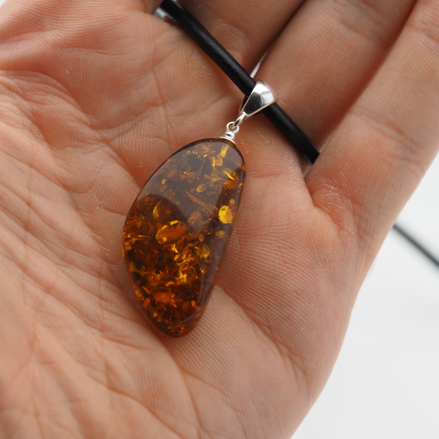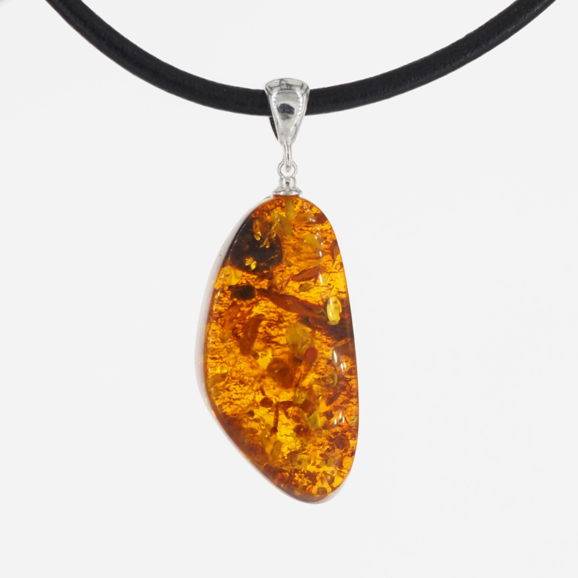 Ten naszyjnik na rzemieniu przyciąga wzrok ręcznie wykonaną zawieszką z naturalnego bursztynu bałtyckiego z widocznymi łuskami. Ciepły, miodowo-złoty odcień kamienia łączy się z chłodnym blaskiem srebra próby 925, tworząc wyrazistą, jubilerską kompozycję o naturalnym charakterze.