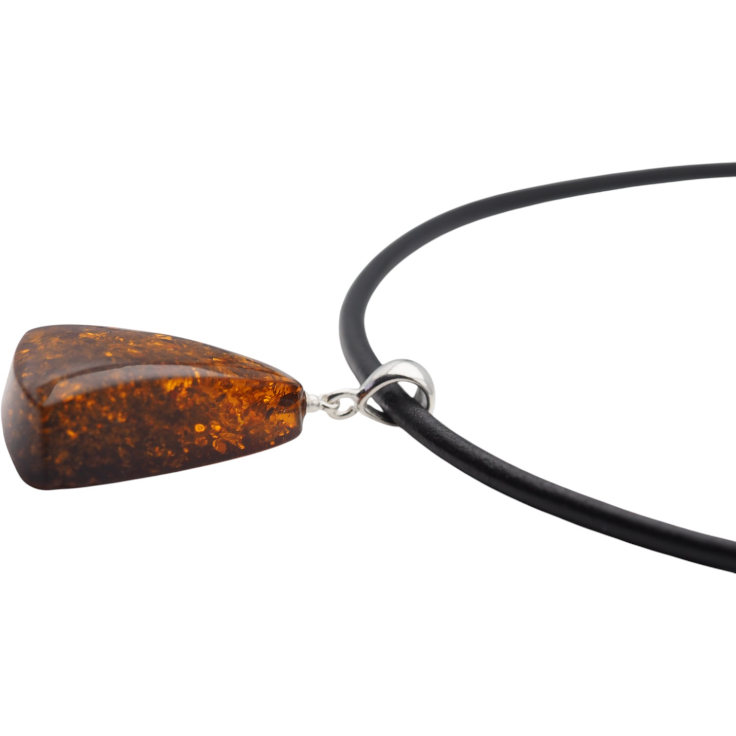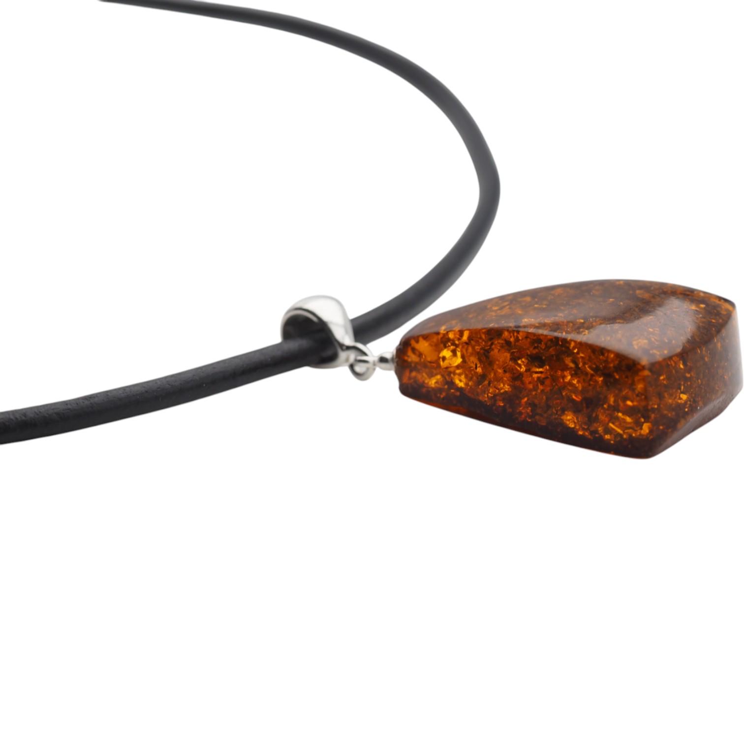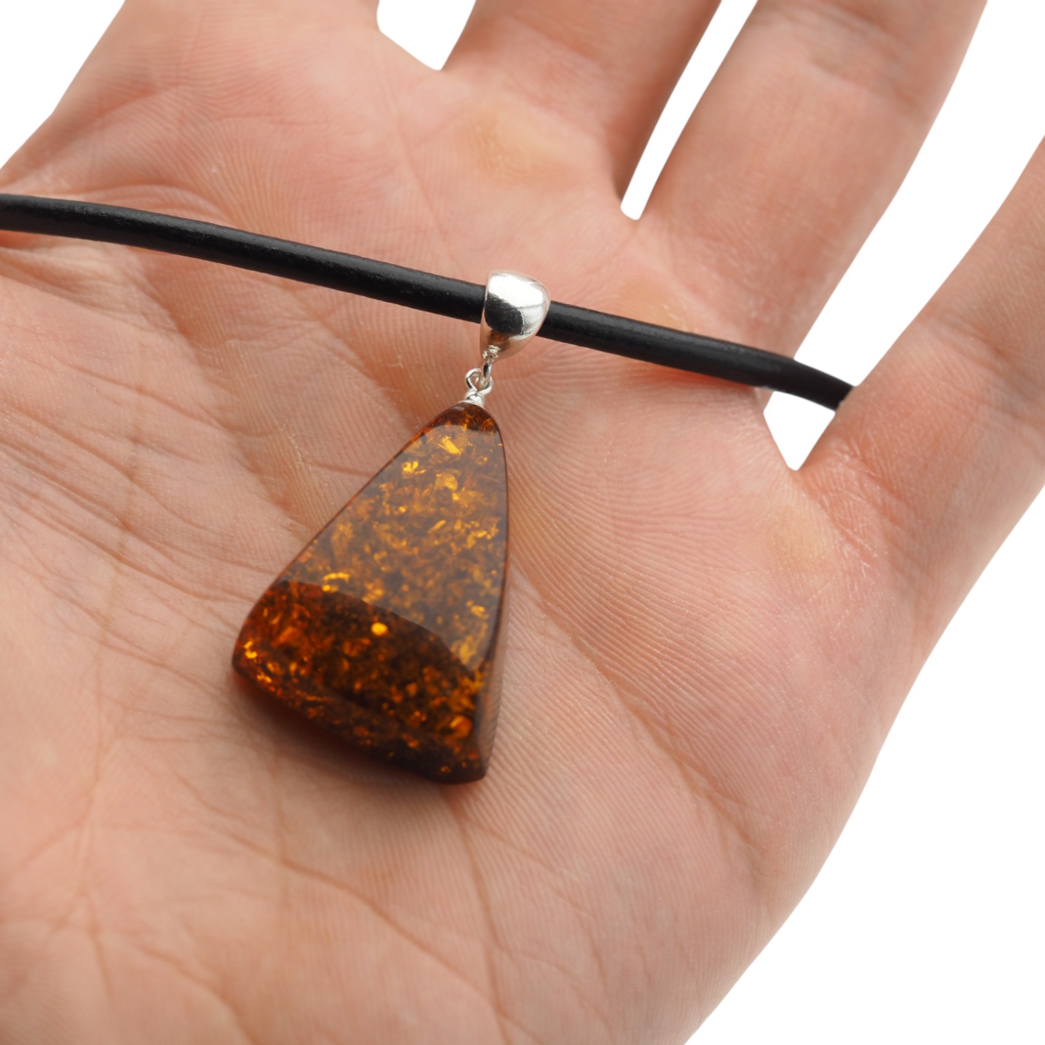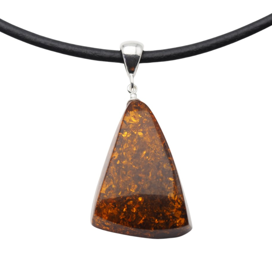 Ten ręcznie wykonany naszyjnik na rzemieniu przyciąga wzrok koniakowym bursztynem z widocznymi łuskami, który nadaje całości ciepły, naturalny charakter. Kamień został opracowany przez artystę jubilera i wykończony srebrem próby 925, dzięki czemu zawieszka wygląda szlachetnie, a jednocześnie pozostaje blisko natury.