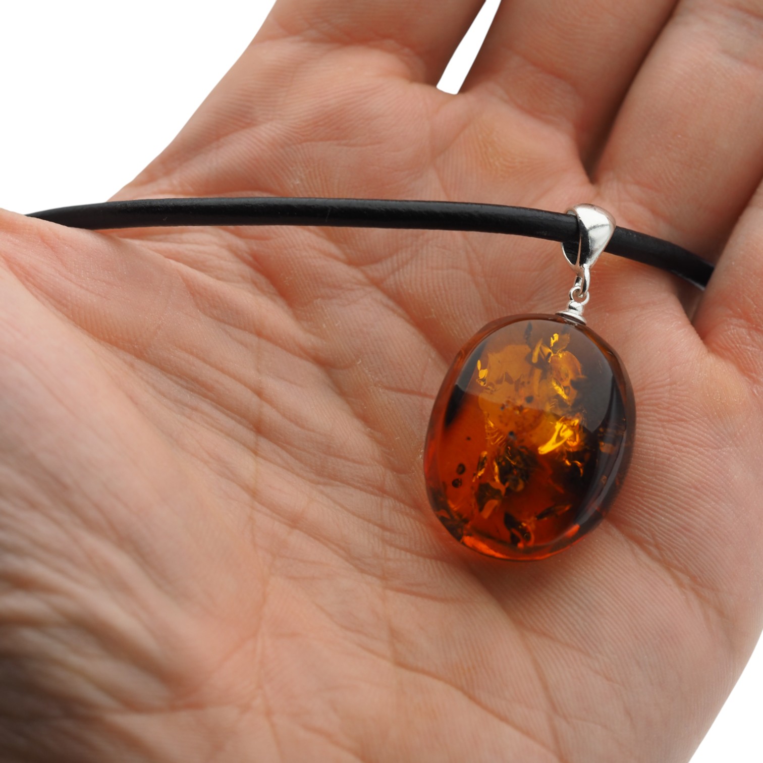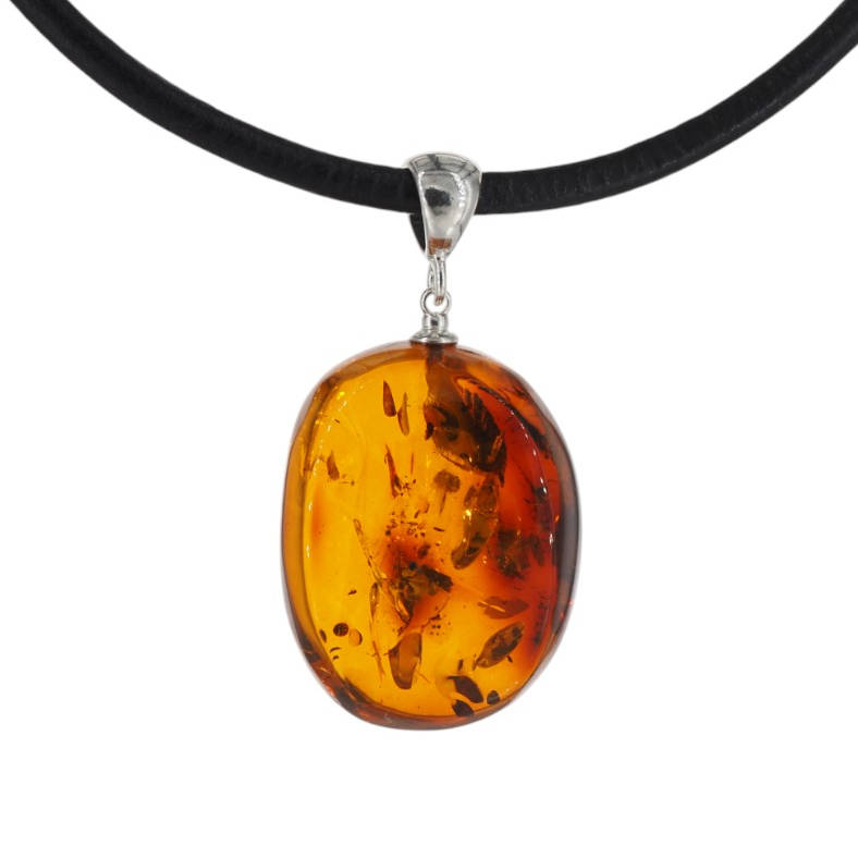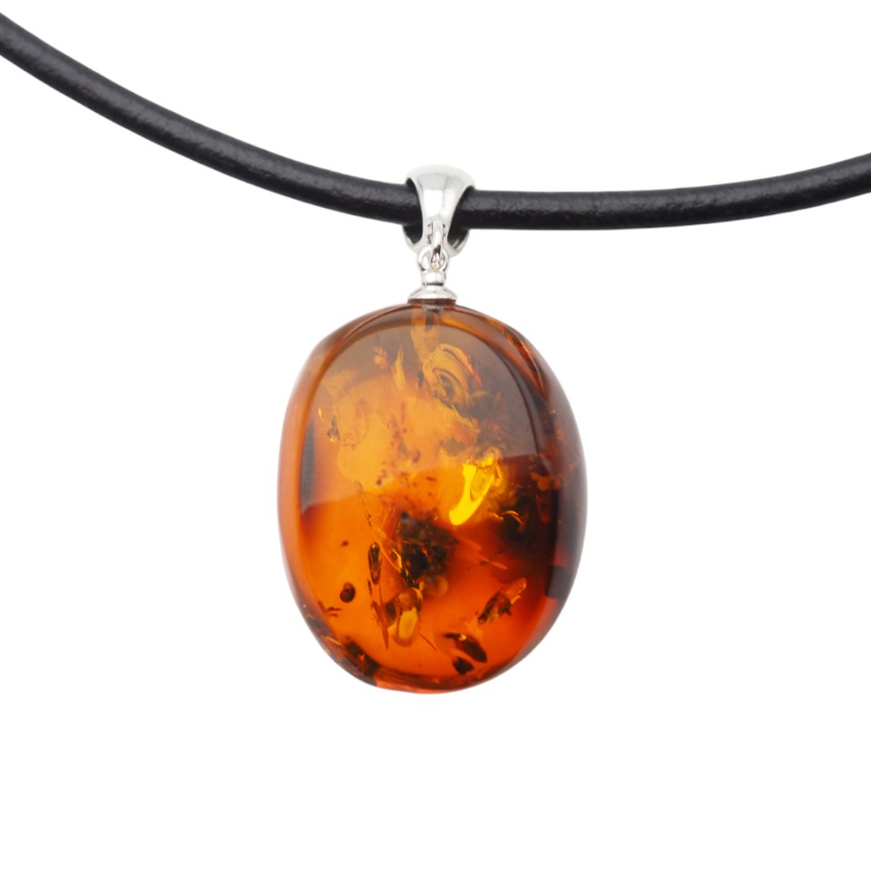Ten naszyjnik na rzemieniu przyciąga wzrok ręcznie wykonaną zawieszką z naturalnego bursztynu koniakowego z wyraźnymi łuskami. Ciepły, miodowo-koniakowy odcień kamienia pięknie kontrastuje ze srebrem próby 925, które nadaje całości jubilerski, szlachetny charakter.