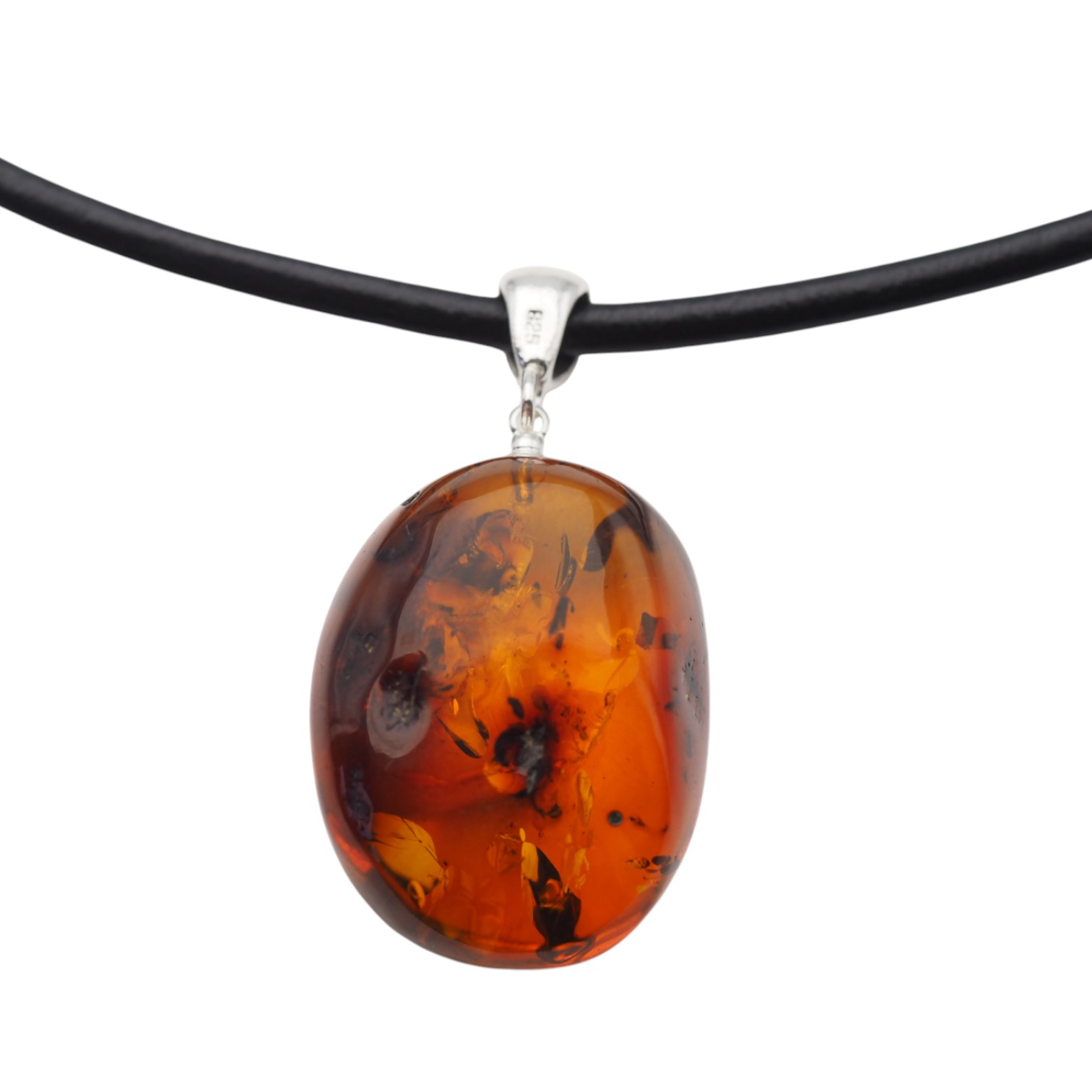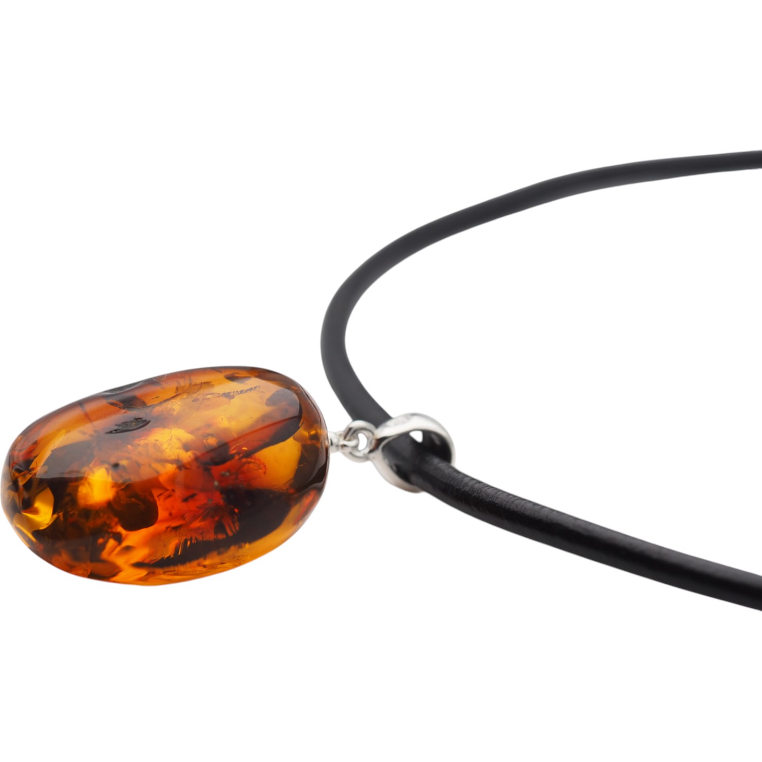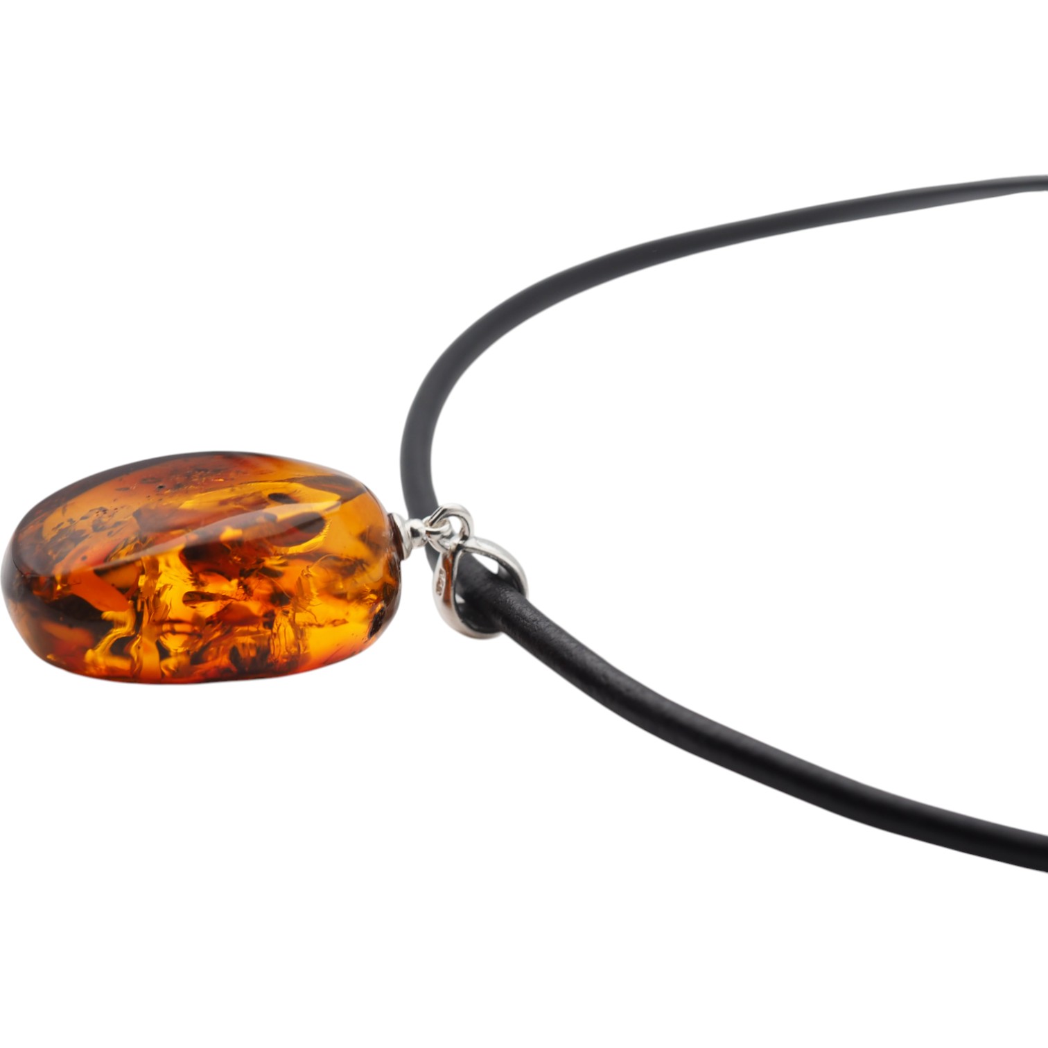 Ten naszyjnik na rzemieniu przyciąga wzrok ręcznie wykonaną zawieszką z naturalnego bursztynu koniakowego z wyraźnymi łuskami. Ciepły, miodowo-koniakowy odcień kamienia pięknie kontrastuje ze srebrem próby 925, które nadaje całości jubilerski, szlachetny charakter.