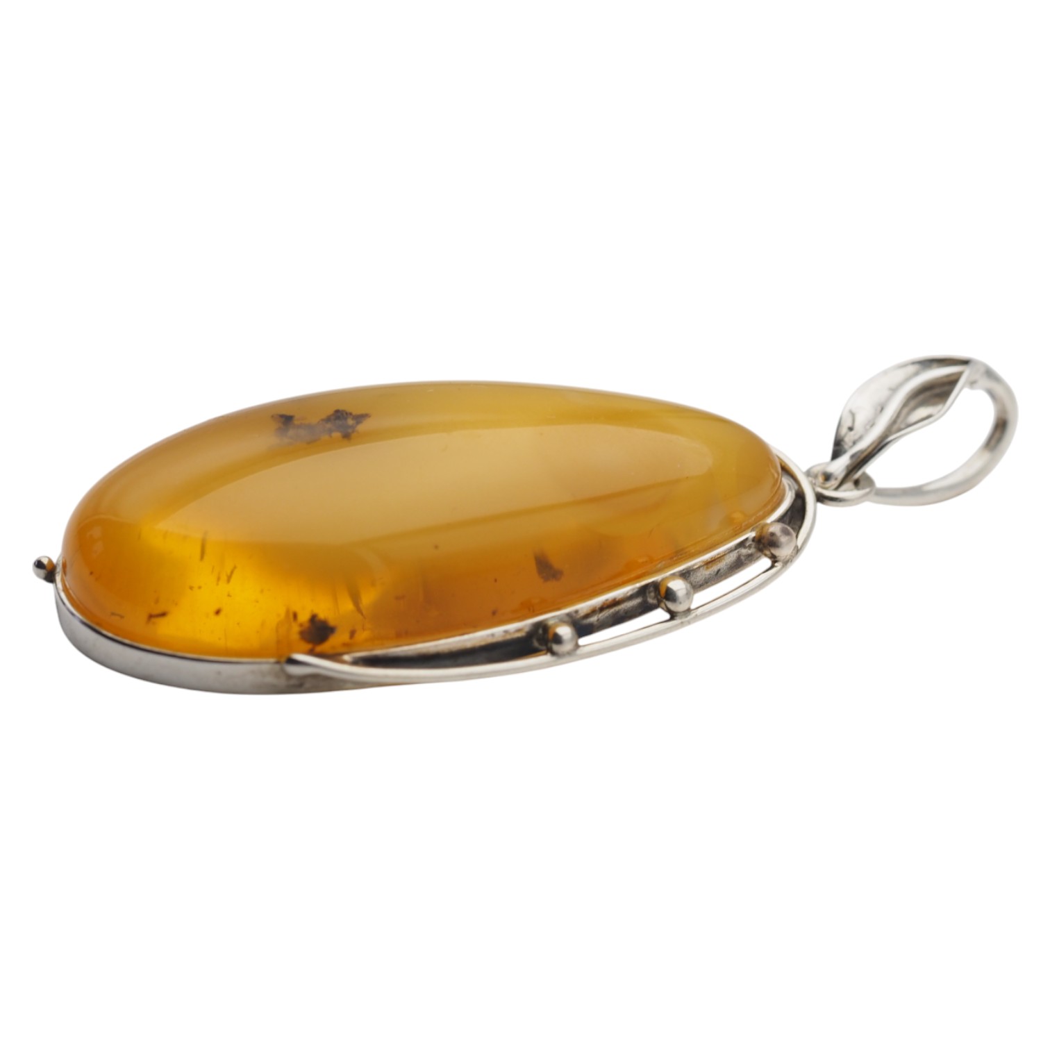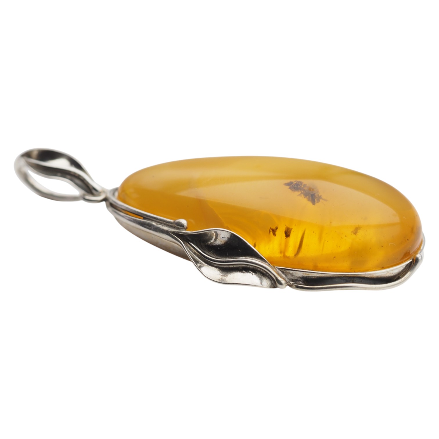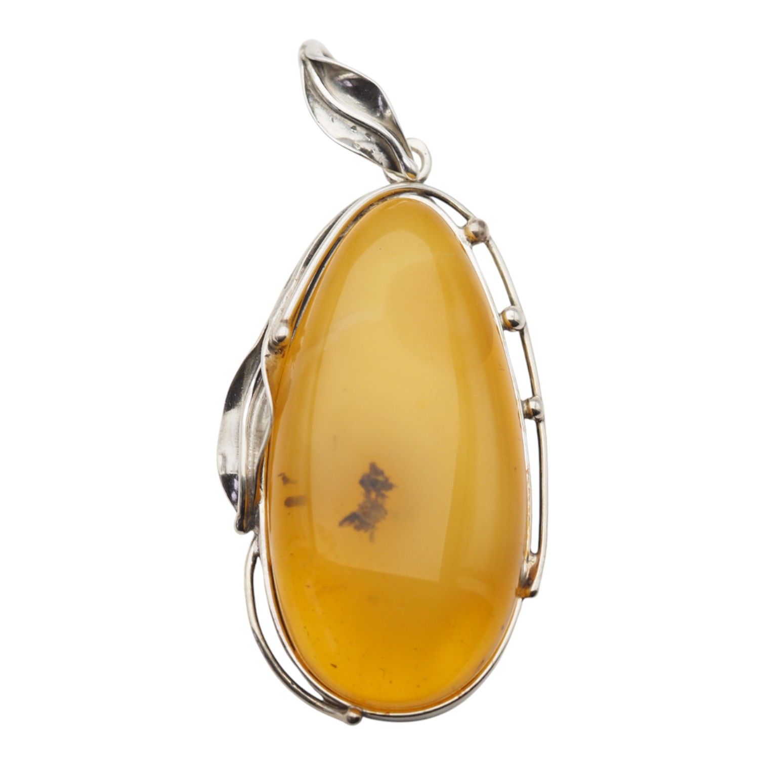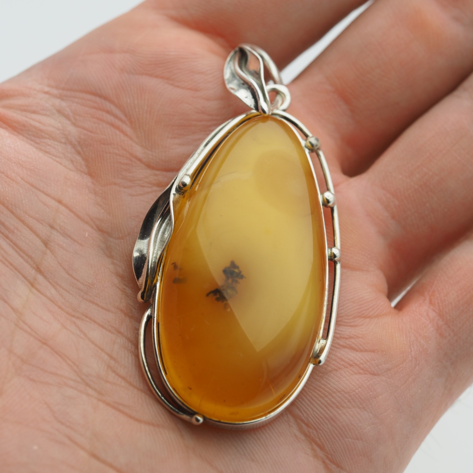 Zawieszka z naturalnym bursztynem bałtyckim przyciąga wzrok dużym kamieniem o kształcie kropli (łzy). Bursztyn ma ciepły, miodowo-mleczny odcień i jest częściowo transparentny, dzięki czemu światło subtelnie przenika przez jego organiczną strukturę. Całość oprawiono ręcznie w srebro próby 925 z oksydowanym wykończeniem, stylizowanym na delikatny motyw liści, co nadaje biżuterii charakter lekko vintage.