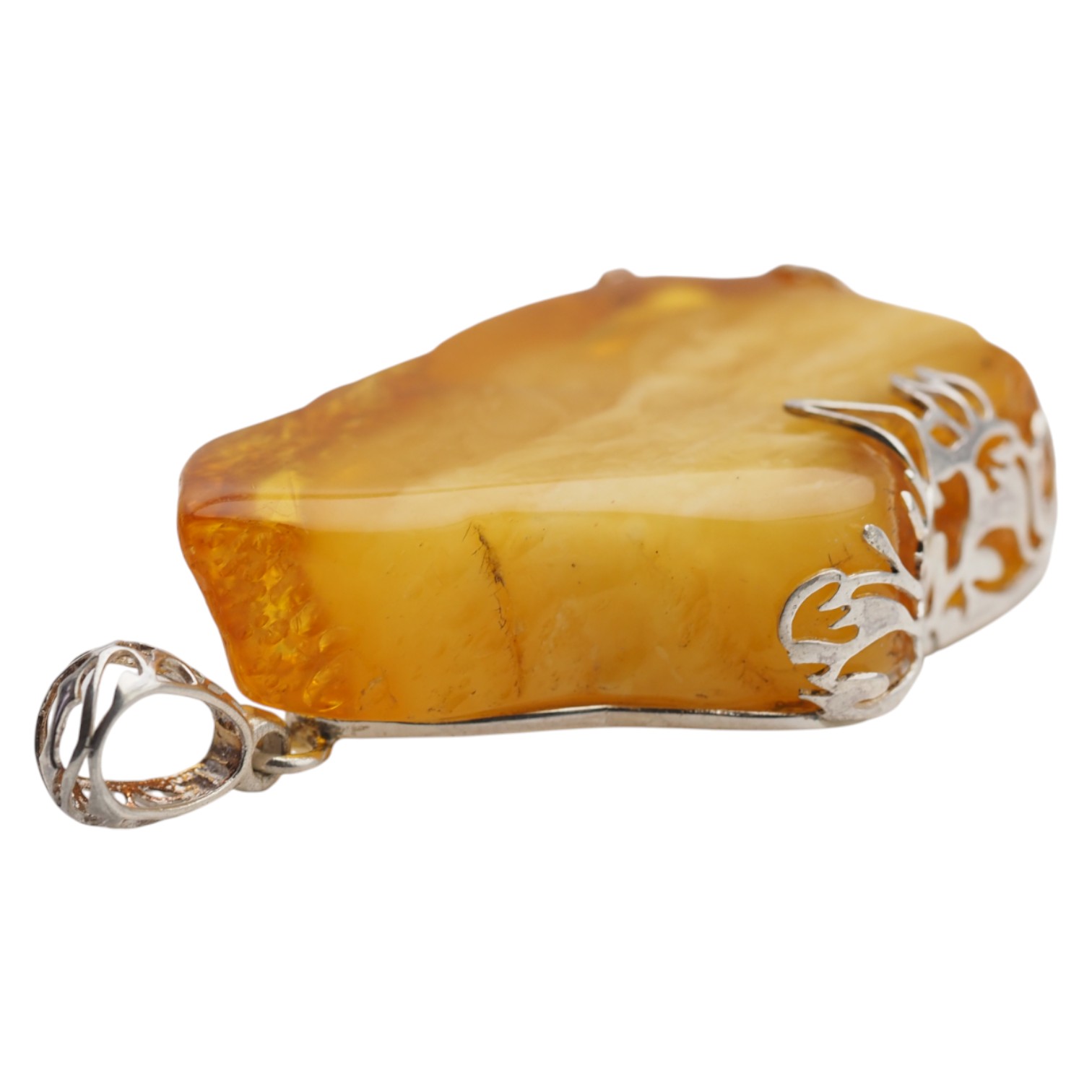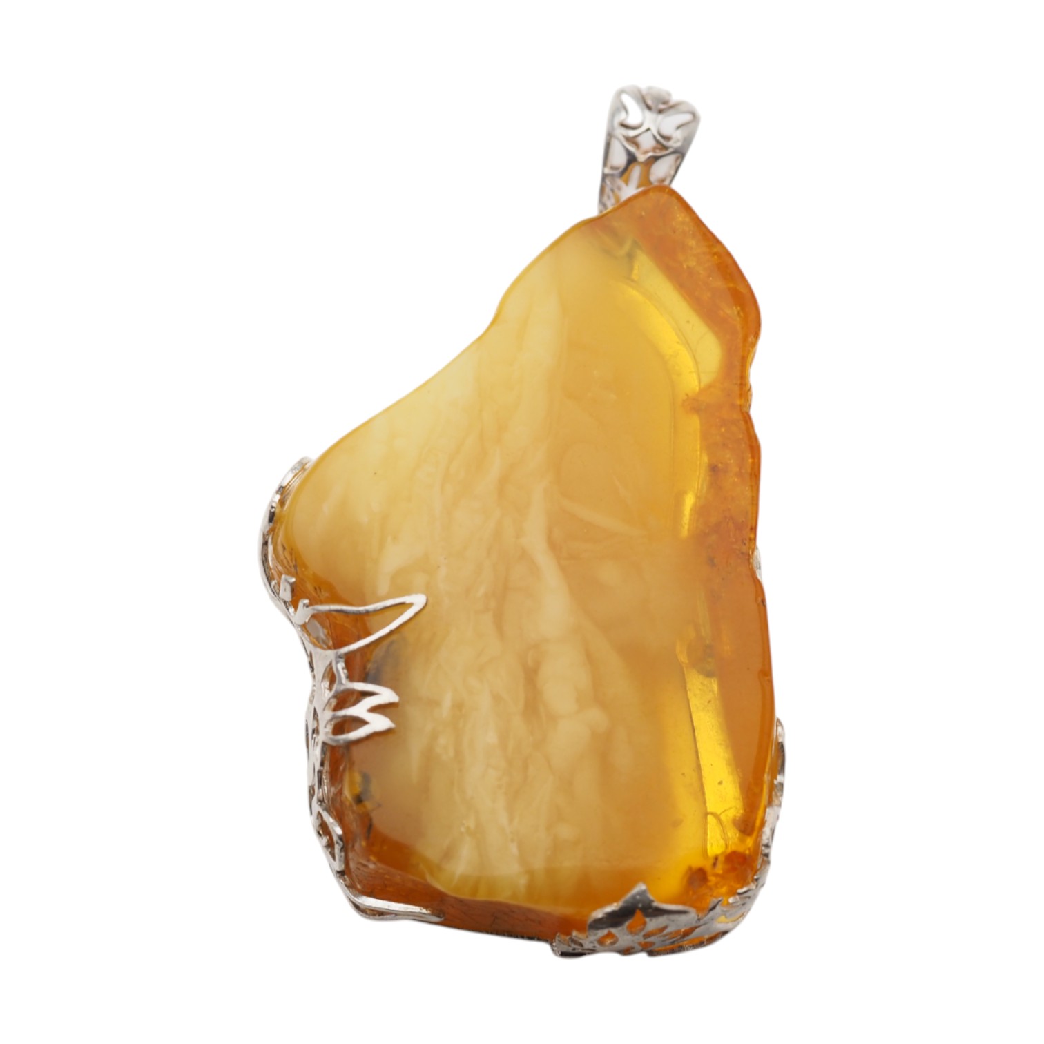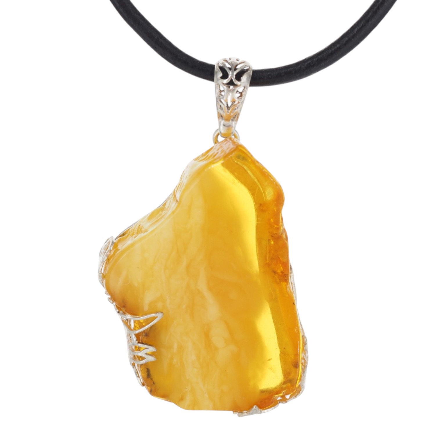 Ta zawieszka z naturalnym bursztynem bałtyckim wyróżnia się organiczną formą nieregularnego plastra. Kamień ma ciepły, miodowo‑mleczny odcień i jest częściowo transparentny, z delikatną, falującą strukturą. Bursztyn został wypolerowany, ale zachował miejscami bardziej surowy charakter, co podkreśla jego naturalne pochodzenie.