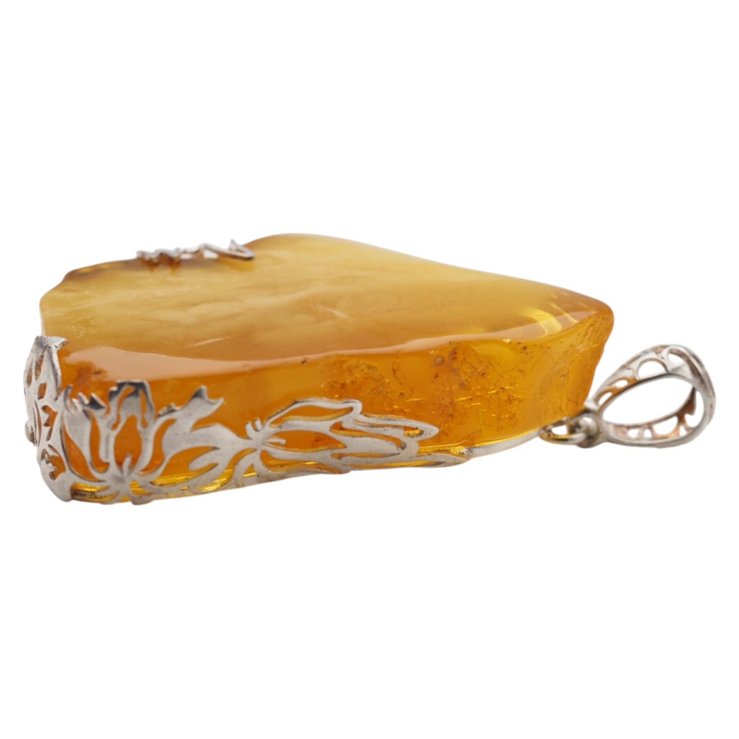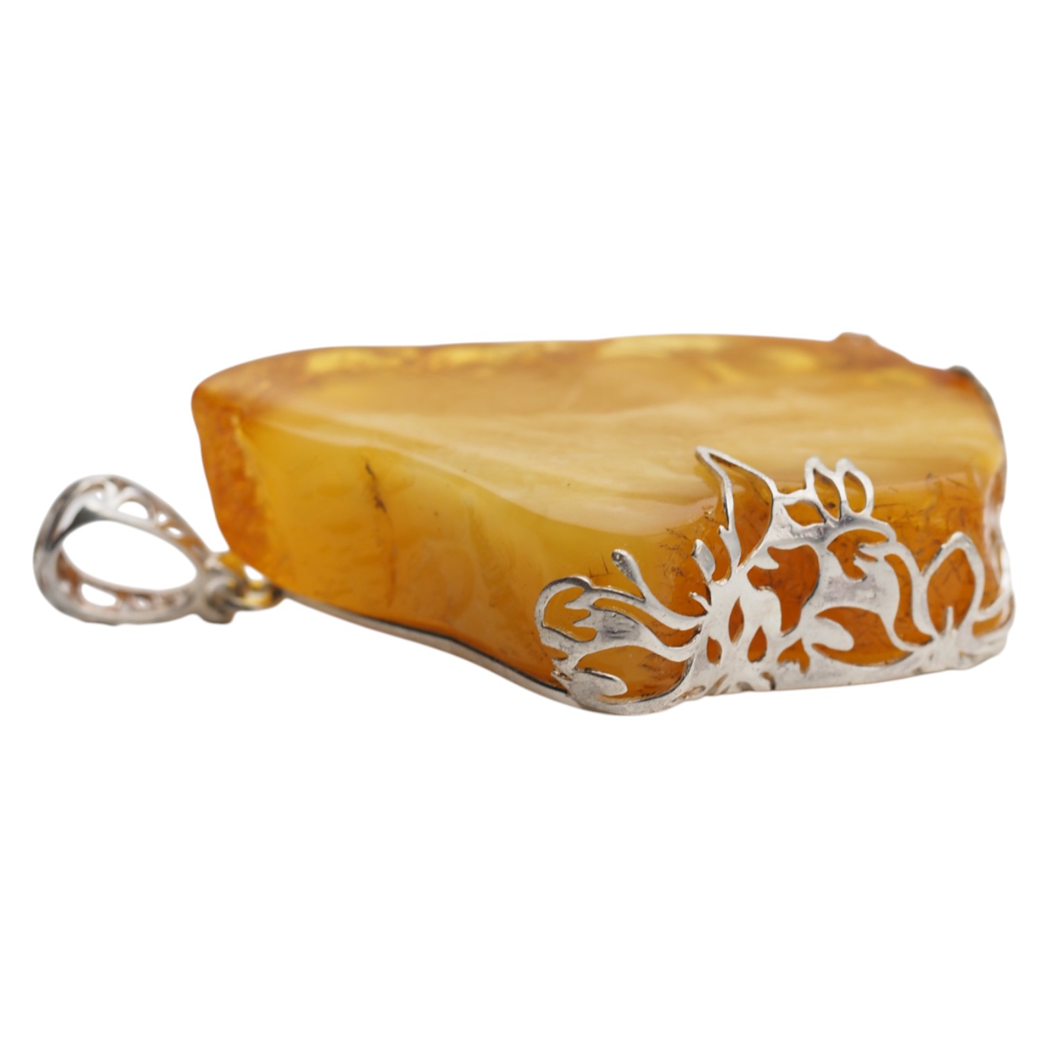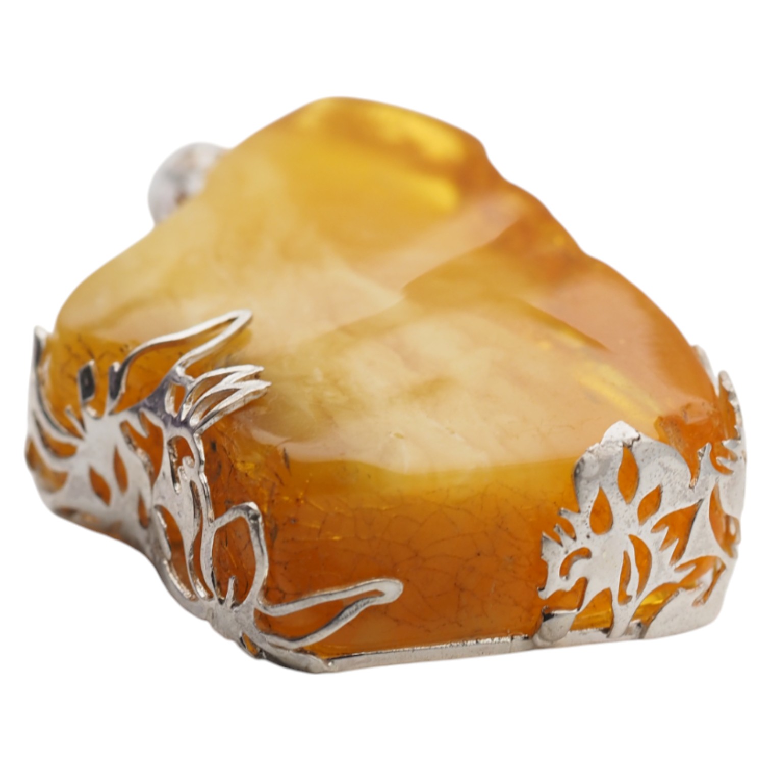 Ręcznie dopracowana oprawa ze srebra próby 925 otula bursztyn motywem kwiatów, pozostawiając dużą część powierzchni kamienia odsłoniętą. To biżuteria w estetyce nature‑style: artystyczna, wyrazista i jednocześnie elegancka — dobrze wygląda zarówno na co dzień, jak i jako mocny akcent do prostych stylizacji.
