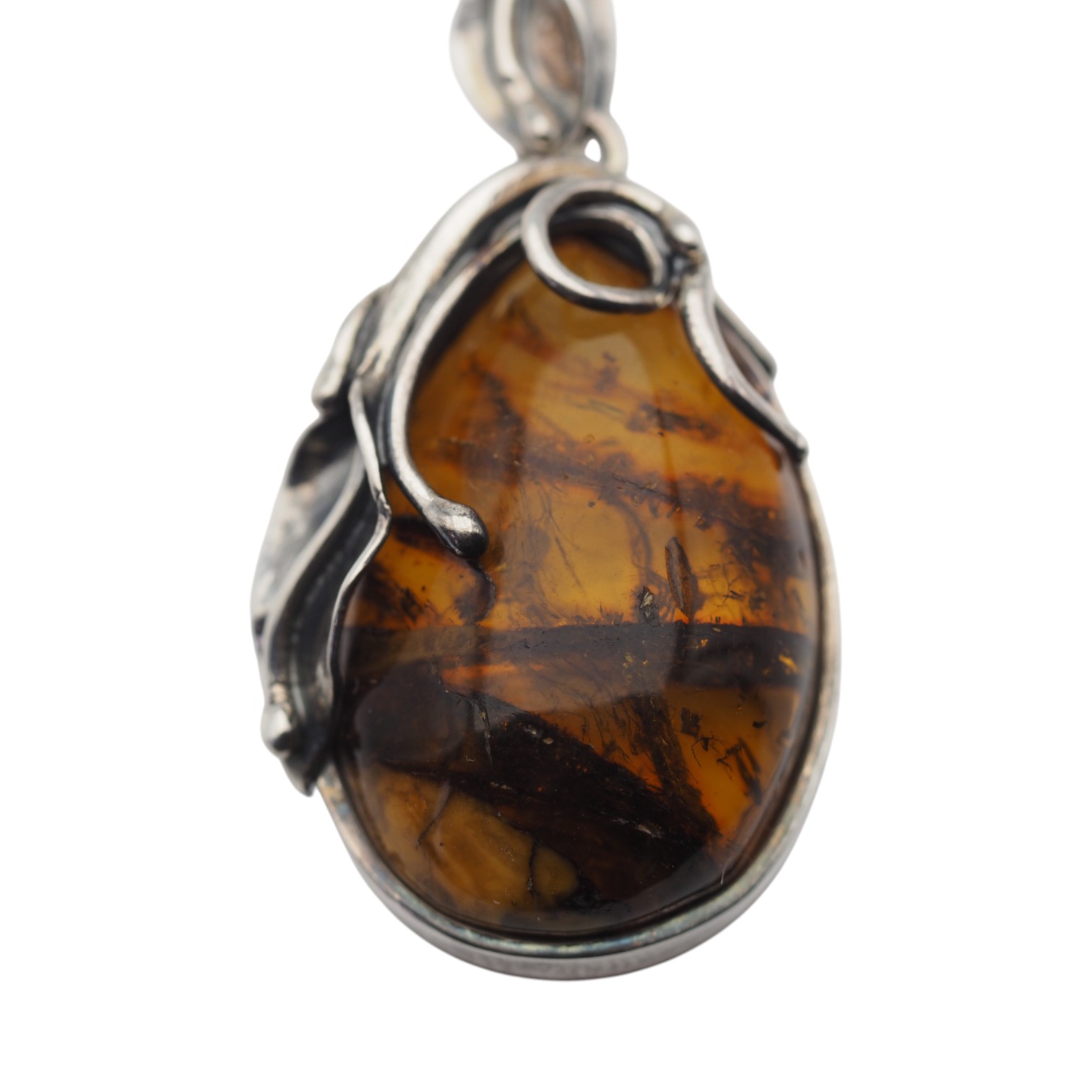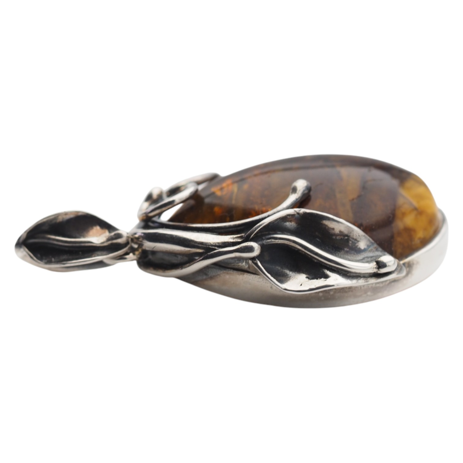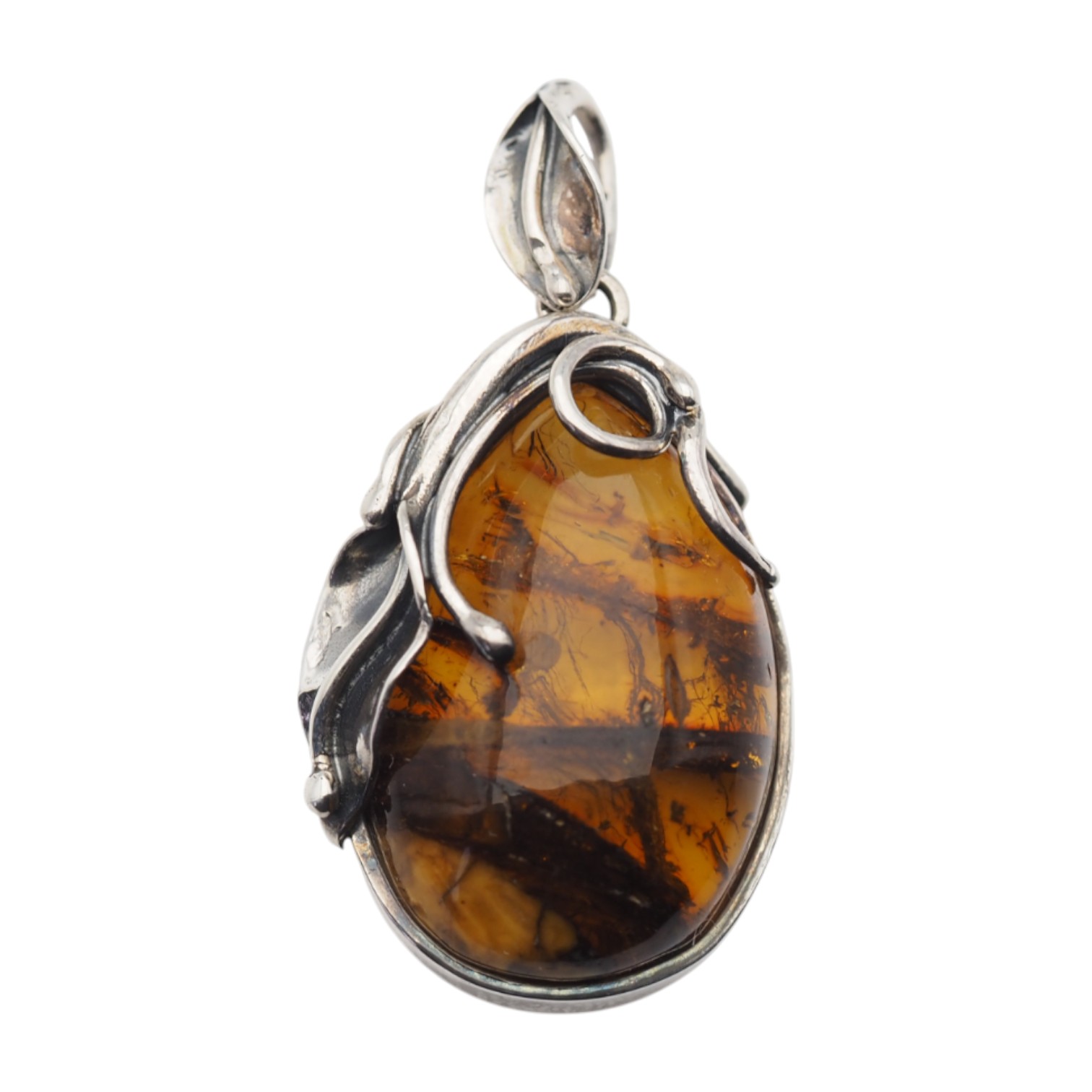 - oprawa lub sposób mocowania: ręcznie formowana oprawa srebrna z motywem liści, do noszenia na łańcuszku lub rzemieniu