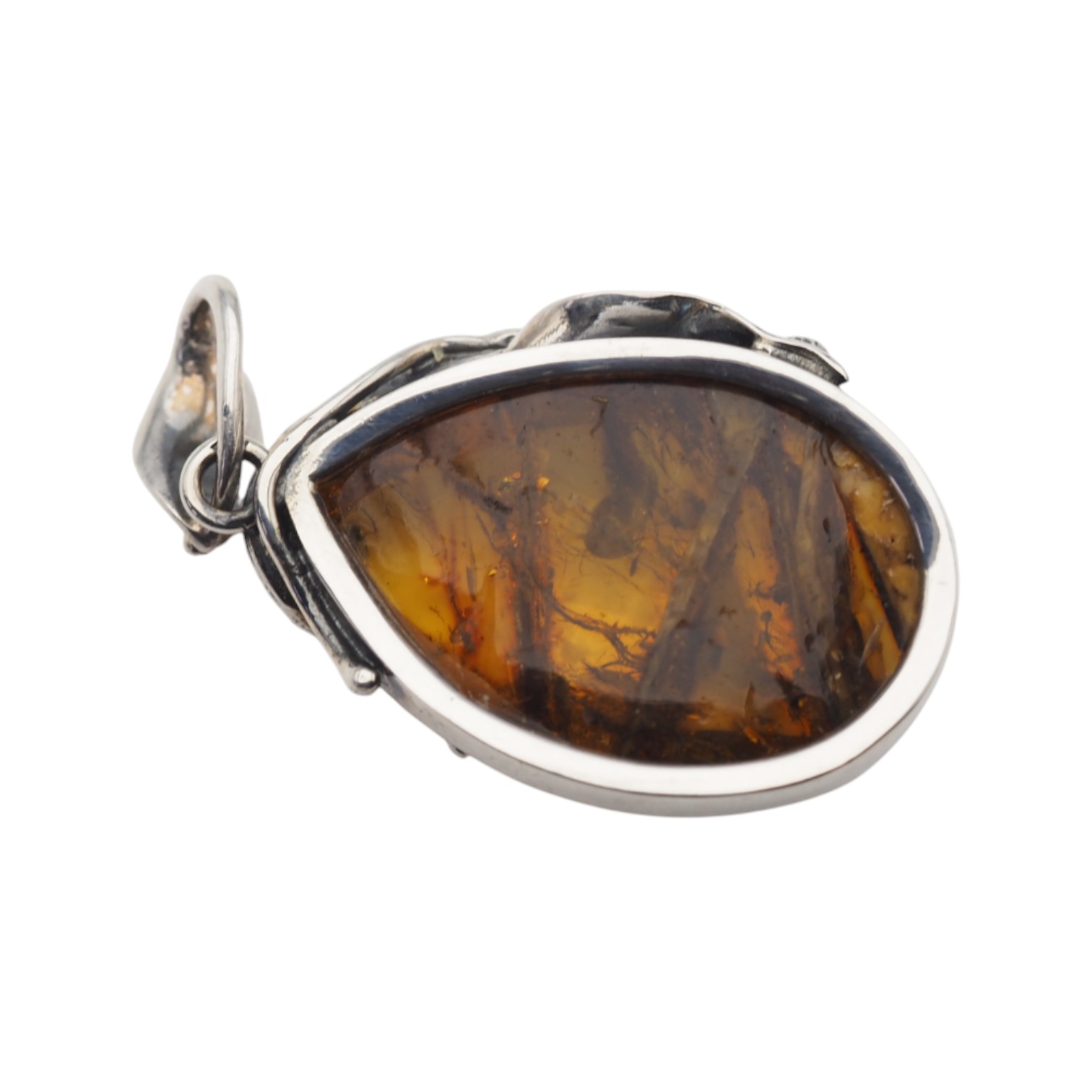 Wyrazista zawieszka z naturalnym bursztynem bałtyckim w kształcie kropli, oprawiona ręcznie w srebro próby 925 z oksydowanym wykończeniem. Kamień ma intensywny, miodowo-złoty odcień, miejscami jest transparentny, a pod światło widać naturalne inkluzje organiczne, które nadają całości głębi i niepowtarzalnego charakteru.