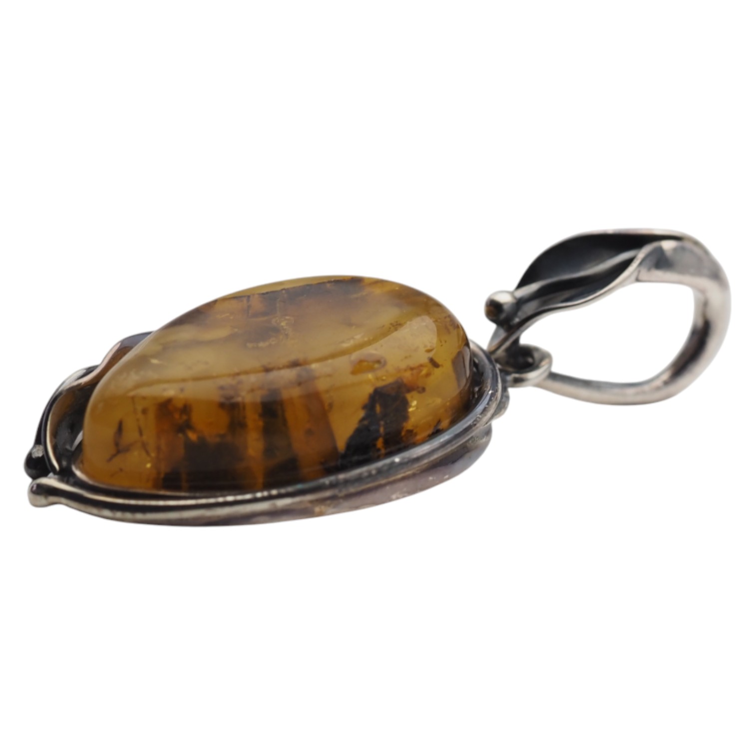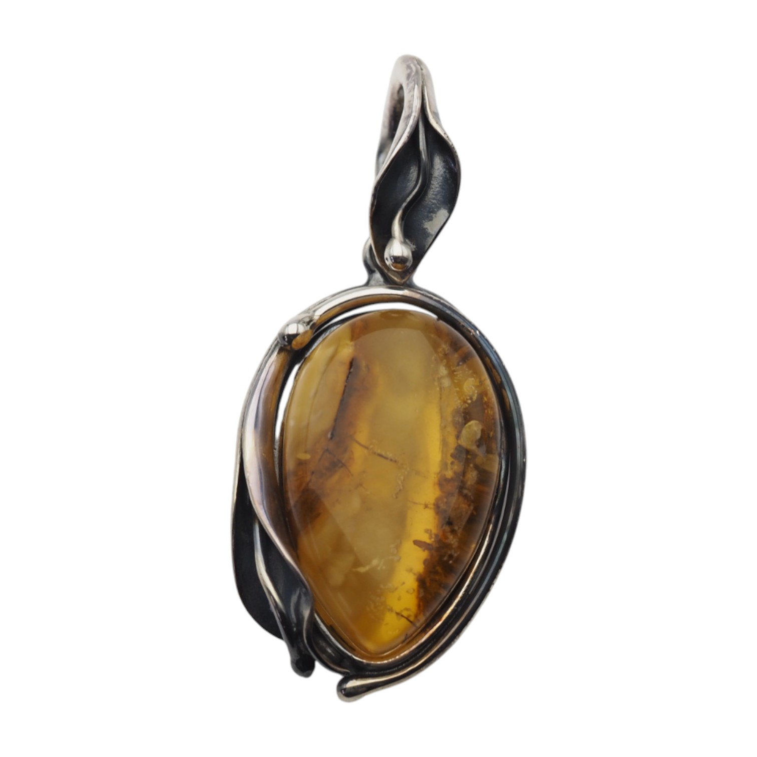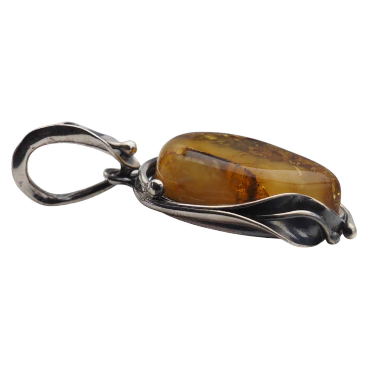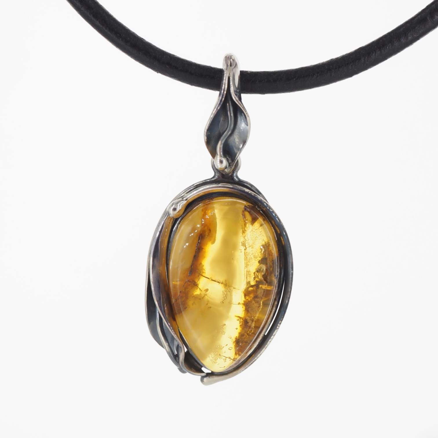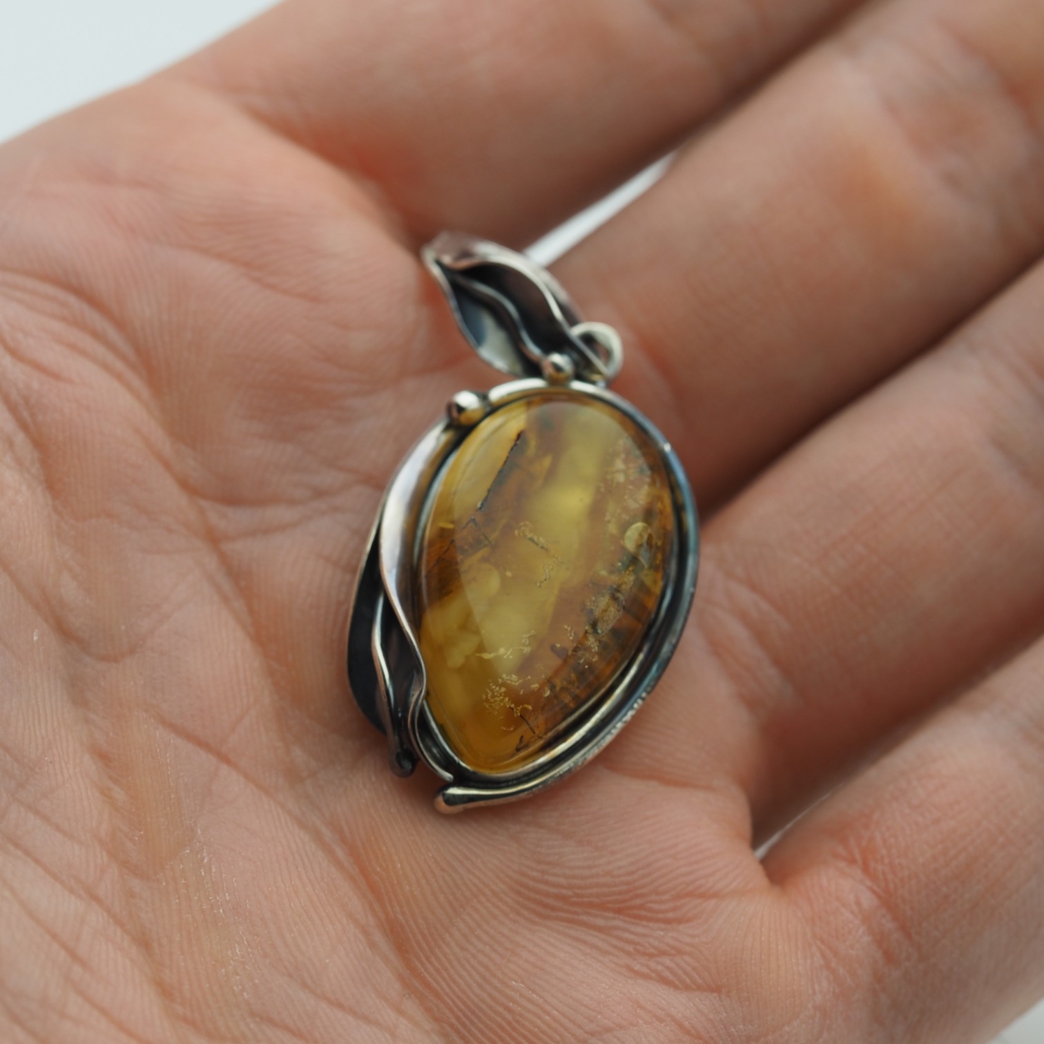 Bursztyn osadzono w ręcznie wykonanej oprawie ze srebra próby 925, oksydowanej, z motywem liści oplatających kamień. Całość wygląda surowo, ponadczasowo i bardzo naturalnie – to zawieszka, którą łatwo dopasować zarówno do codziennych stylizacji, jak i bardziej eleganckich zestawów, a także wybrać na symboliczny prezent.