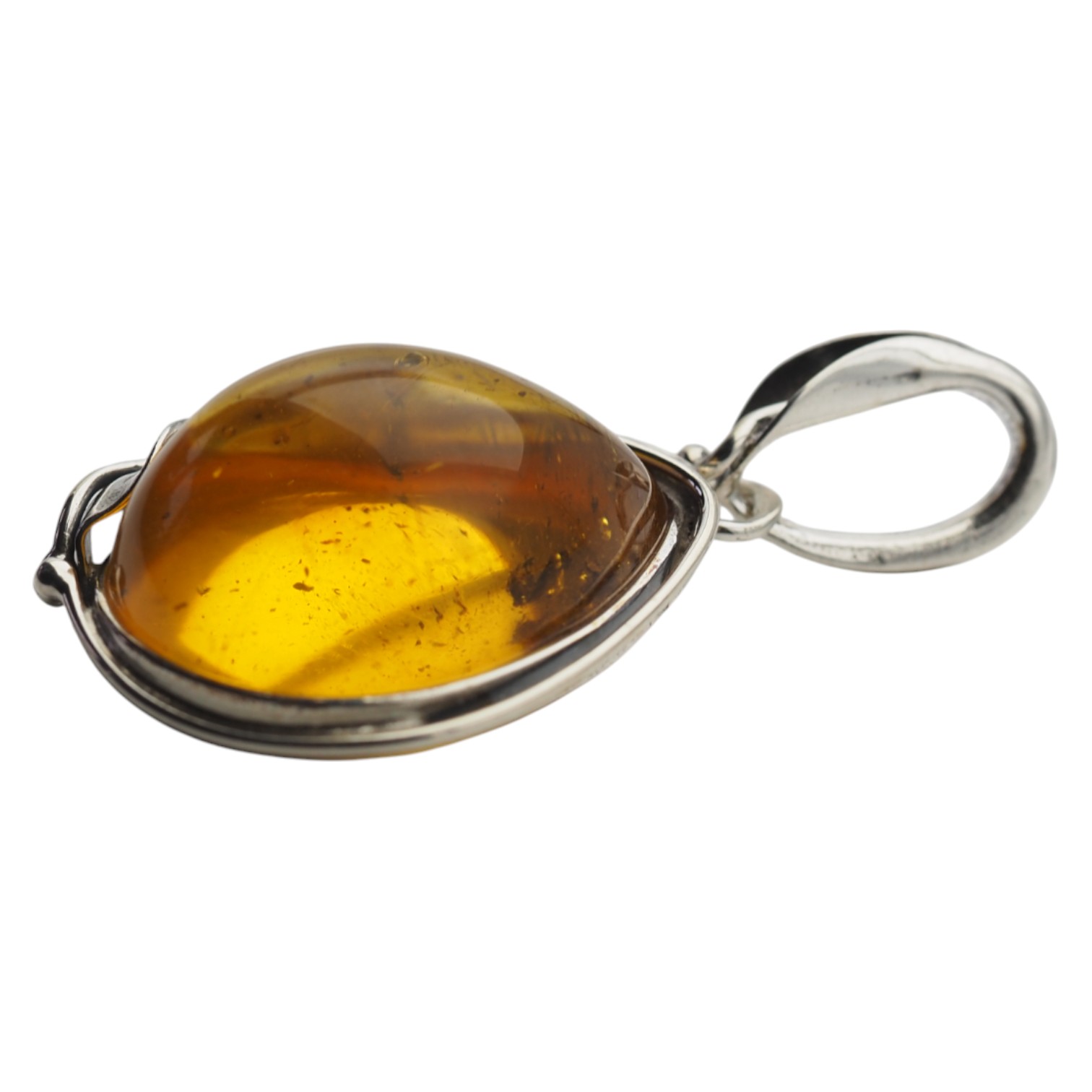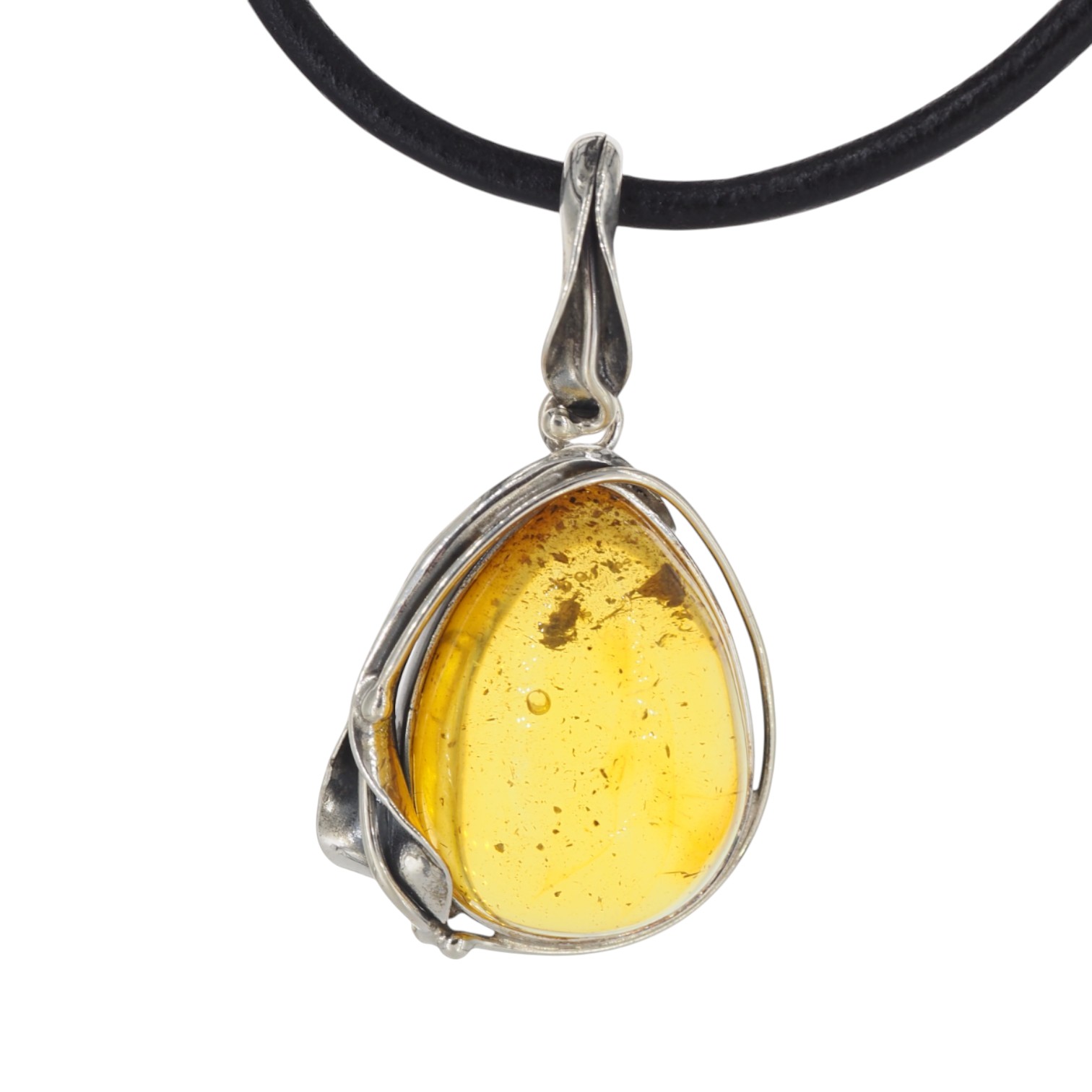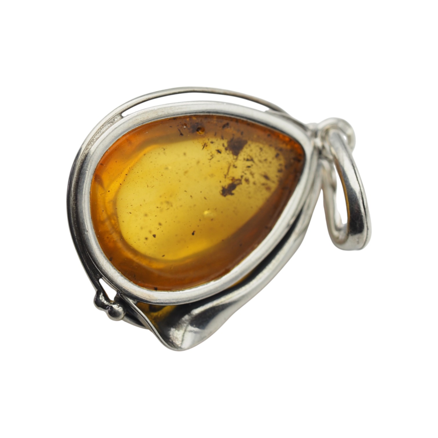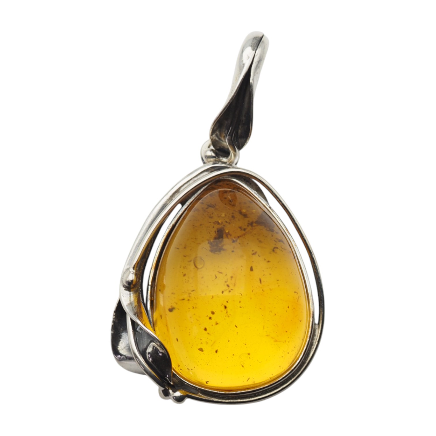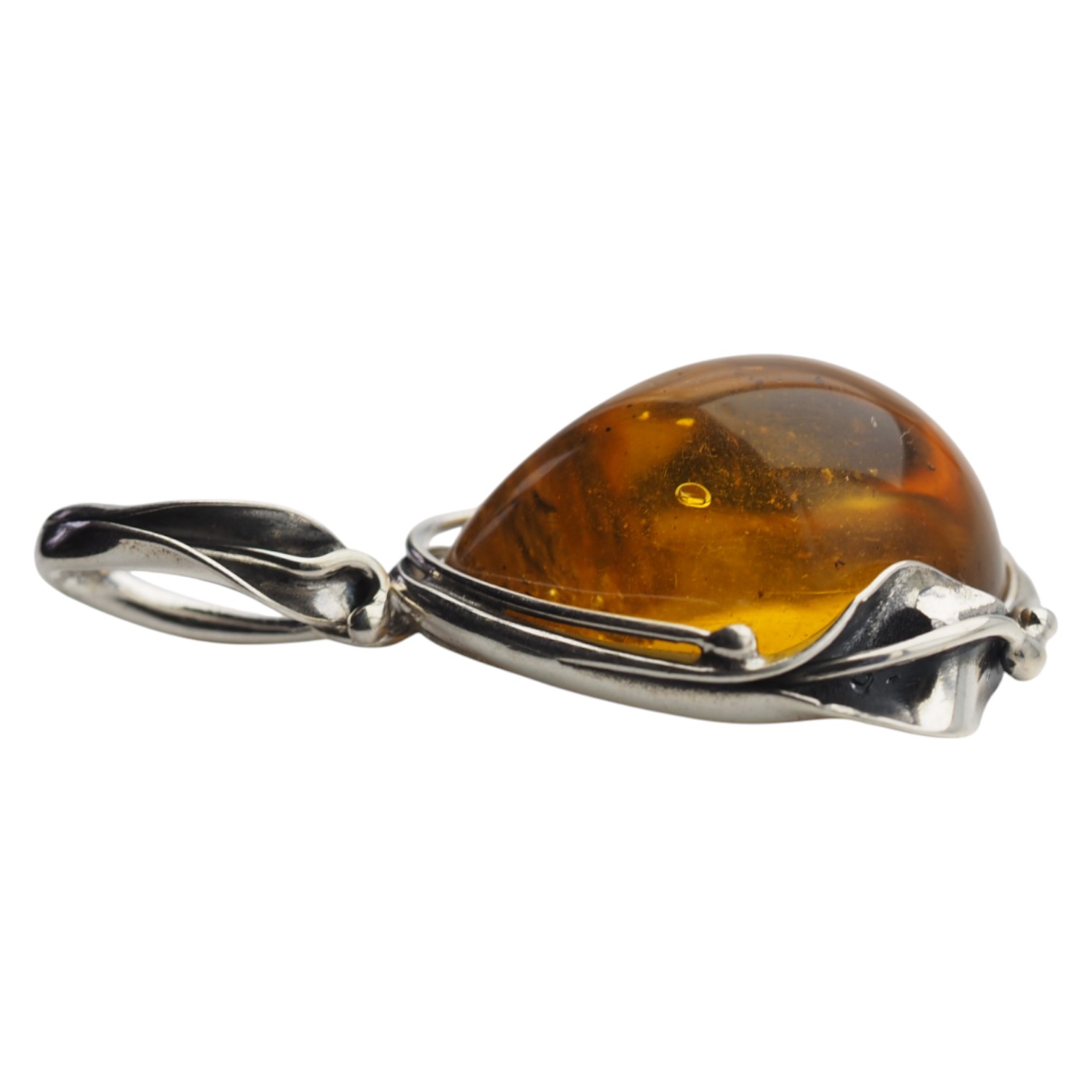 Wyrazista zawieszka z naturalnym bursztynem bałtyckim w odcieniu miodowo‑złotym, miejscami delikatnie transparentnym. Kamień ma formę owalnej kropli i został wypolerowany tak, by pod światło wydobyć jego naturalny rysunek oraz organiczne inkluzje (struktury roślinne). Całość zamyka ręcznie formowana oprawa ze srebra próby 925 z oksydowanym wykończeniem i dekoracyjnym motywem liści oplatających bursztyn.
