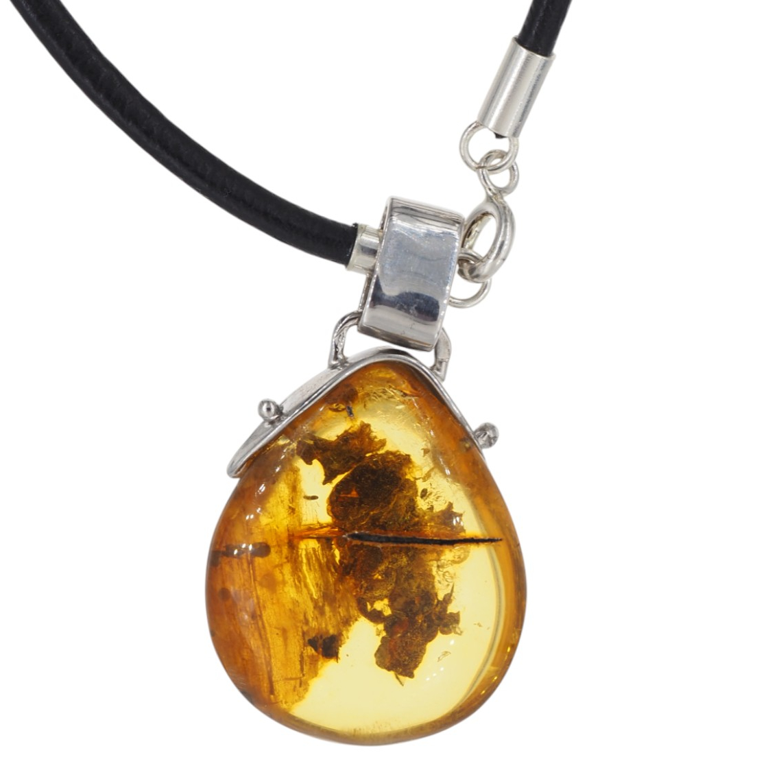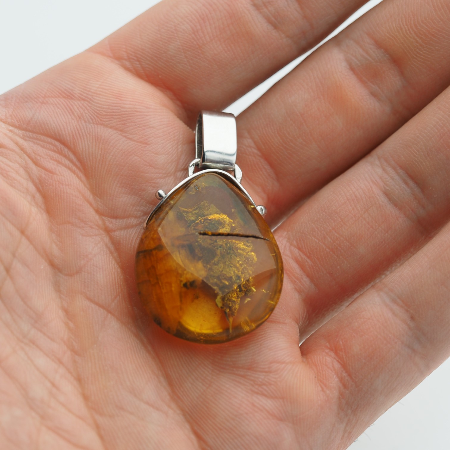 Zawieszka z naturalnym bursztynem bałtyckim przyciąga wzrok ciepłym, miodowo‑złotym kolorem i subtelną grą światła. Kamień ma formę owalnej kropli, jest częściowo przezroczysty, a pod światło widać naturalne inkluzje organiczne (roślinne) oraz mineralne, które dodają mu głębi i unikalnego charakteru.