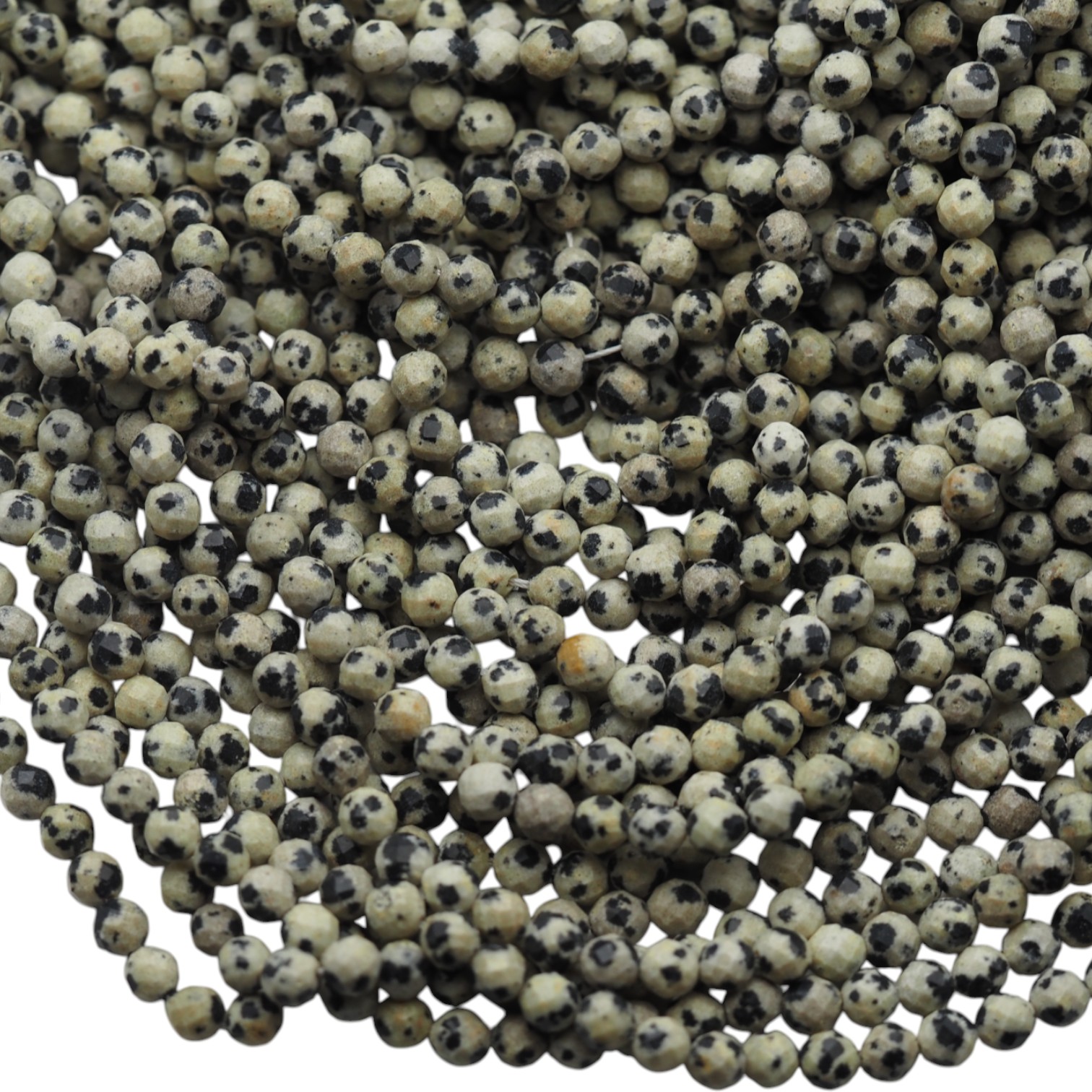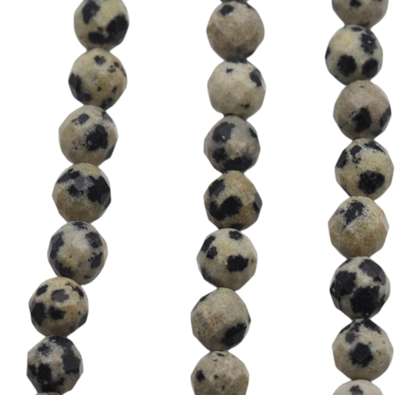 Jaspis dalmatyński w formie fasetowanej kulki wyróżnia się jasną bazą z kontrastowymi, ciemnymi plamkami. Fasetowanie dodaje subtelnego połysku i podkreśla jubilerski charakter półfabrykatu.