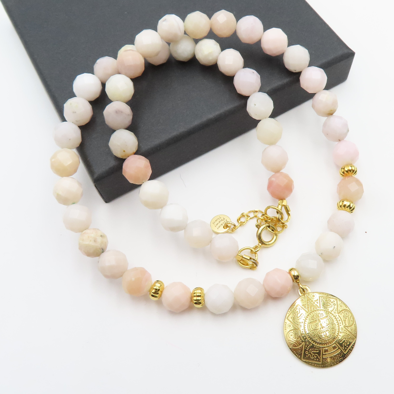 Subtelny naszyjnik z opalem różowym i dekoracyjną zawieszką w formie blaszki we wzorze azteckim to połączenie delikatnego, pastelowego akcentu z wyrazistym detalem. Całość została wykonana w srebrze złoconym, co dodaje biżuterii ciepłego, eleganckiego wykończenia.