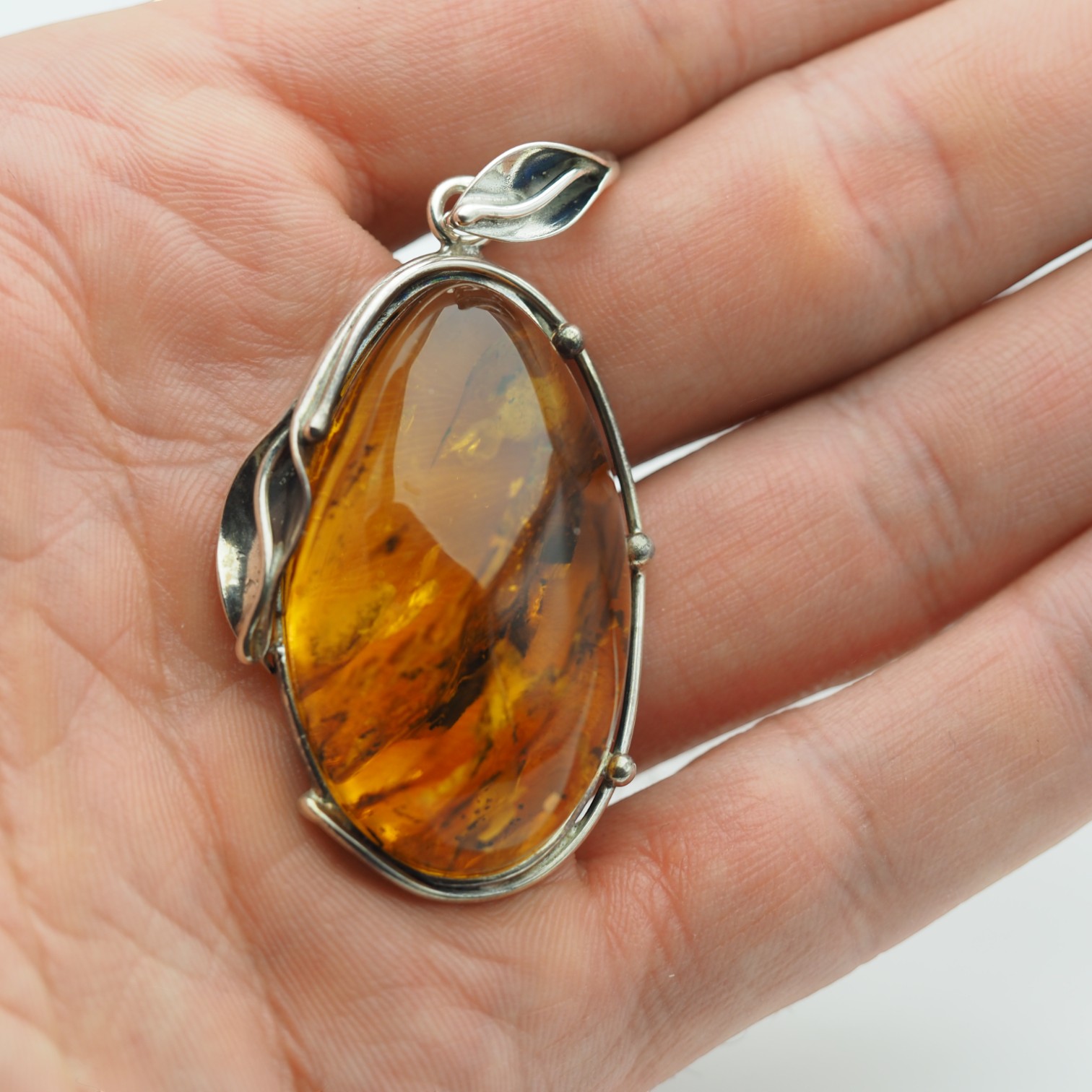 Srebro formowane ręcznie z motywem liści – podkreśla naturalny charakter bursztynu