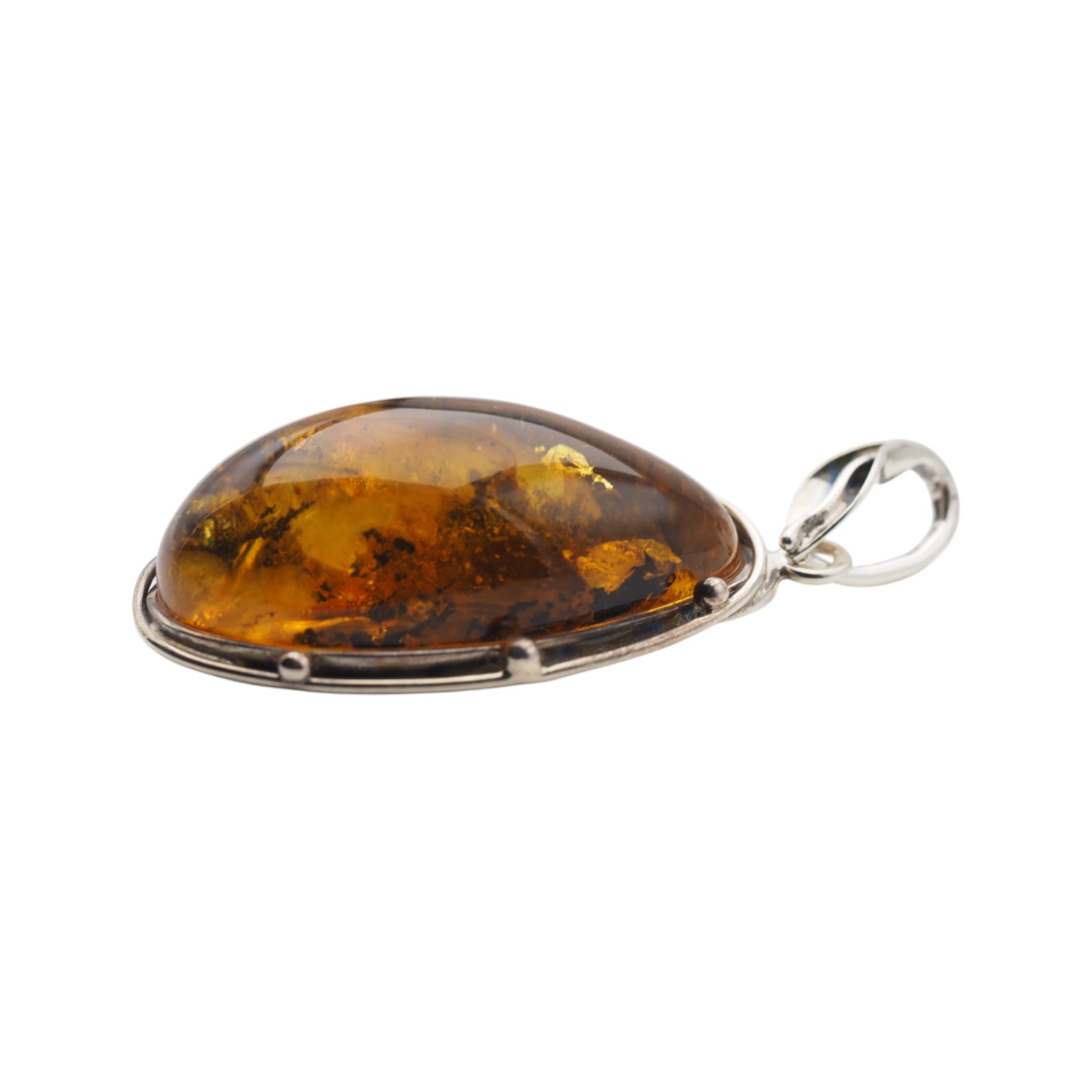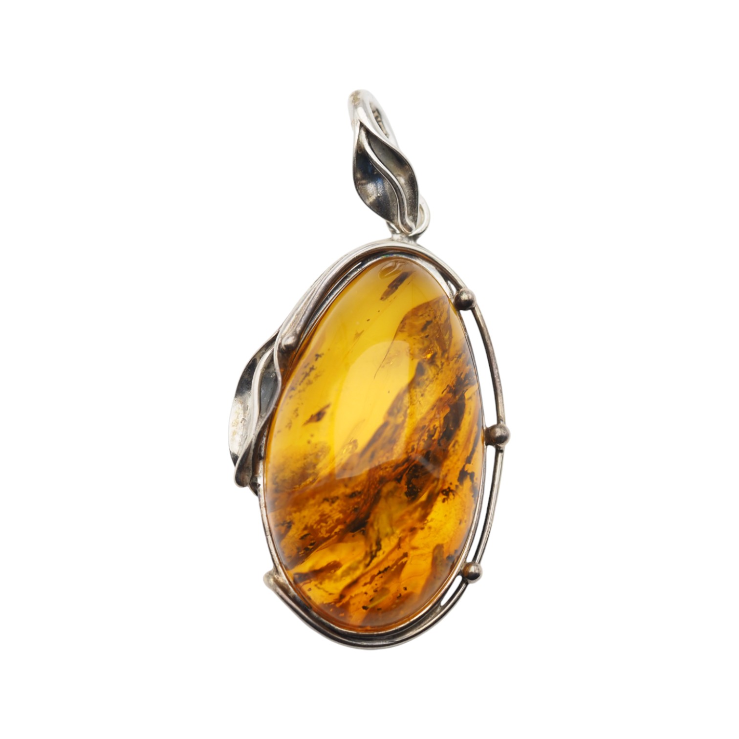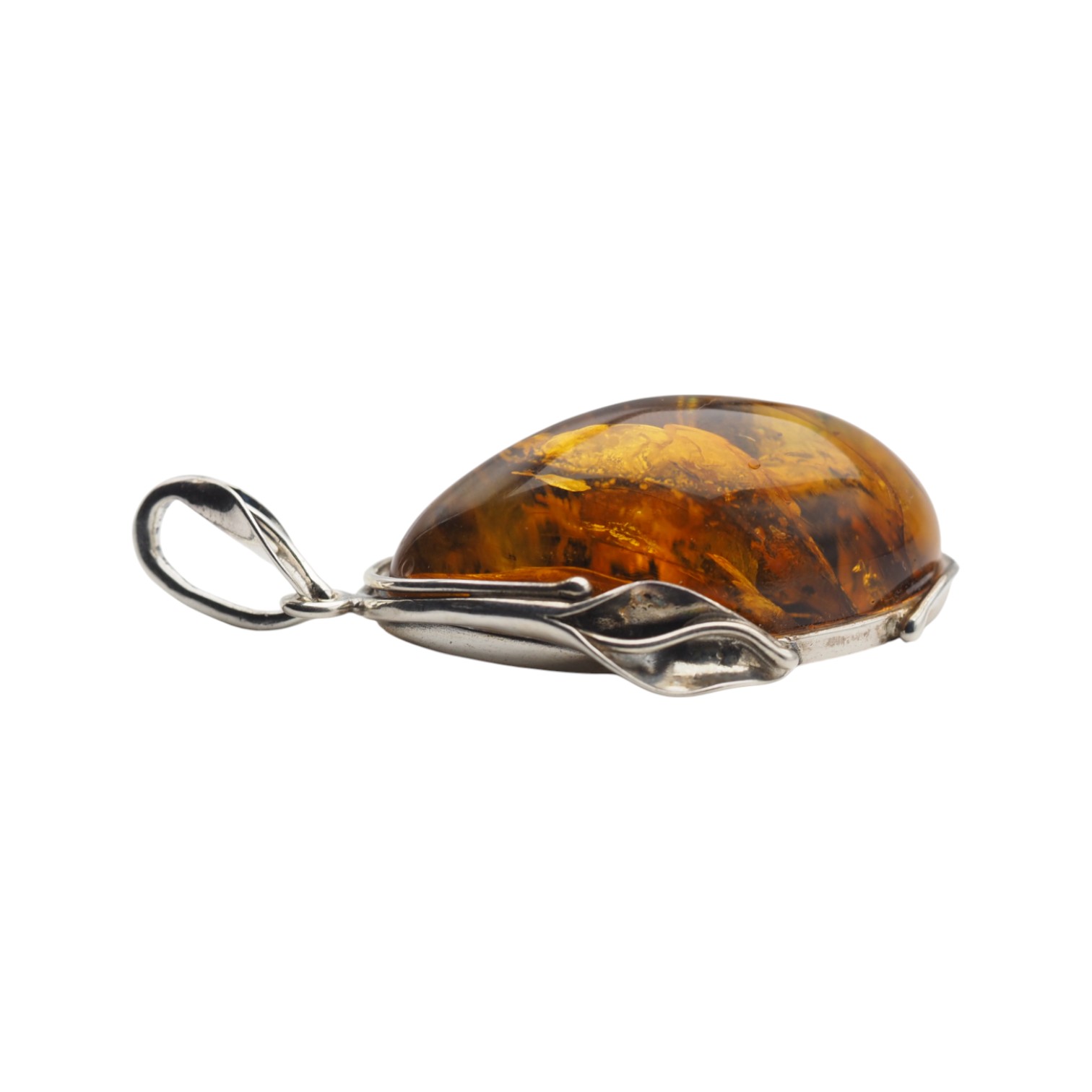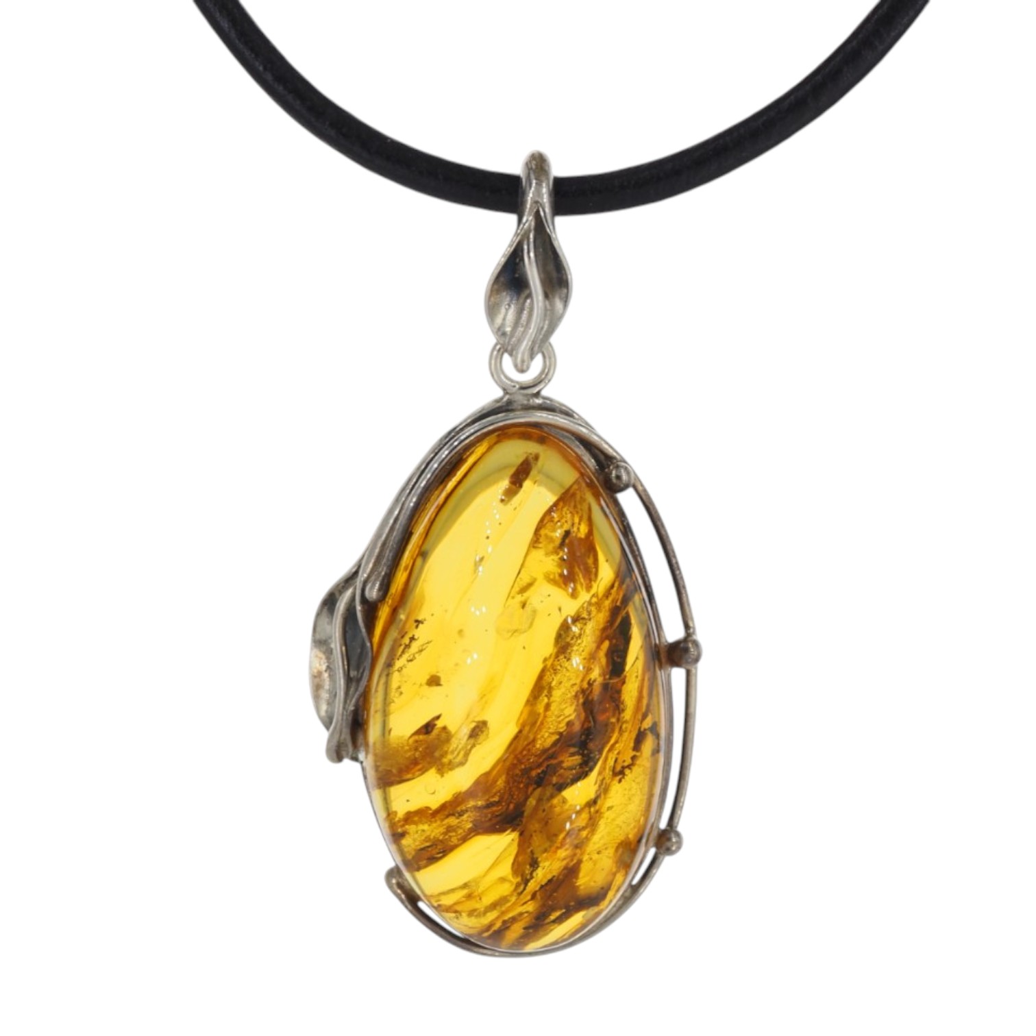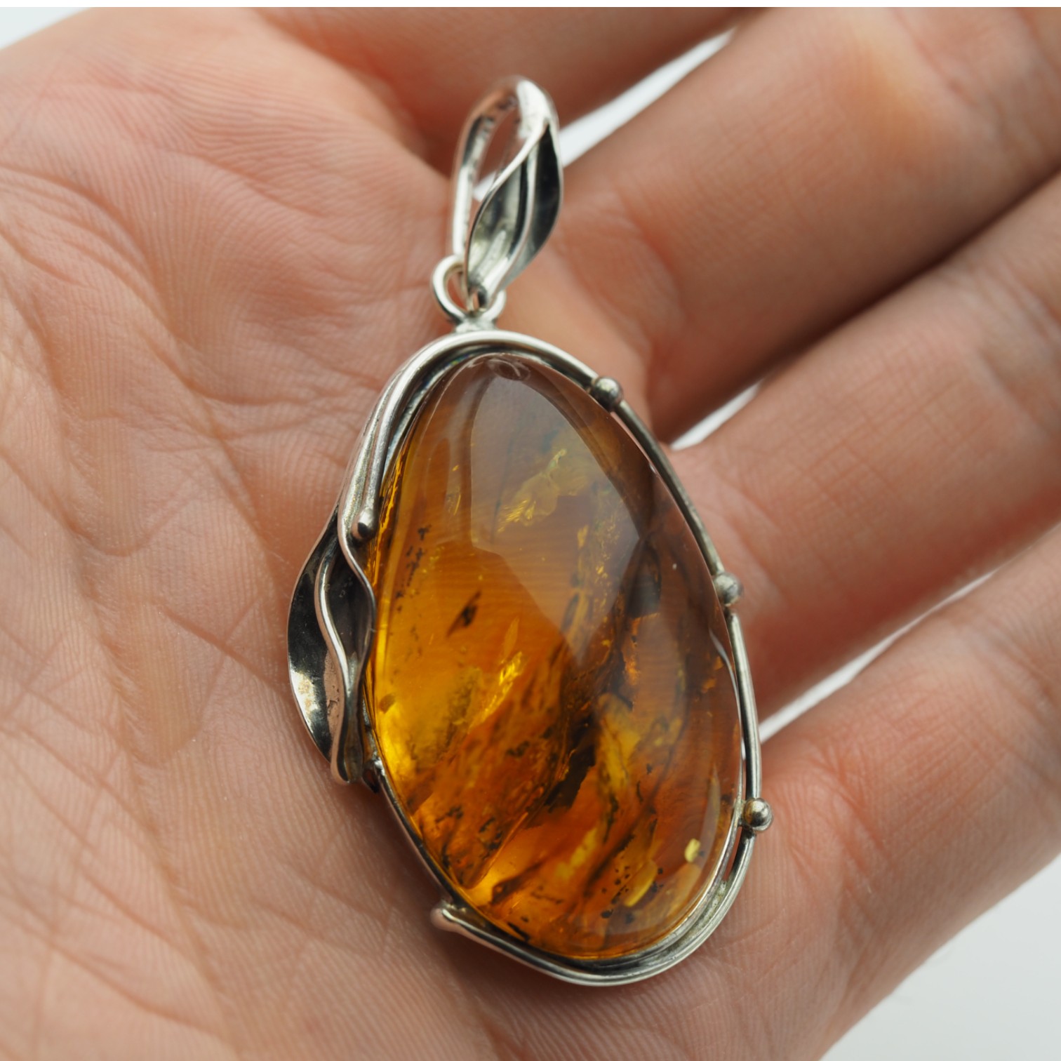 Wyrazista zawieszka z naturalnym bursztynem bałtyckim, oprawiona ręcznie w srebro próby 925.