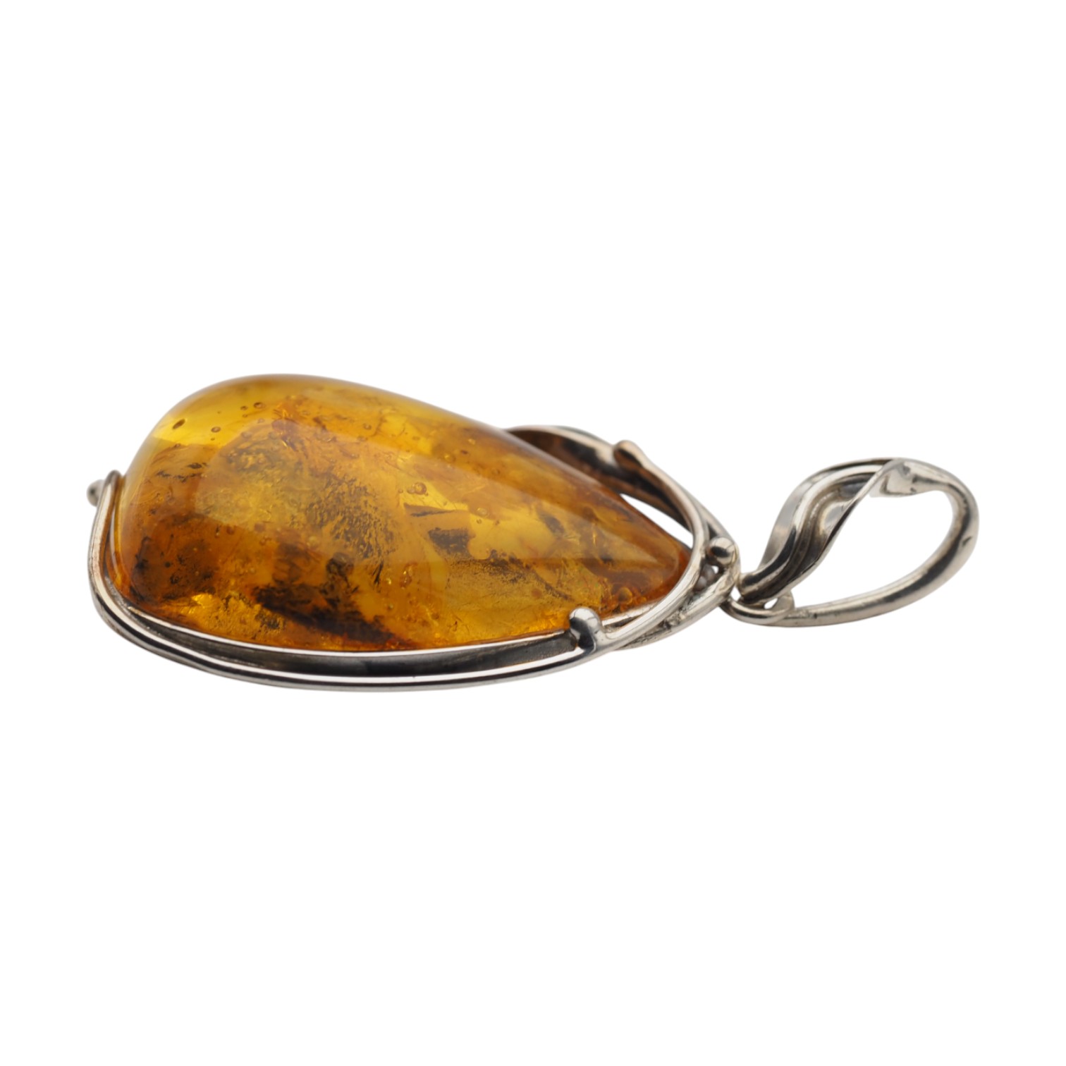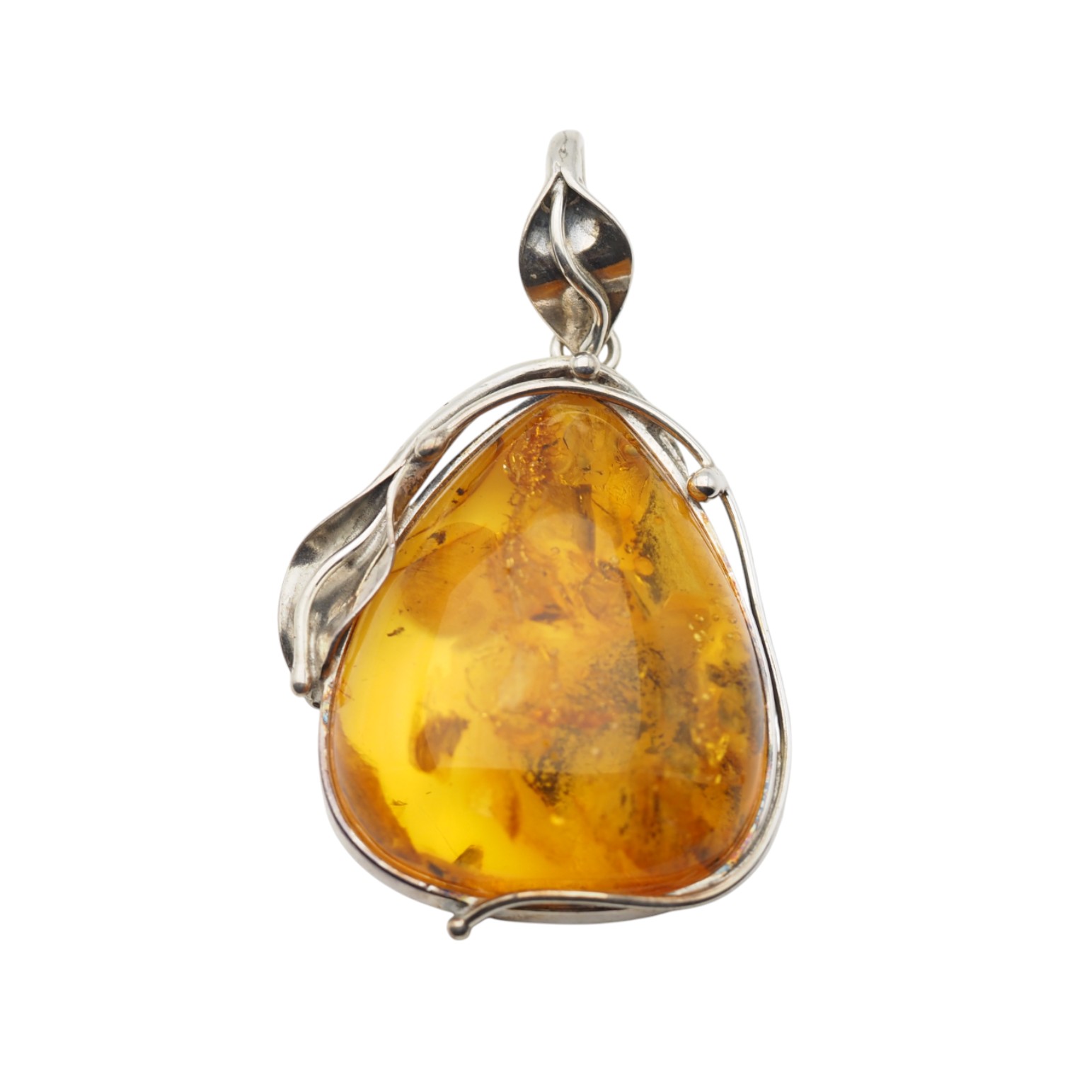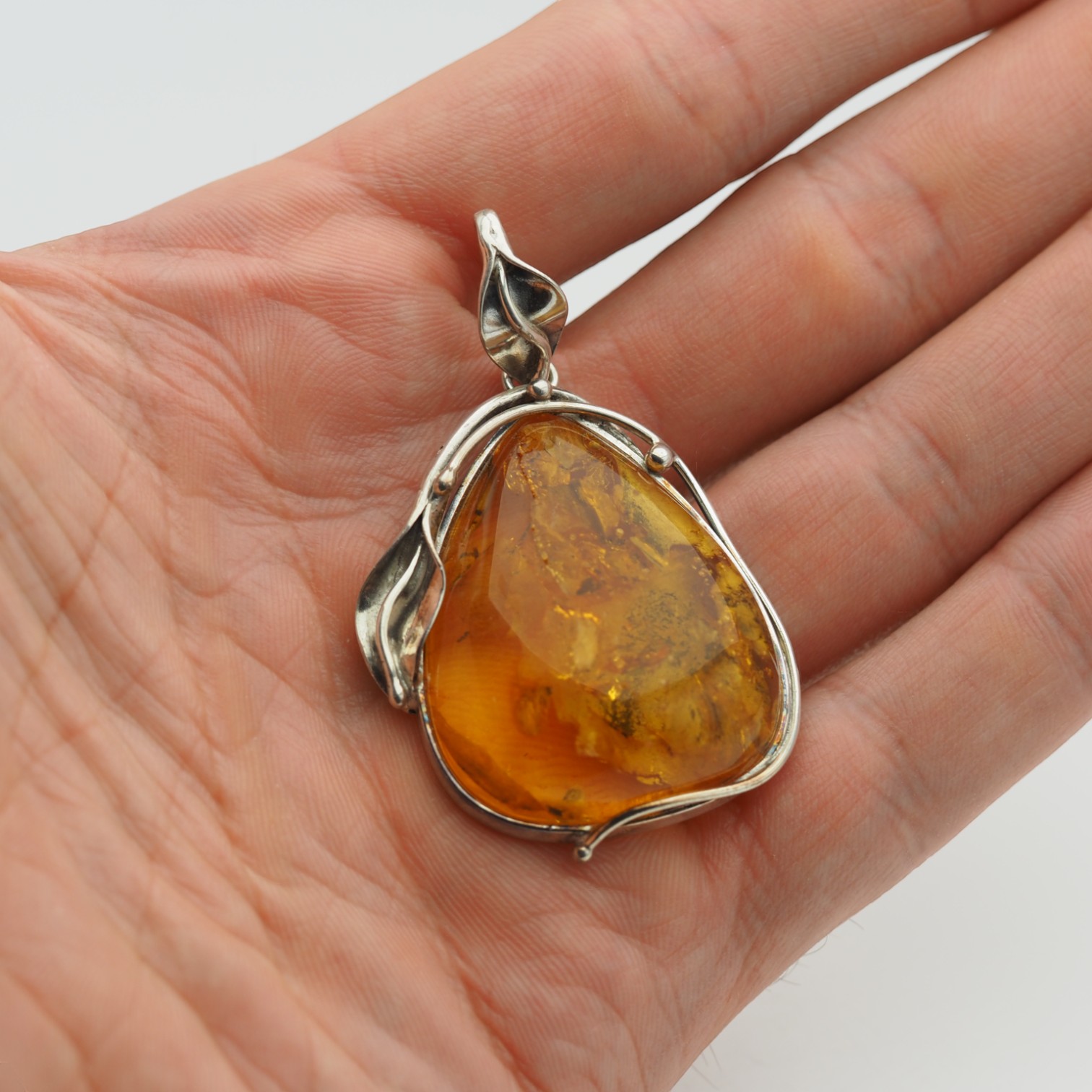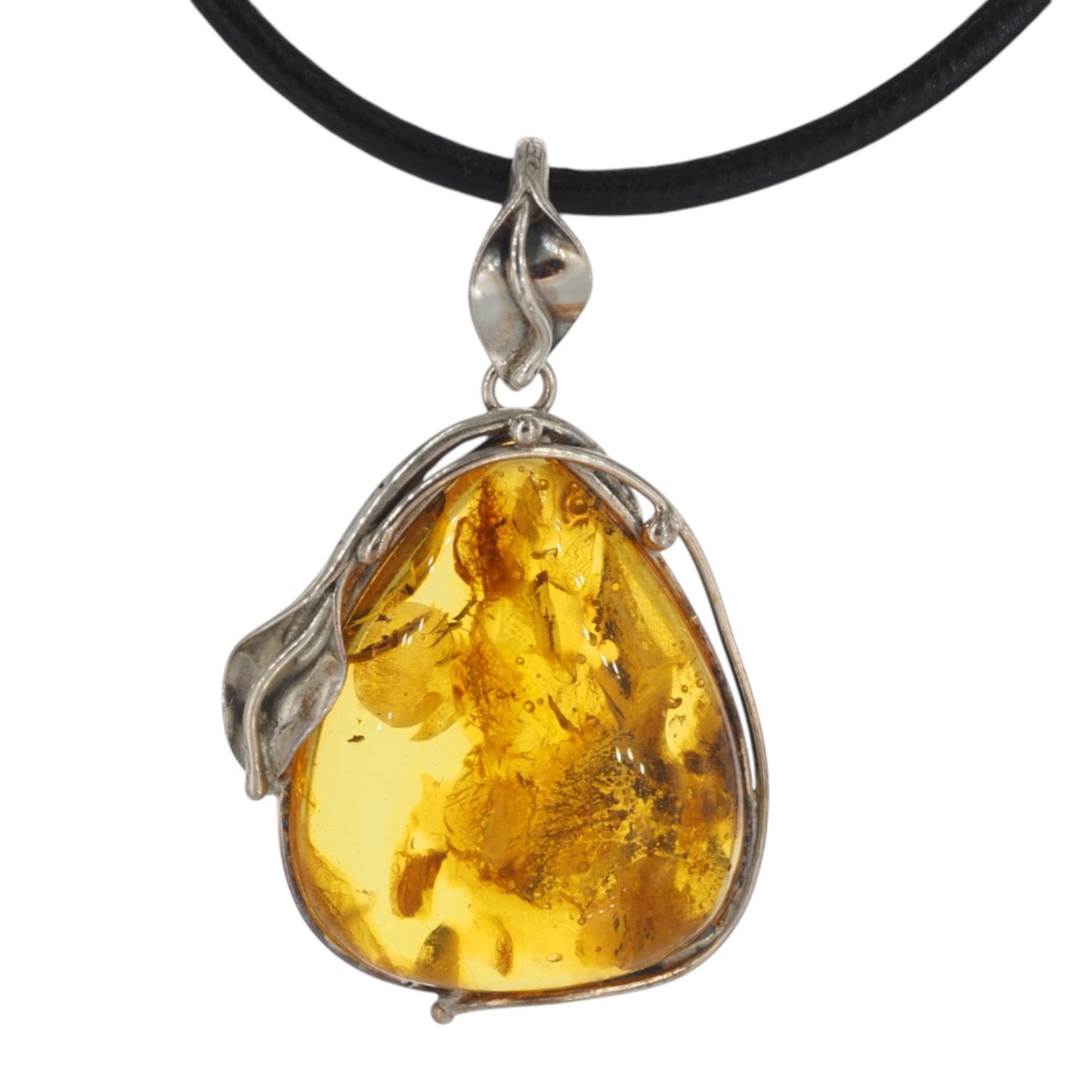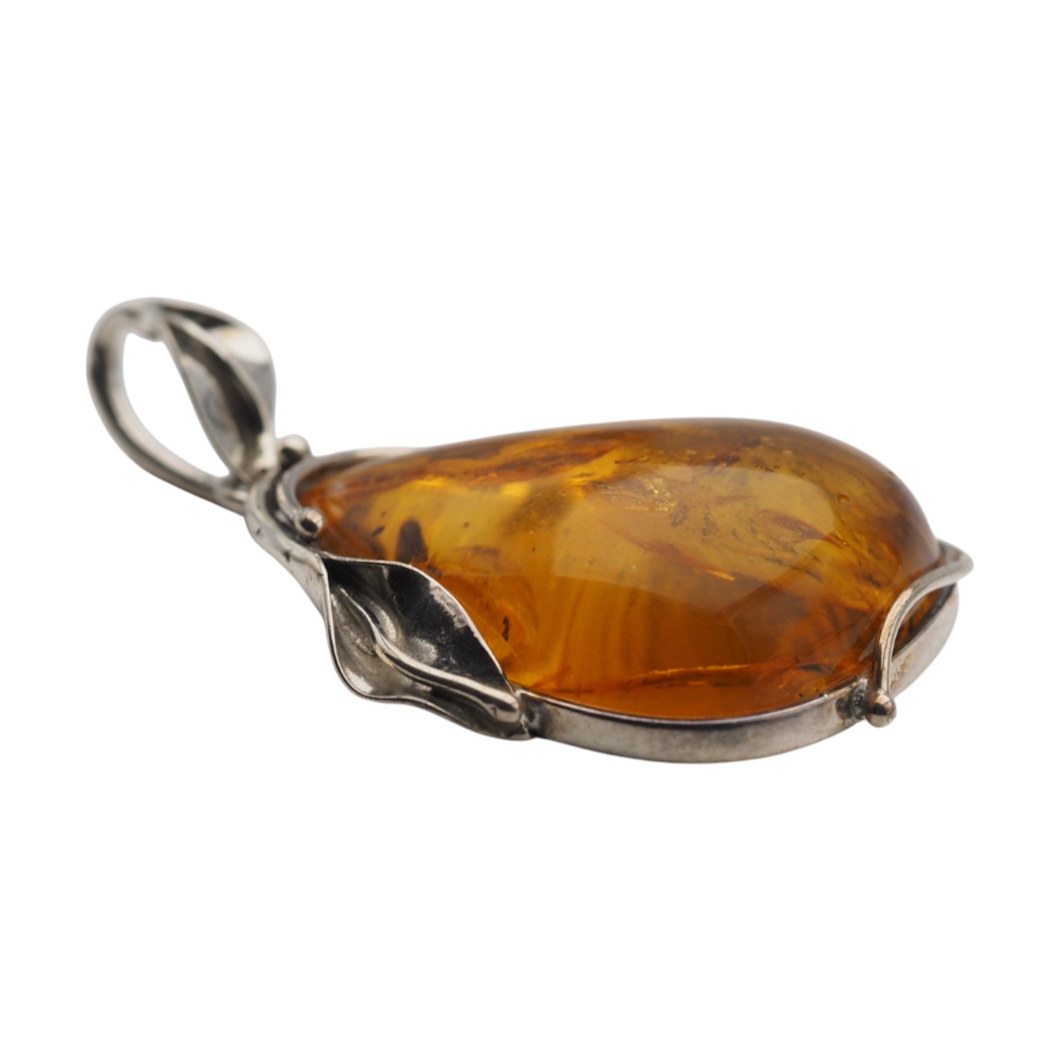 Wyrazista zawieszka z naturalnym bursztynem bałtyckim w formie lekko asymetrycznej kropli. Kamień jest złocisto‑miodowy, częściowo transparentny i pięknie pracuje w świetle, odsłaniając organiczne inkluzje. Całość oprawiono ręcznie w srebro próby 925 z oksydowanym wykończeniem, z roślinnym motywem liści, który podkreśla naturalistyczny charakter biżuterii.