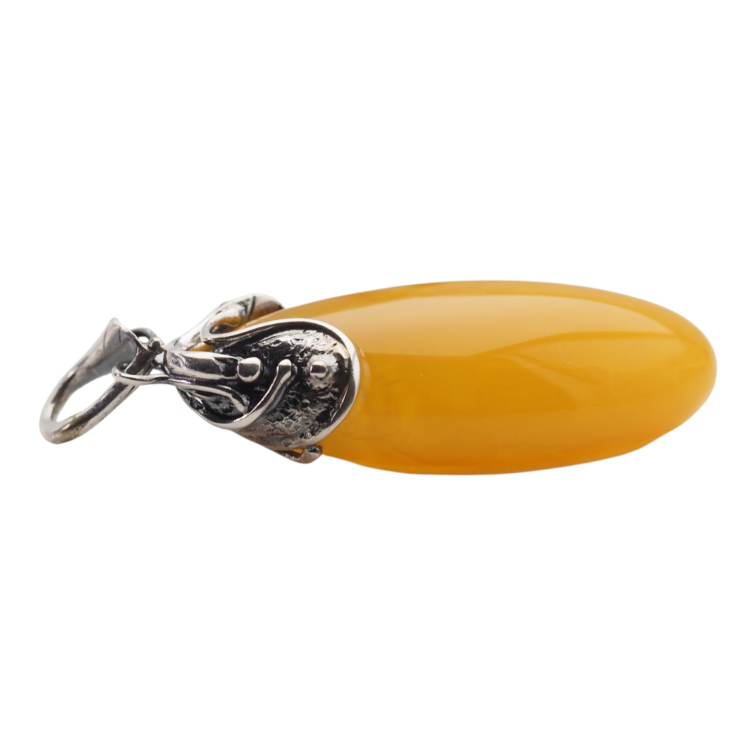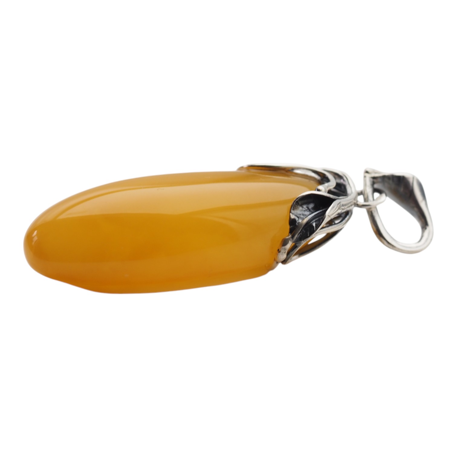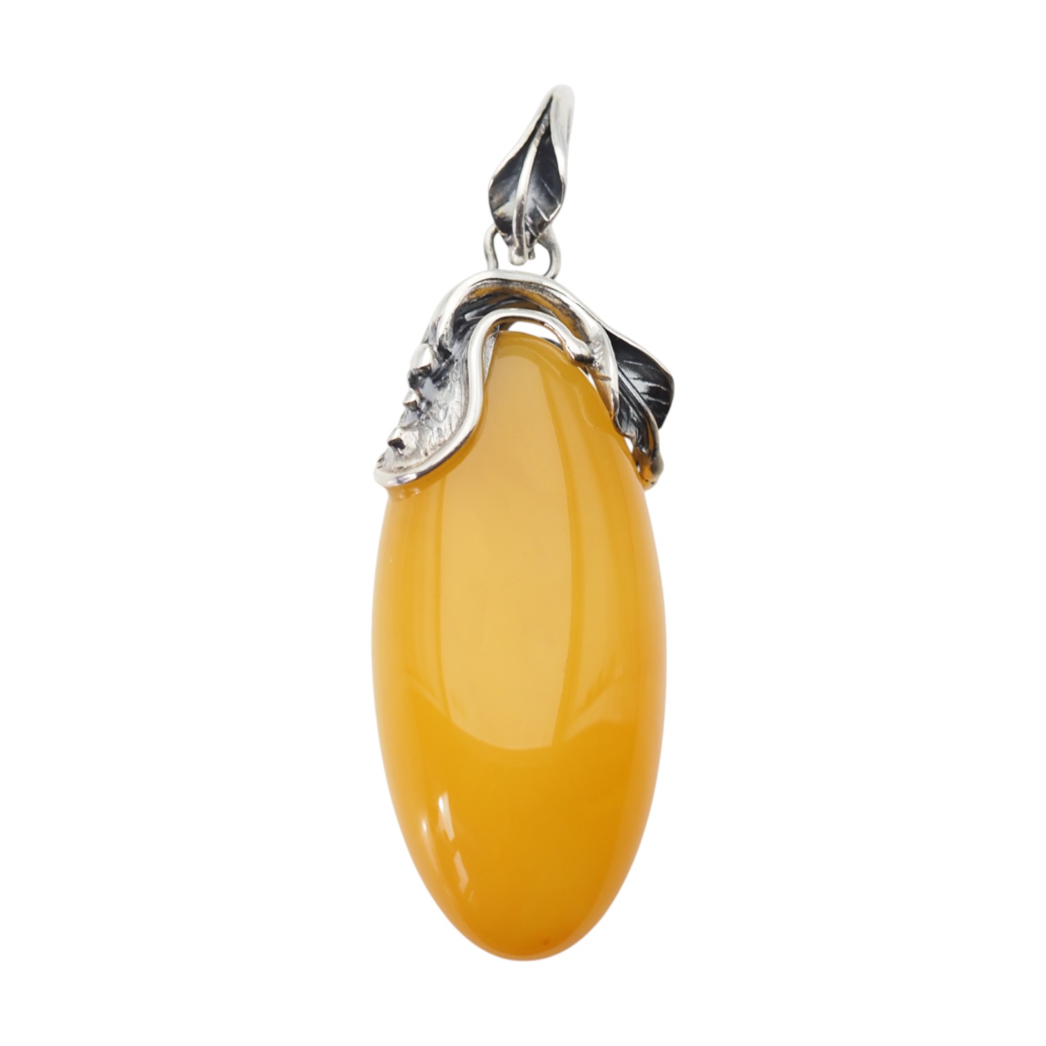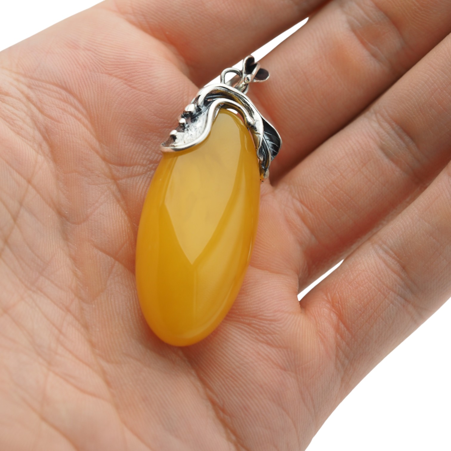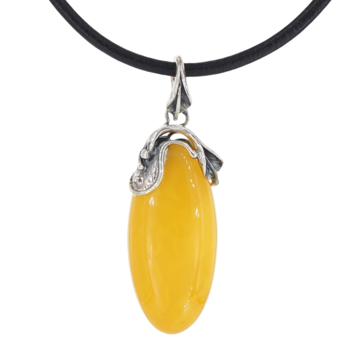 Oprawa została wykonana ręcznie ze srebra próby 925 i ozdobiona motywem liści, które oplatają górną część bursztynu.