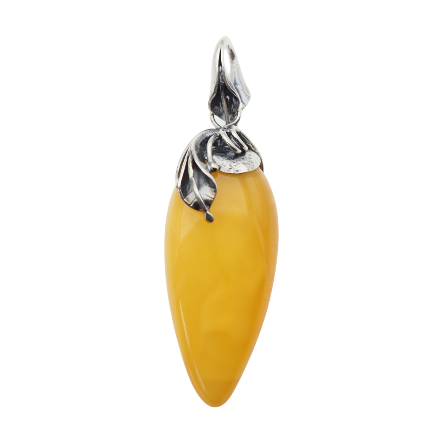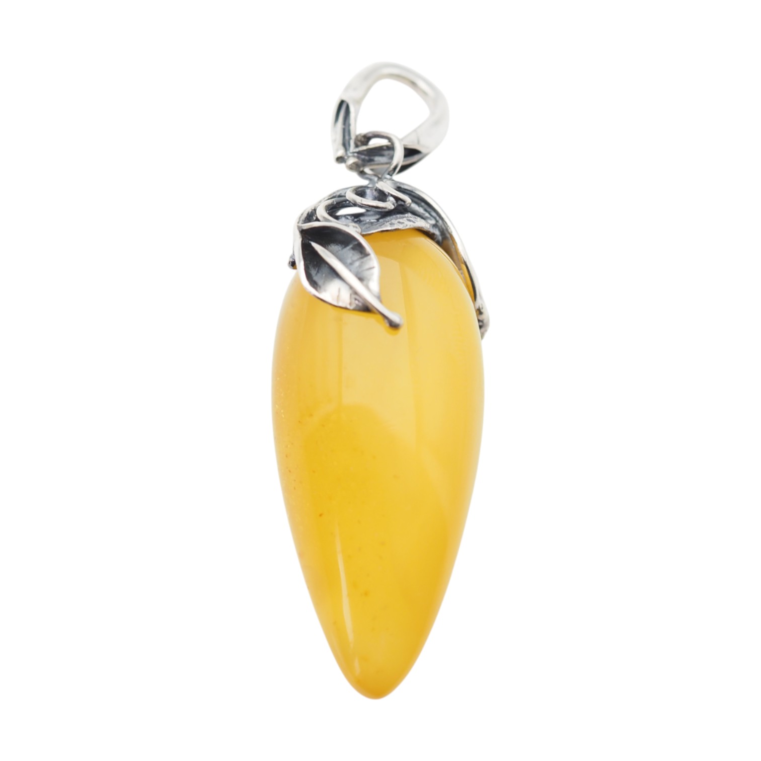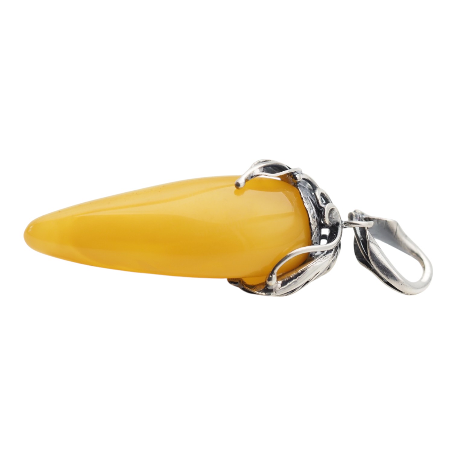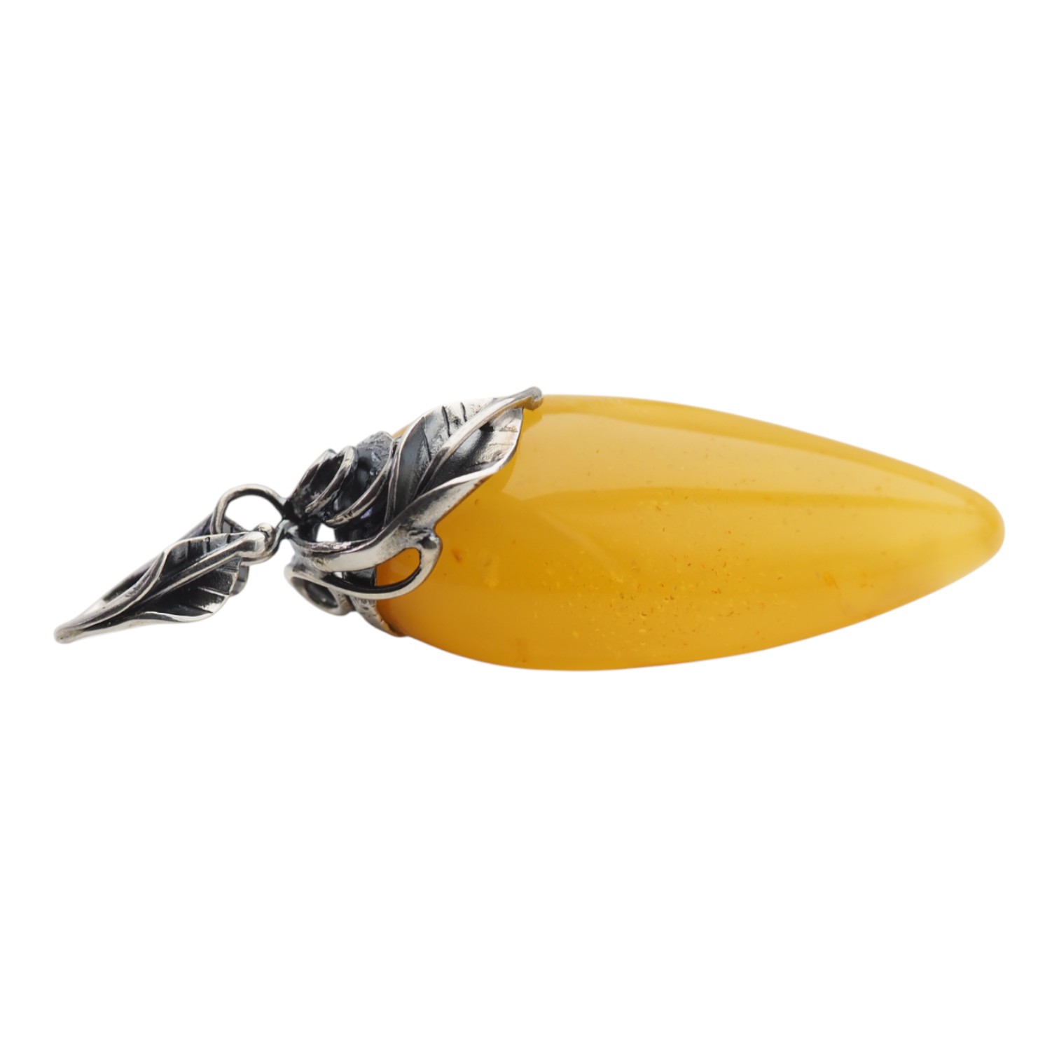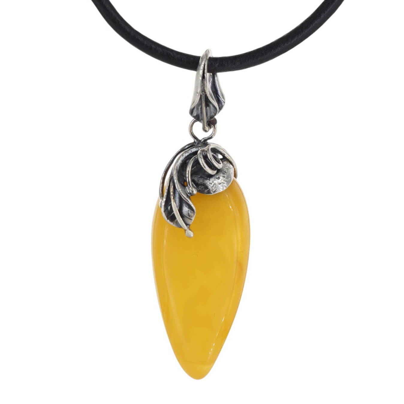 Zawieszka z mlecznym bursztynem bałtyckim zachwyca jednolitą, mleczno‑żółtą barwą z delikatnymi strukturami widocznymi wewnątrz kamienia. Polerowany bursztyn ma wydłużony kształt kropli, a jego górną część obejmuje oksydowana oprawa ze srebra 925 z dekoracyjnym motywem liści, nadając całości organiczny, artystyczny charakter.