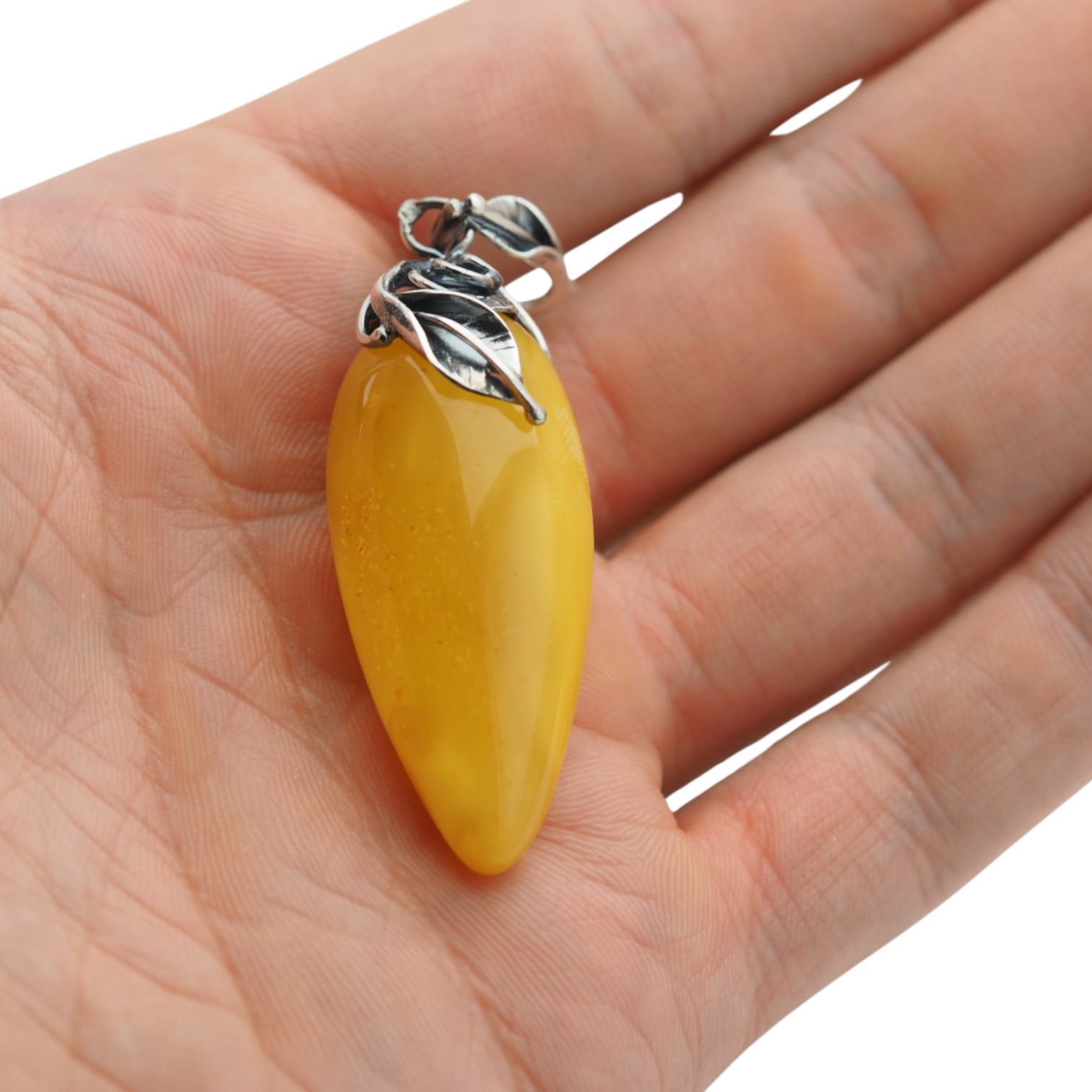 - oprawa: ręcznie formowane srebro 925 z motywem liści (oprawa oplata górną część bursztynu)