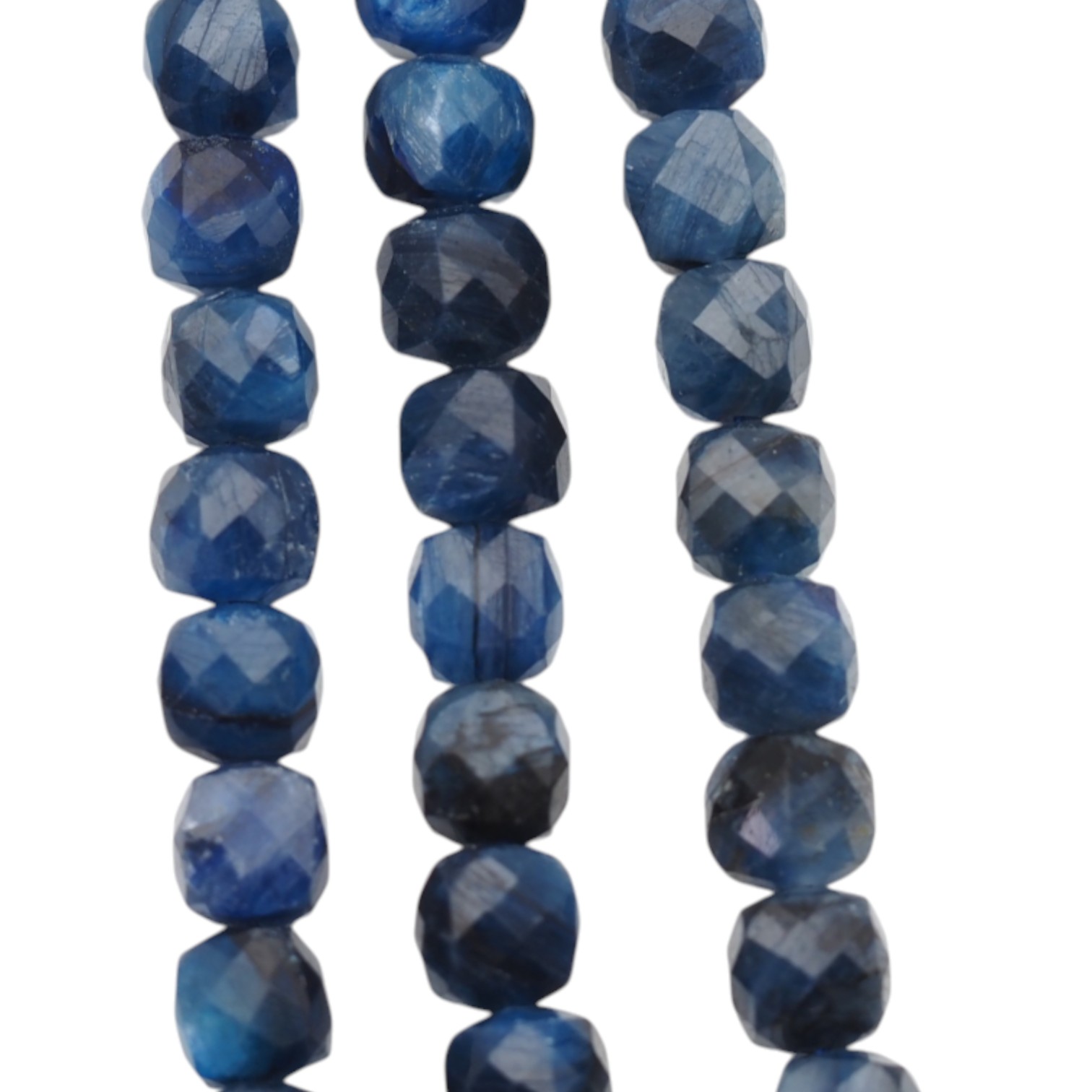 Kyanit fasetowany w formie regularnej kostki to kamień o eleganckim, jubilerskim blasku, który pięknie łapie światło dzięki szlifowi. Geometryczna forma daje równy rytm na sznurze i sprawia, że kompozycje wyglądają nowocześnie oraz czysto.