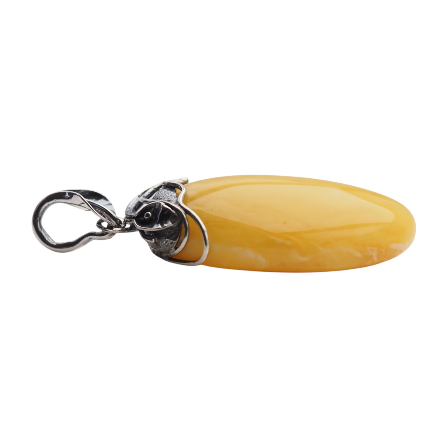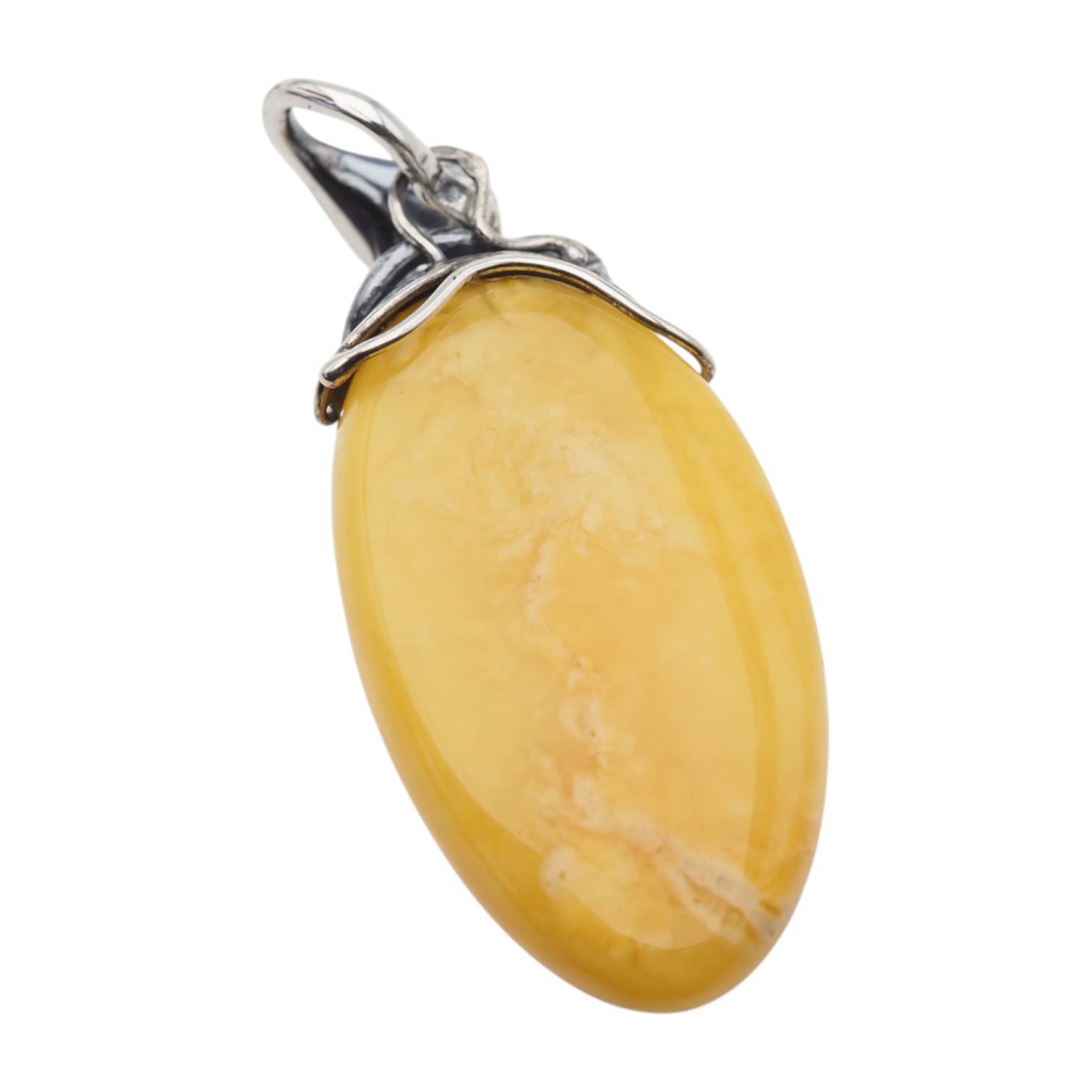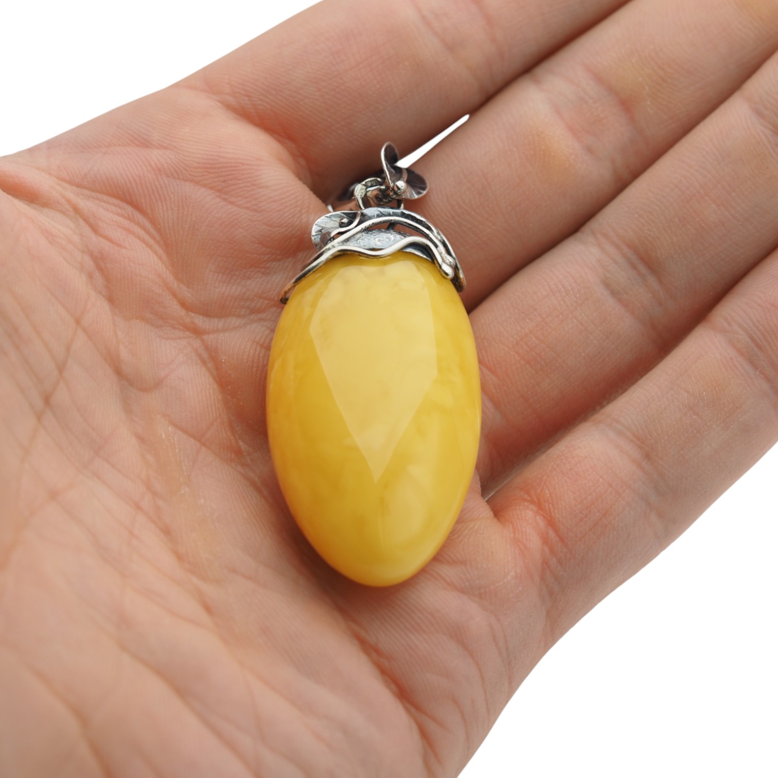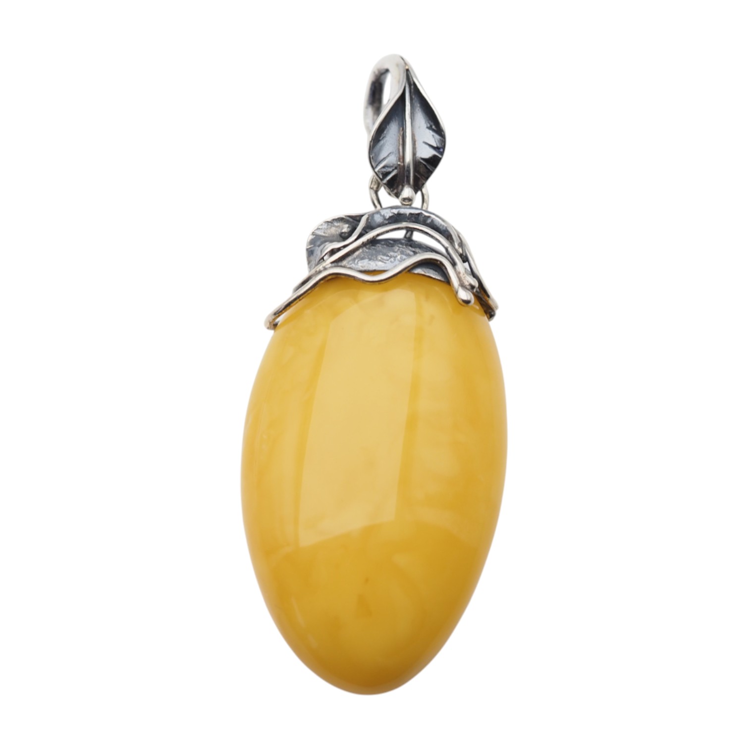 Zawieszka z mlecznym bursztynem bałtyckim przyciąga uwagę delikatną, jasnożółtą barwą w odcieniu mleczno-miodowym oraz naturalnymi smugami i organiczną strukturą widoczną pod światło. Gładko polerowany kamień ma formę pełnej, lekko wydłużonej kropli, a całość dopełnia ręcznie formowana oprawa z oksydowanego srebra 925 inspirowana motywem liści.