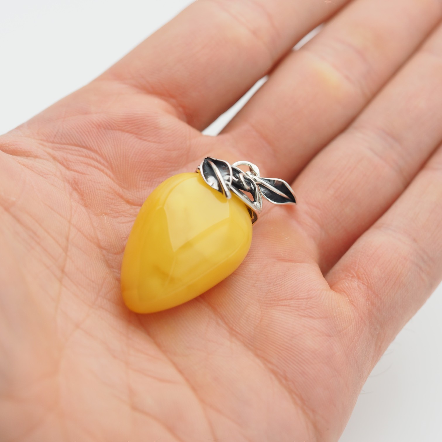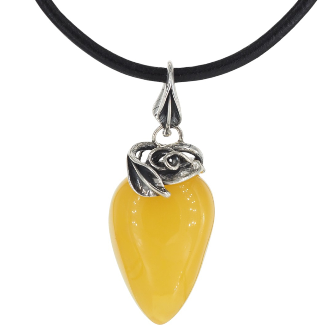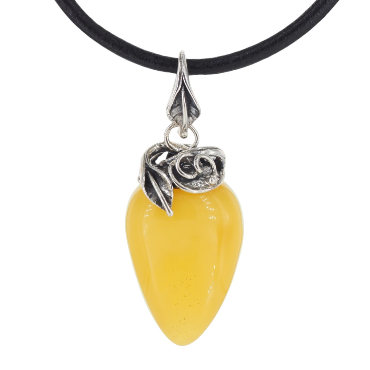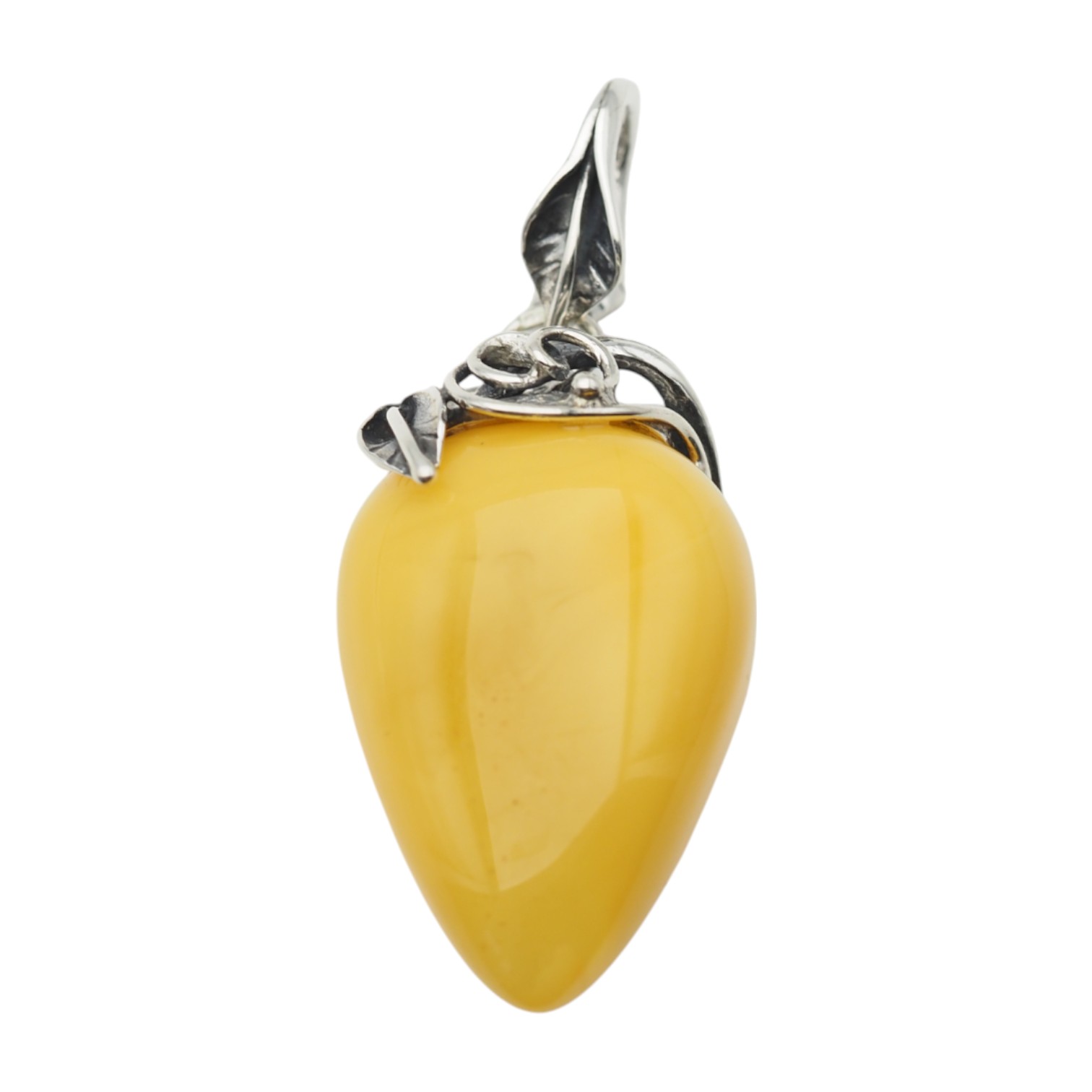 Wyrazista zawieszka z naturalnym bursztynem bałtyckim w odmianie mlecznej. Polerowany kamień ma pełny, lekko opływowy kształt kojarzący się z kroplą lub owocem, a w jego wnętrzu widać subtelne smugi i organiczne, mleczne warstwy żywicy. Kolor jest ciepły, żółto–kremowy, z delikatnym, matowo-połyskującym efektem; pod światło bursztyn staje się częściowo transparentny i odsłania wewnętrzną strukturę.