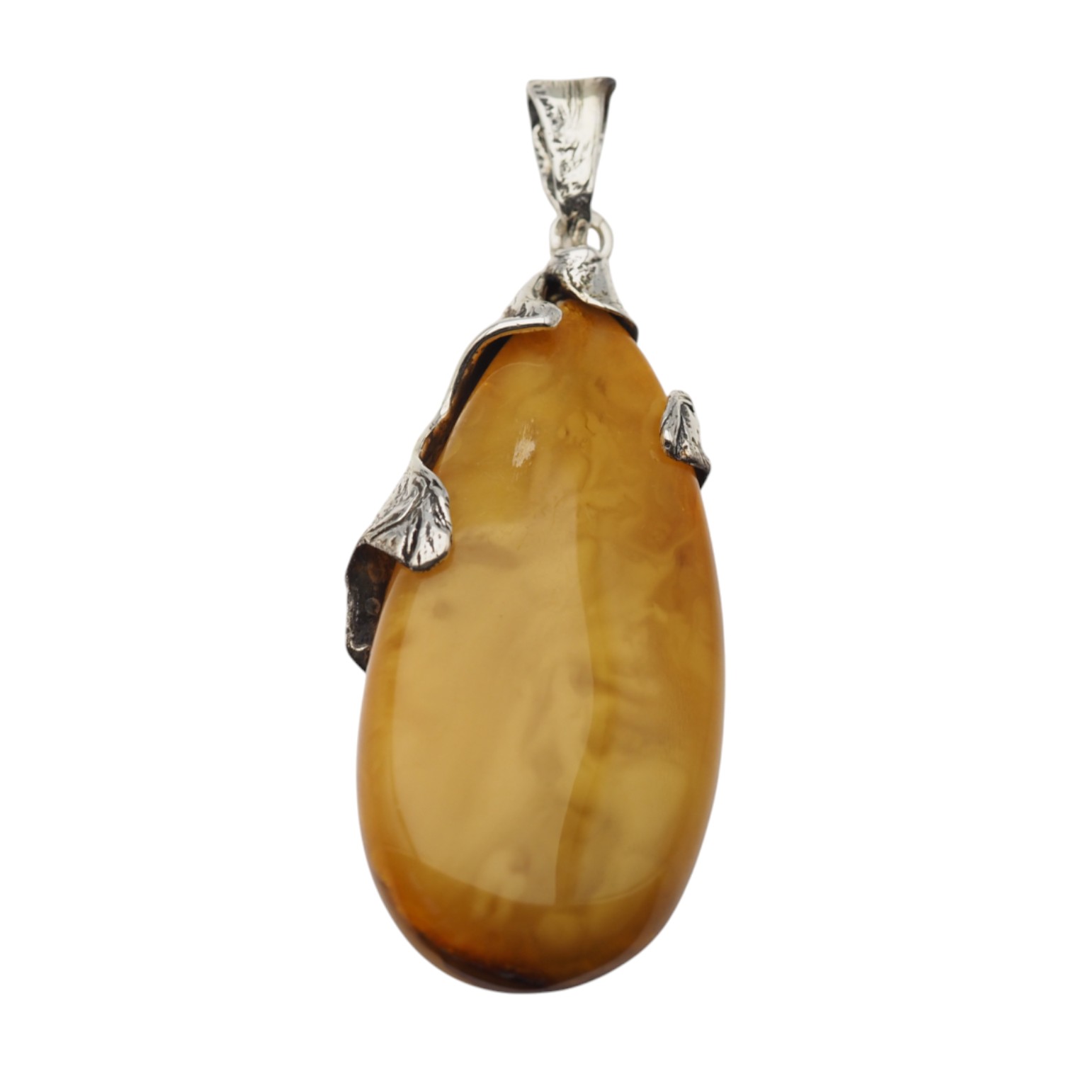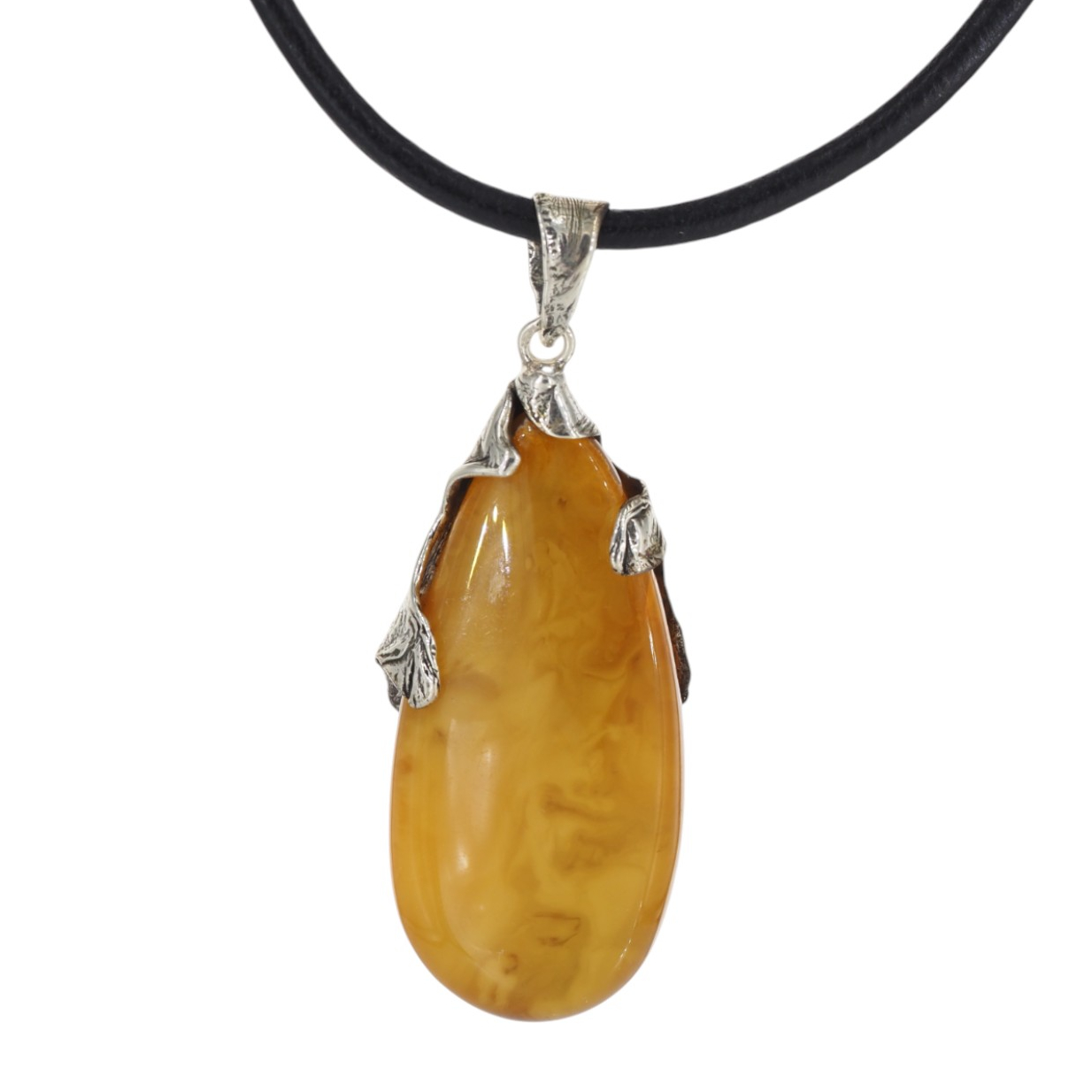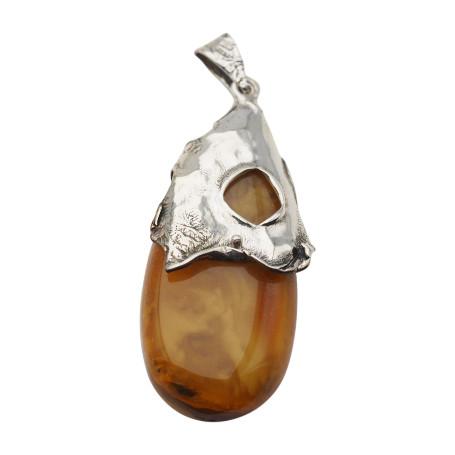 Zawieszka z naturalnym bursztynem bałtyckim przyciąga wzrok ciepłym, miodowo–karmelowym kolorem i organicznym rysunkiem wnętrza. Kamień jest polerowany, a w jego strukturze widać delikatne smugi i naturalne „zawirowania”, charakterystyczne dla bursztynu. Całość dopełnia ręcznie wykonana oprawa ze srebra oksydowanego próby 925, inspirowana motywem liści i fakturą kory.