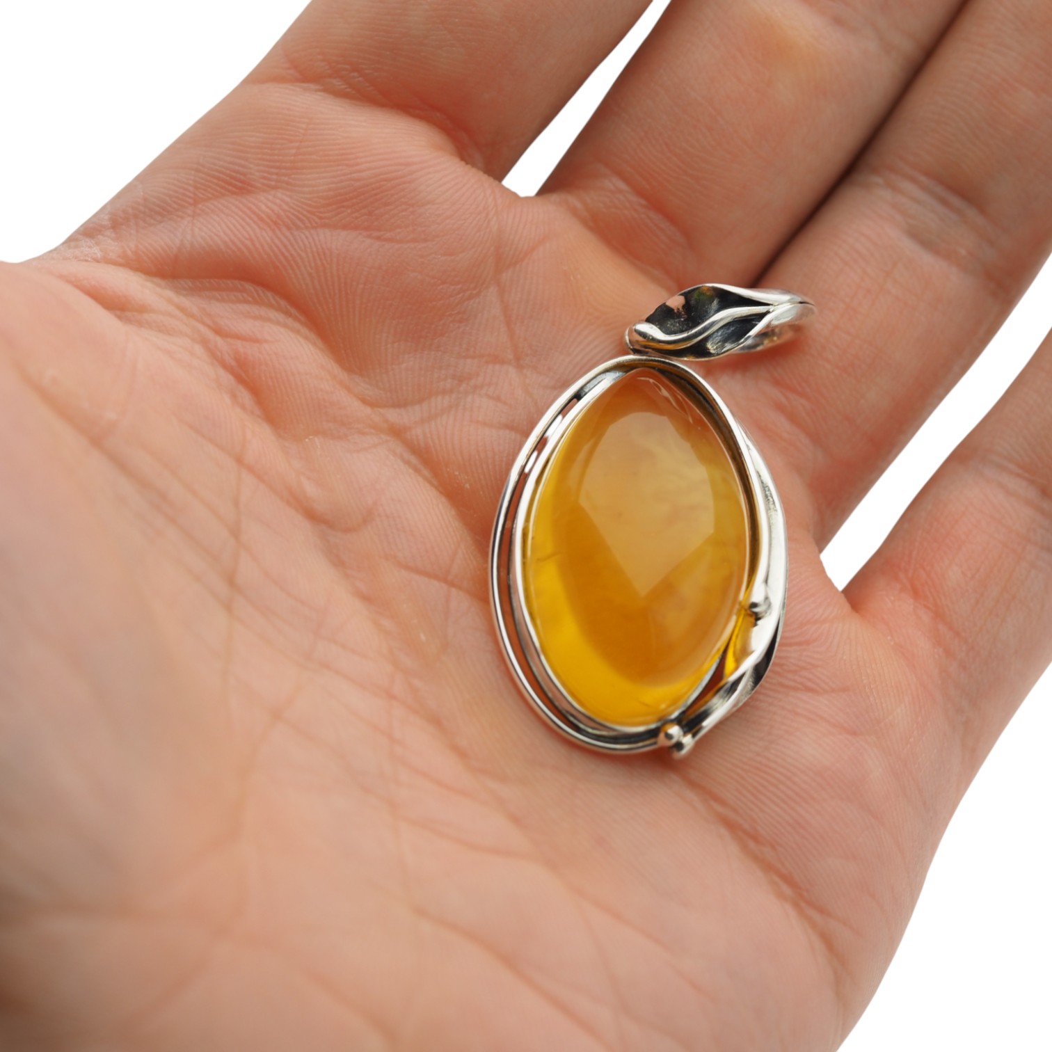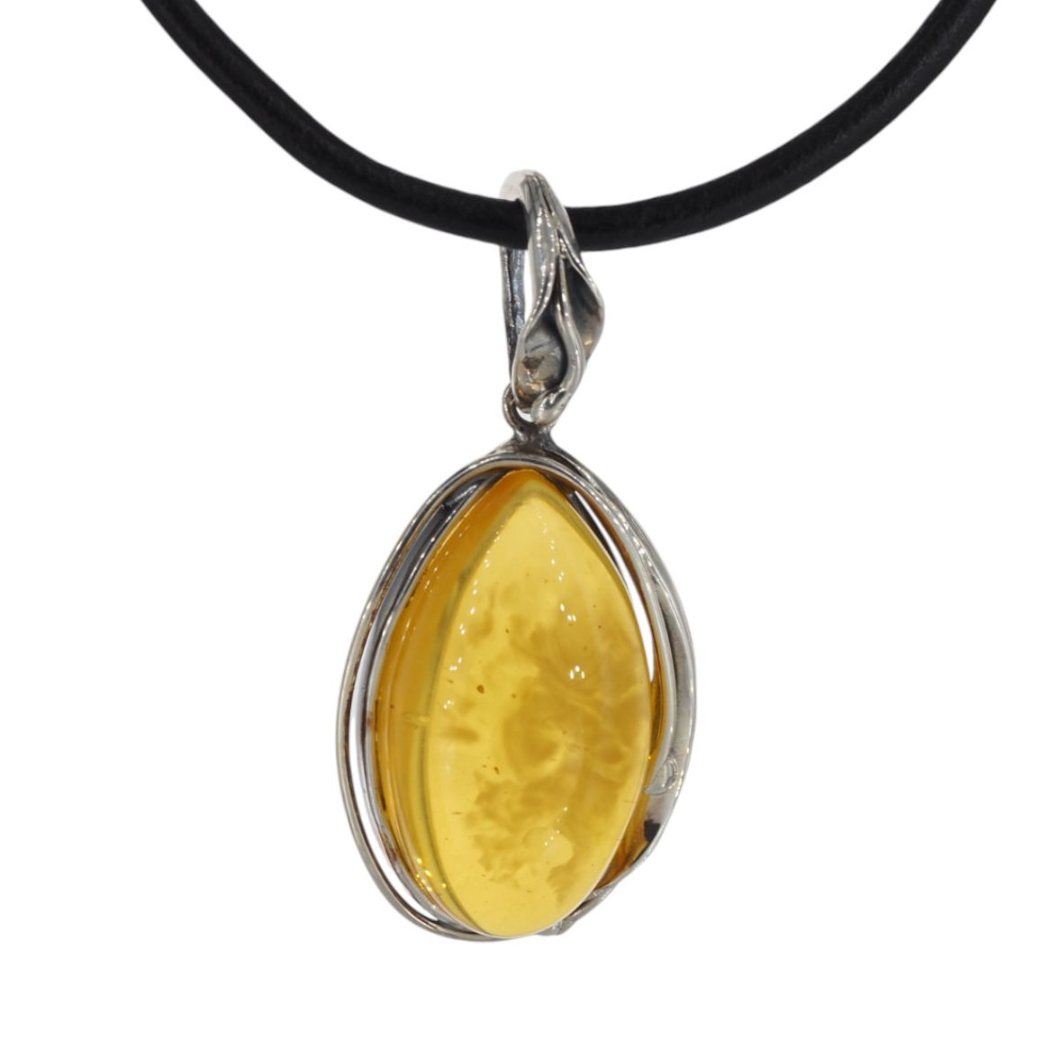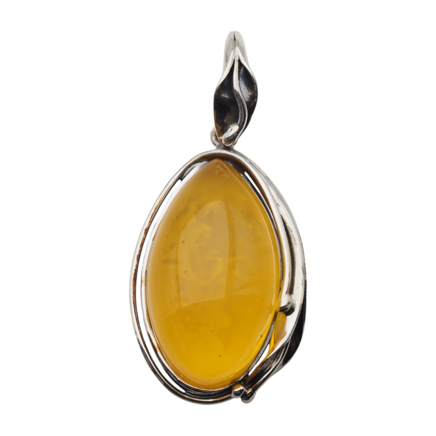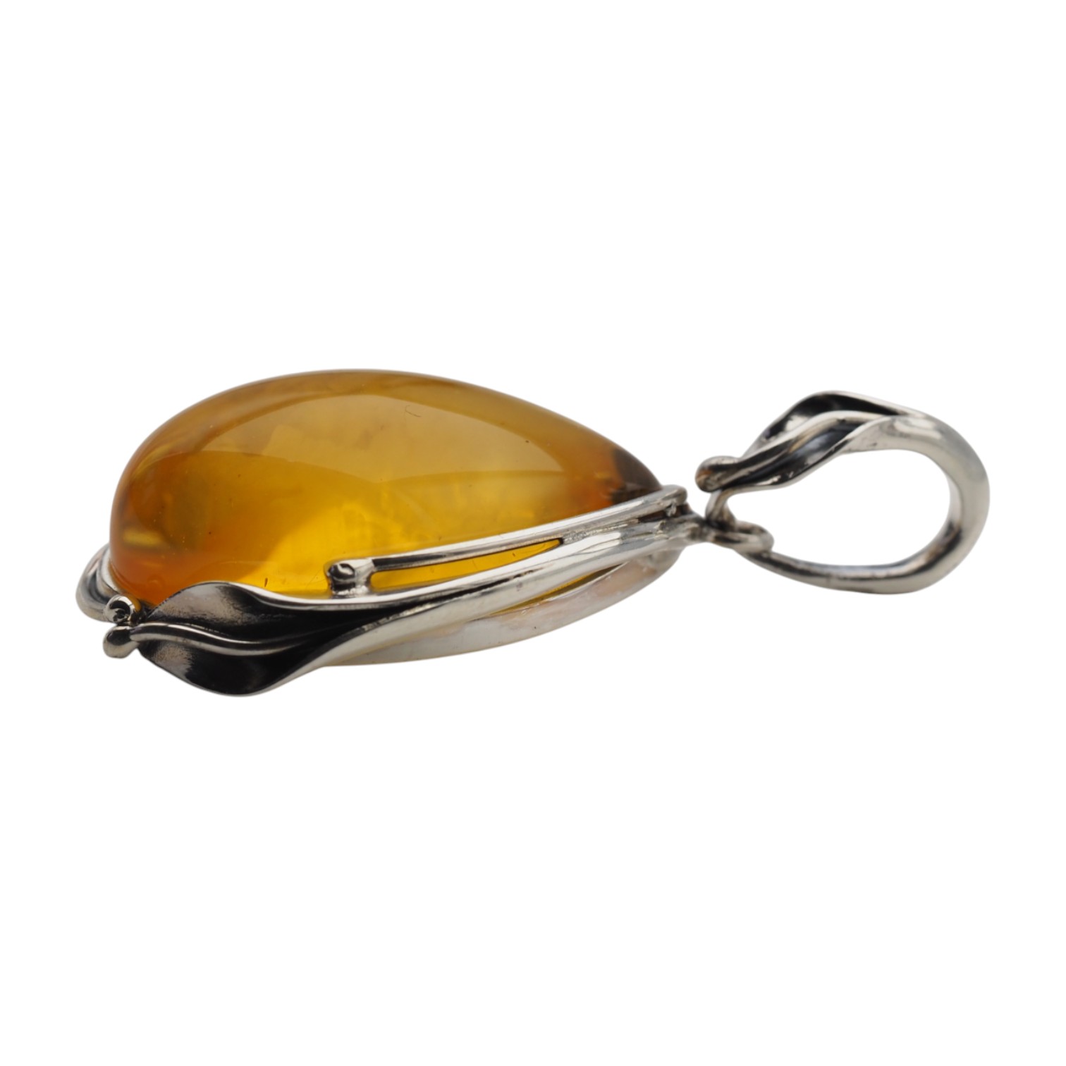 Kształt bursztynu przypomina łezkę/owal. Oprawa srebrna, oksydowana, inspirowana motywem liści – podkreśla organiczny styl i szlachetność kamienia.